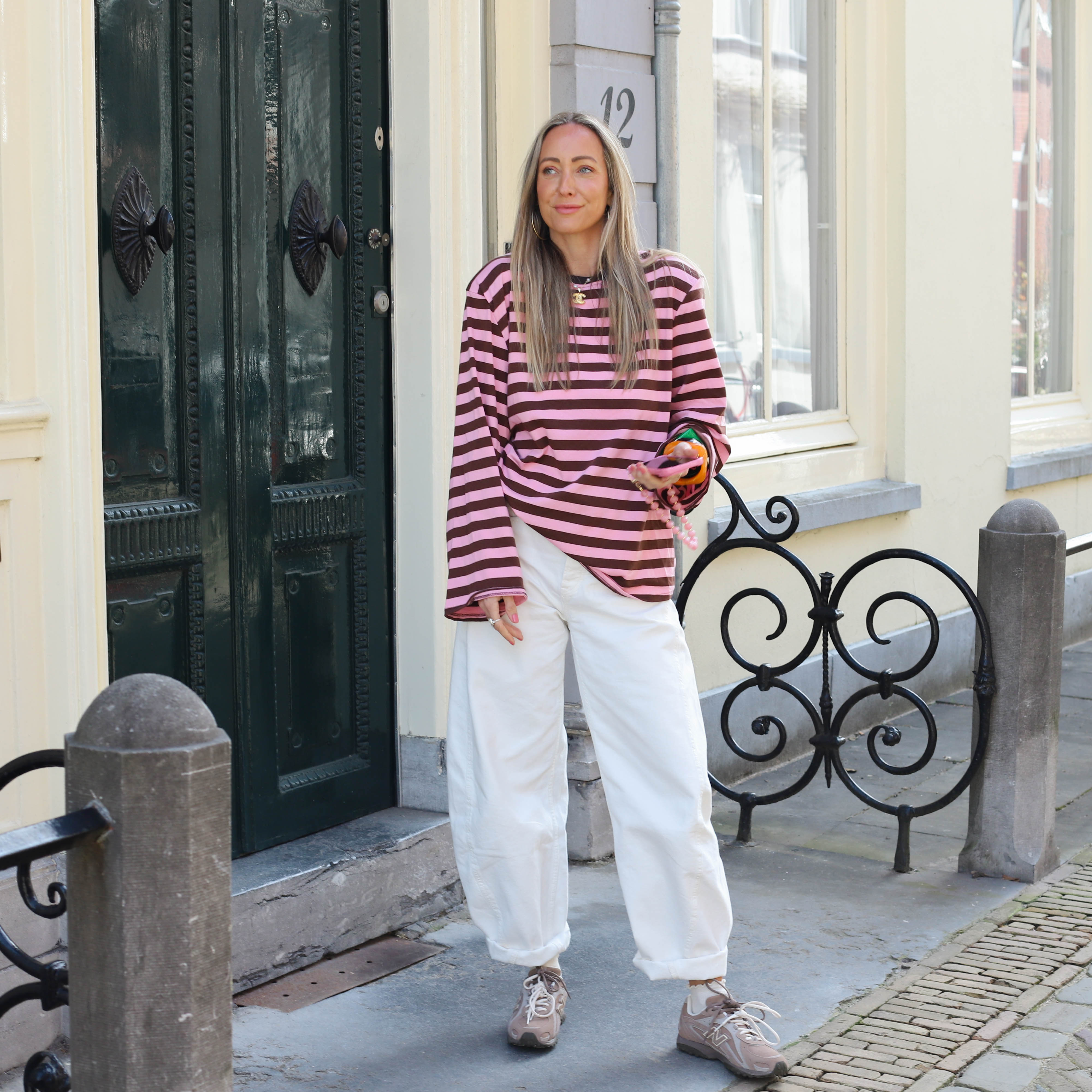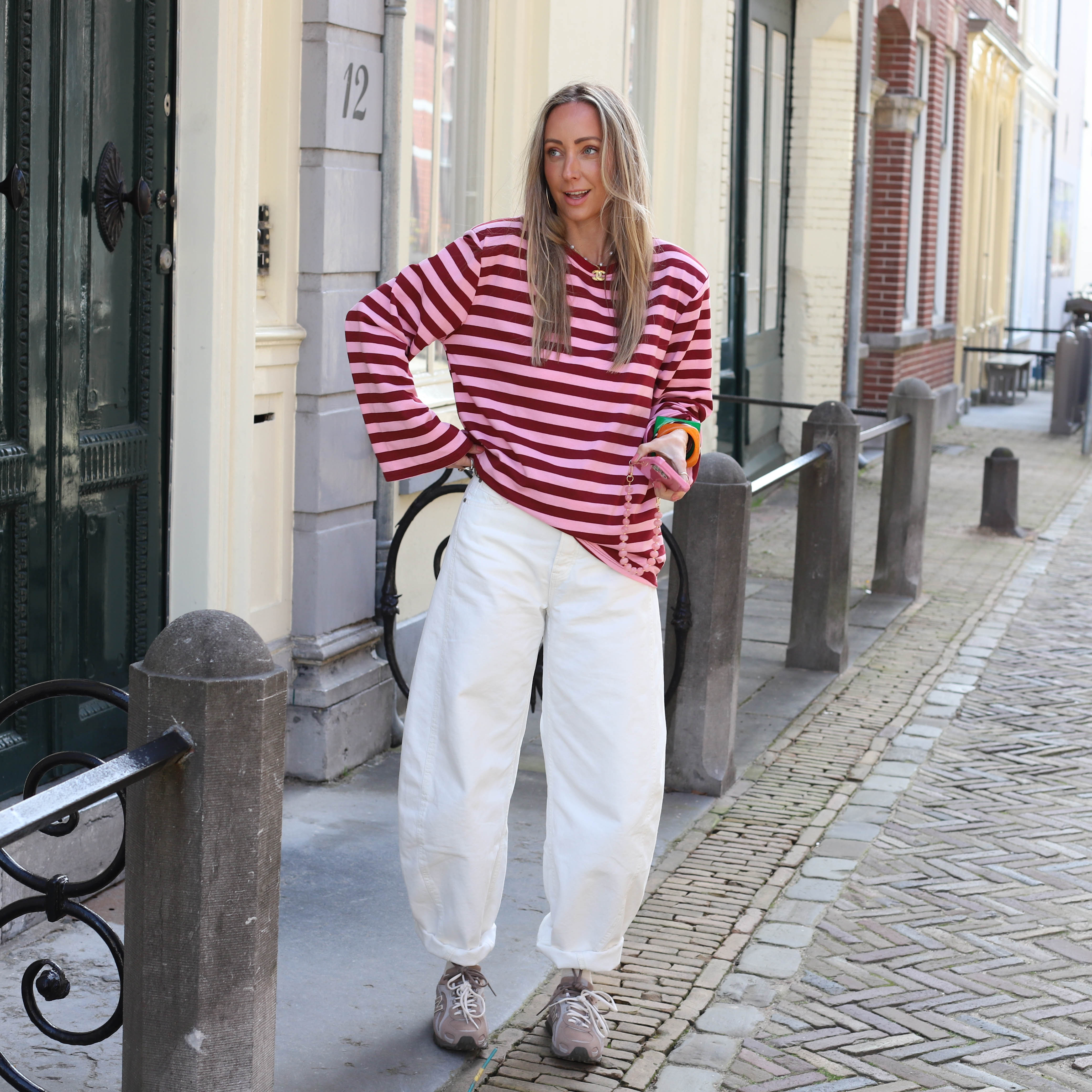 Oversized streep sweater geel roze