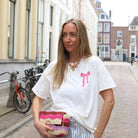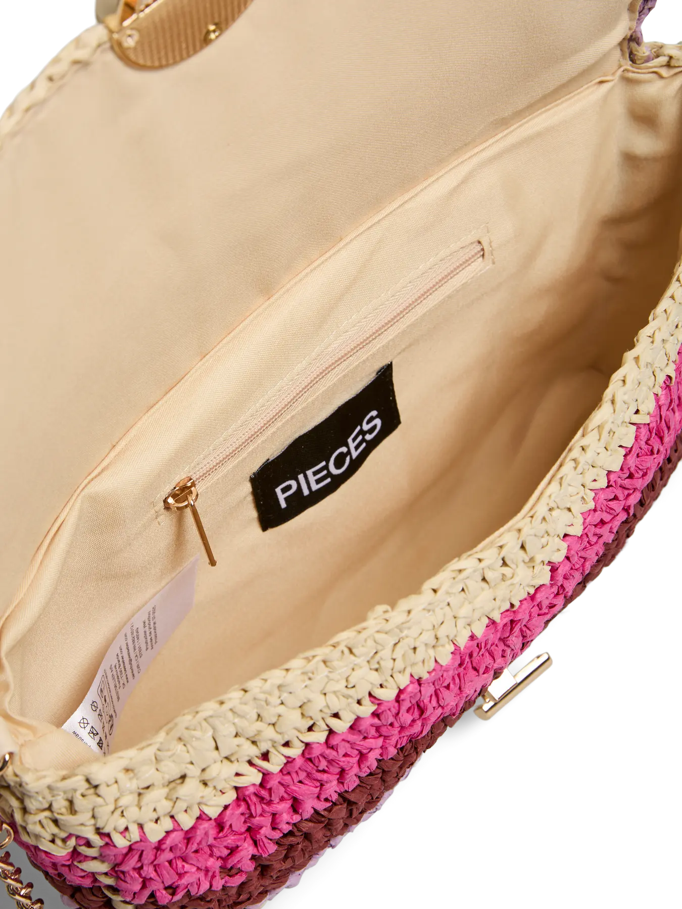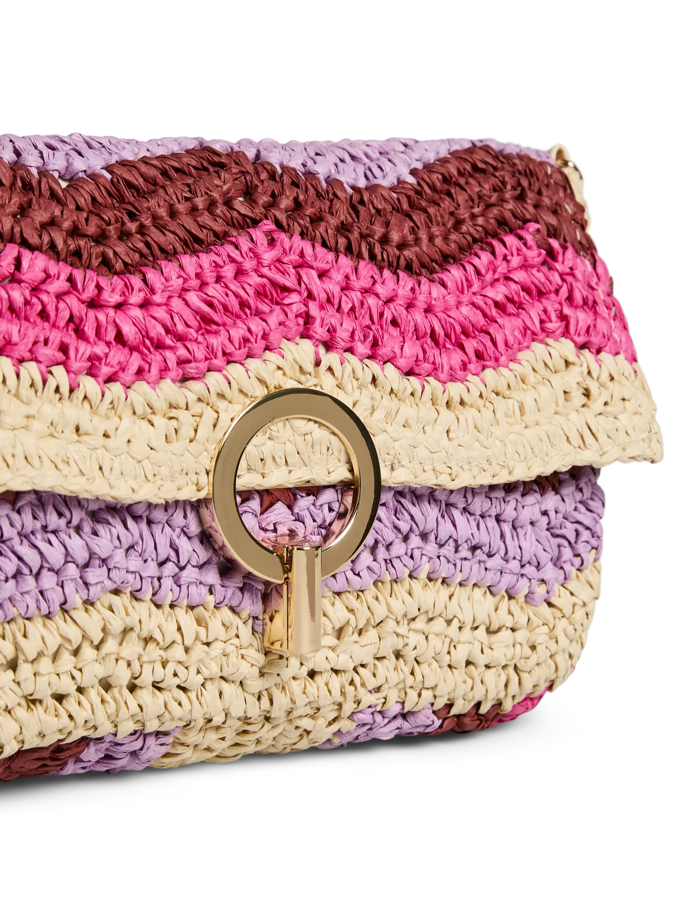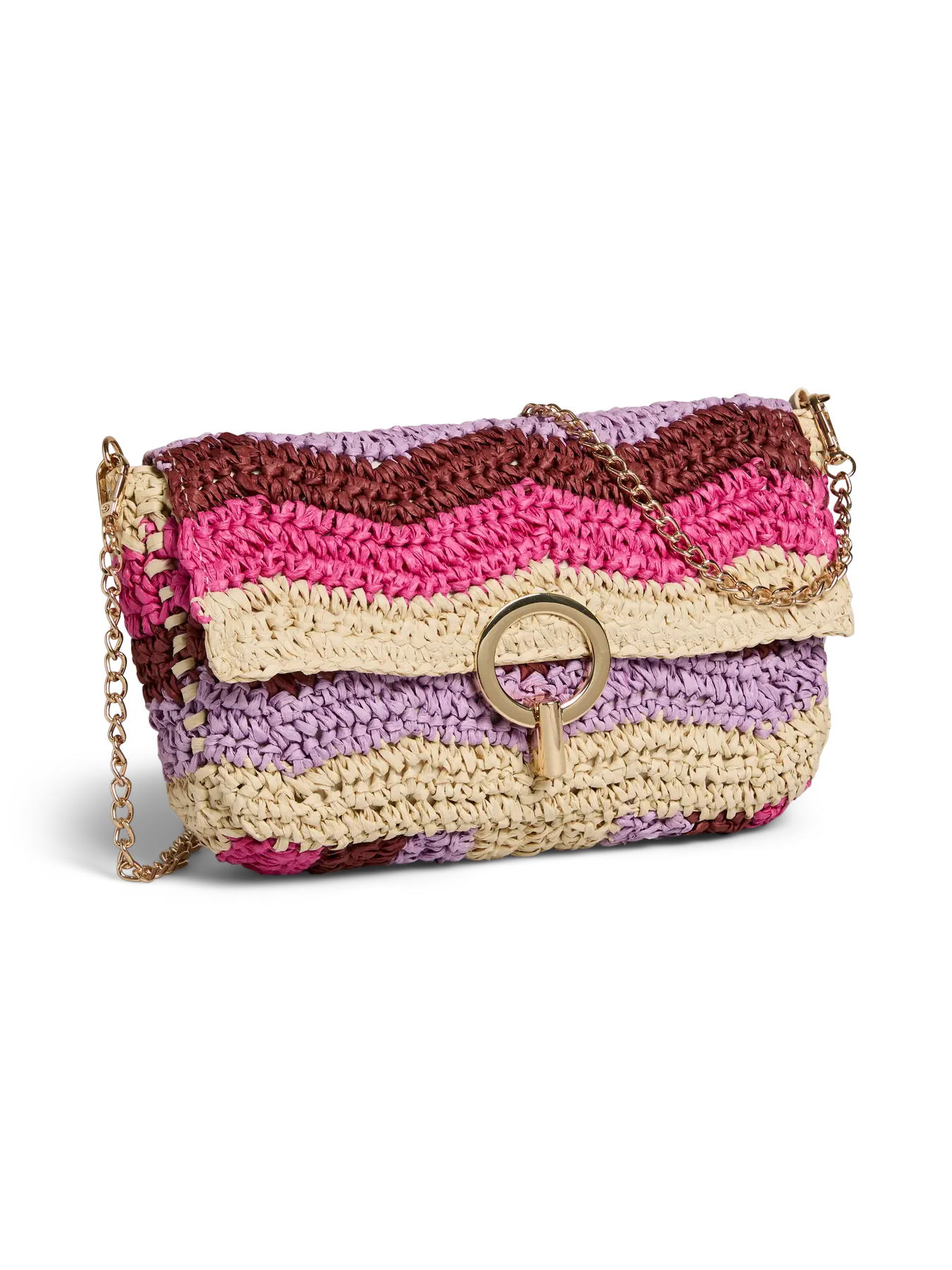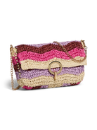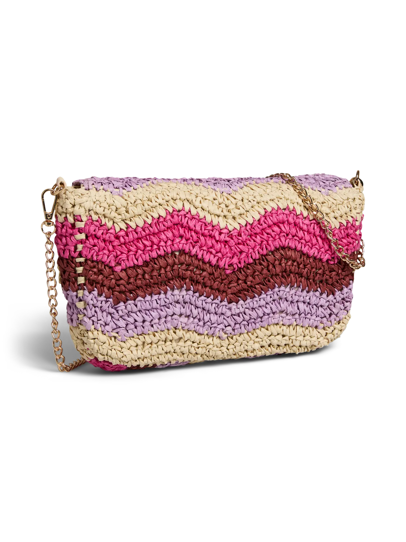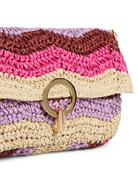 Speelse en opvallende schoudertas in zomerse fuchsiatinten. De tas heeft een geweven look met kleurrijke strepen en een stijlvolle sluiting aan de voorkant. Perfect om je outfit een vrolijke en trendy touch te geven – ideaal voor festivals, vakanties of een zomerse dag in de stad.