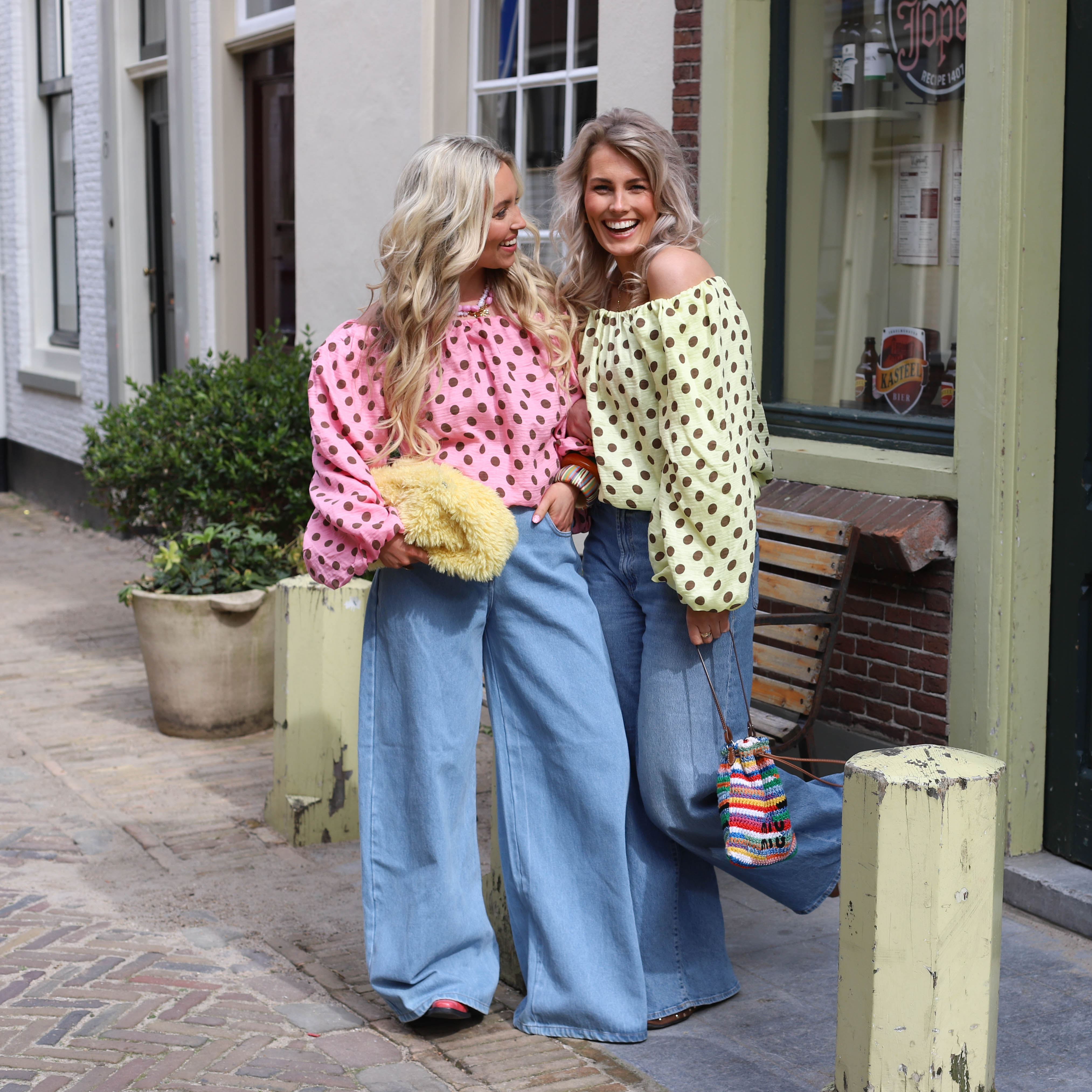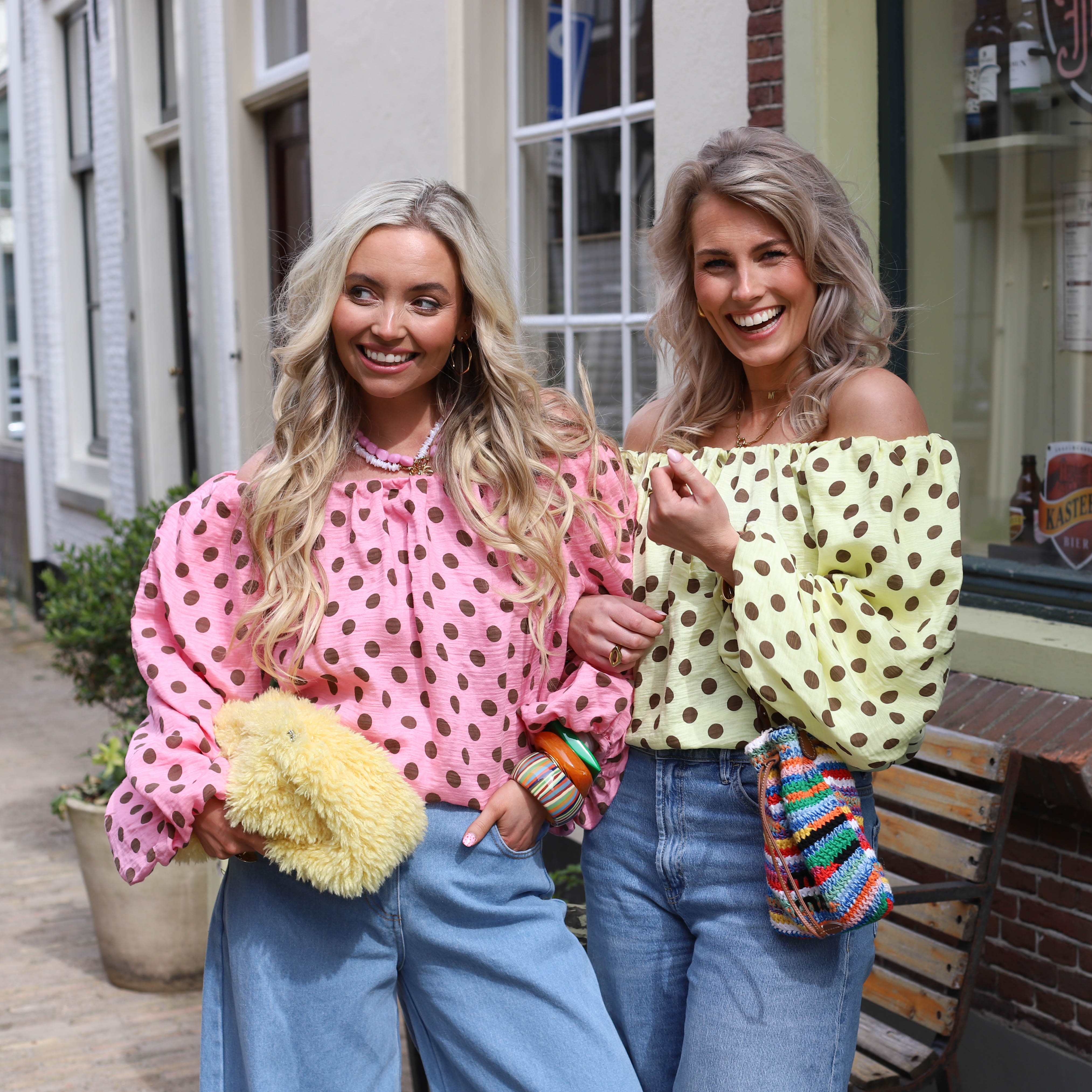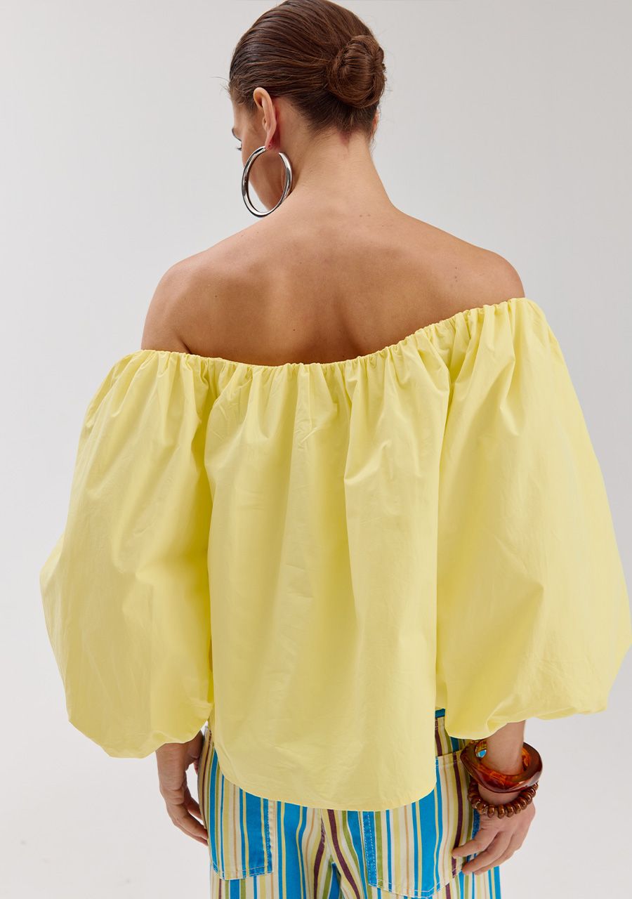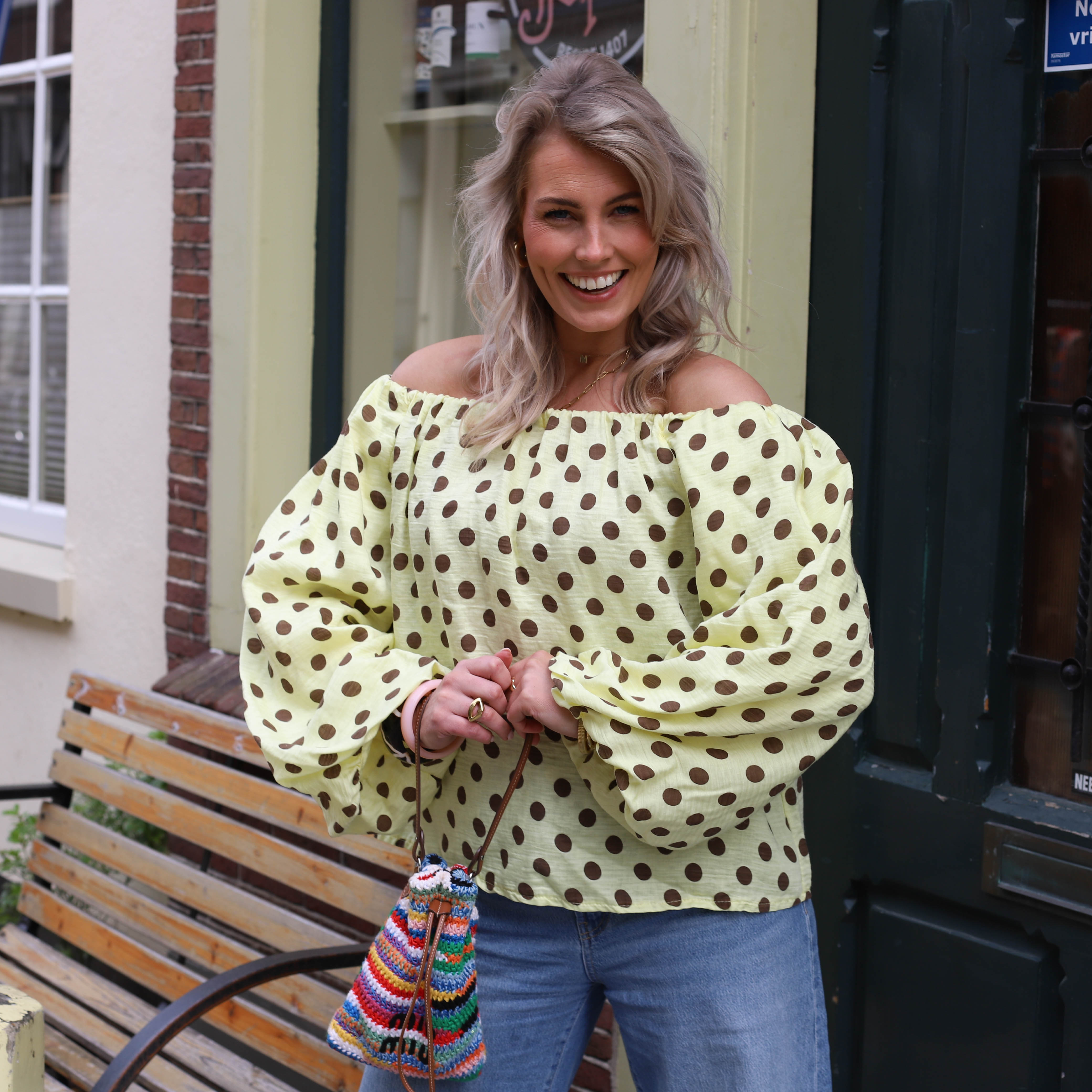 Off shoulder top stippen geel