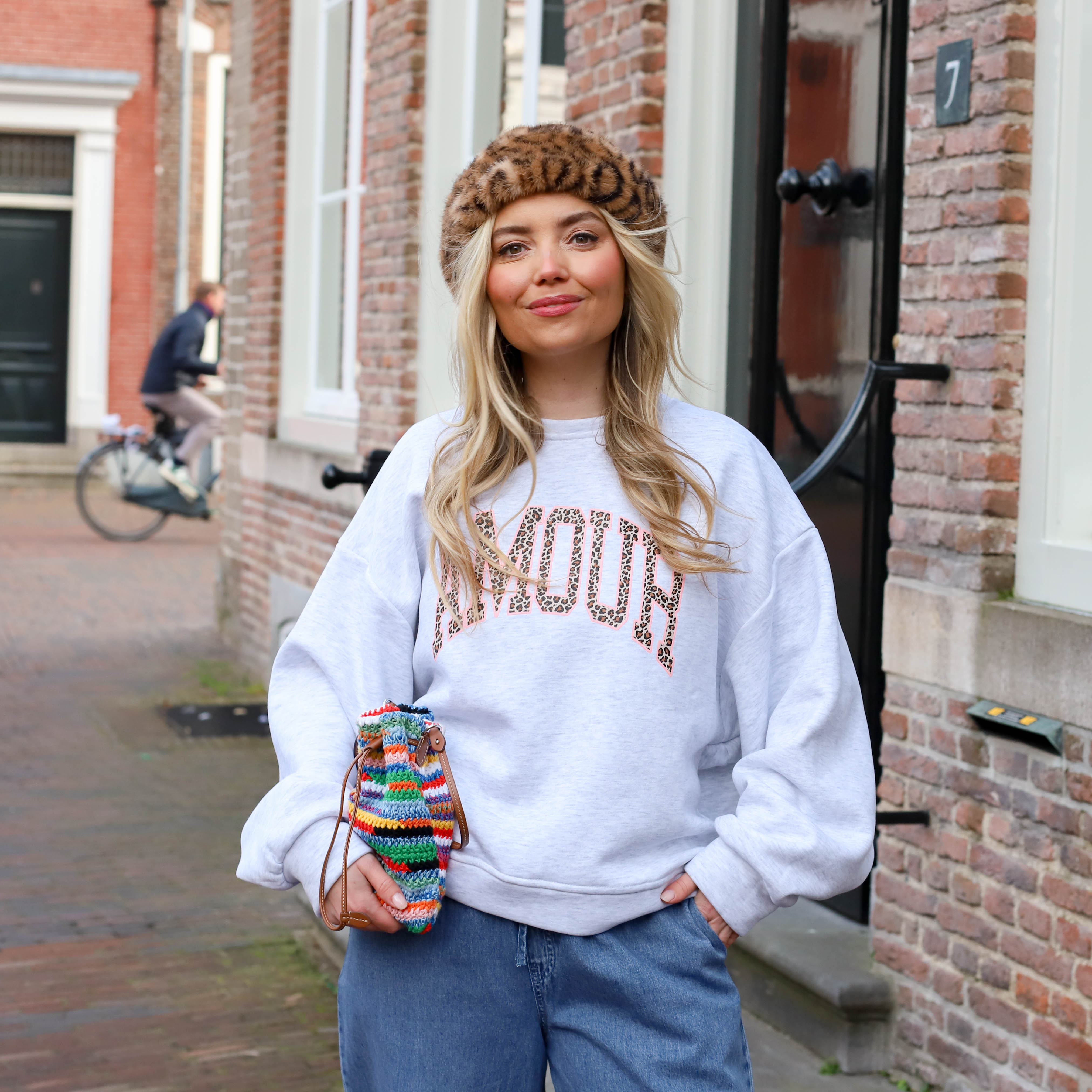 Deze Amour Leopard Sweatshirt is een trendy en comfortabele trui die een speelse touch geeft aan je dagelijkse look. De grijze sweater valt direct op door de gebogen "AMOUR" applicatie op de borst, die stijlvol is ingevuld met een hippe panterprint en afgewerkt met een felle roze bies. Met zijn relaxte pasvorm, ronde hals en verlaagde schoudernaden is dit het ideale item voor een casual outfit die toch vrouwelijk en uniek aanvoelt.