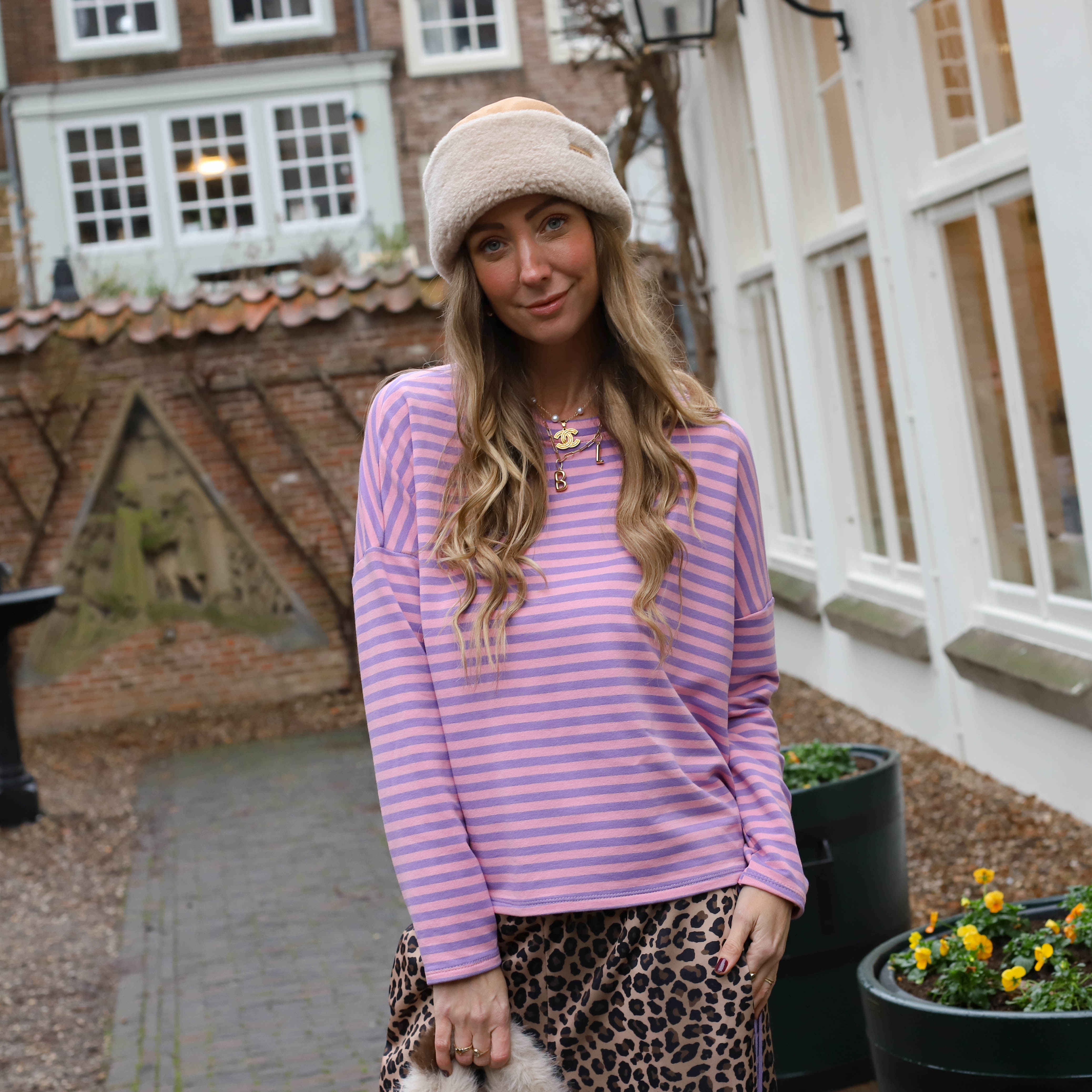 De Billy streep trui is een comfortabele en veelzijdige toevoeging aan je basisgarderobe. Deze trui heeft een klassiek, tijdloos streepdessin in een opvallende combinatie van diep lila en paars. De wijde, casual pasvorm met lange mouwen en een ronde hals zorgt voor een ontspannen en flatterende look. Dankzij de zachte katoenmix is deze trui heerlijk om te dragen. Combineer deze trui eenvoudig met een jeans of een leren broek voor een moeiteloos chique uitstraling.
