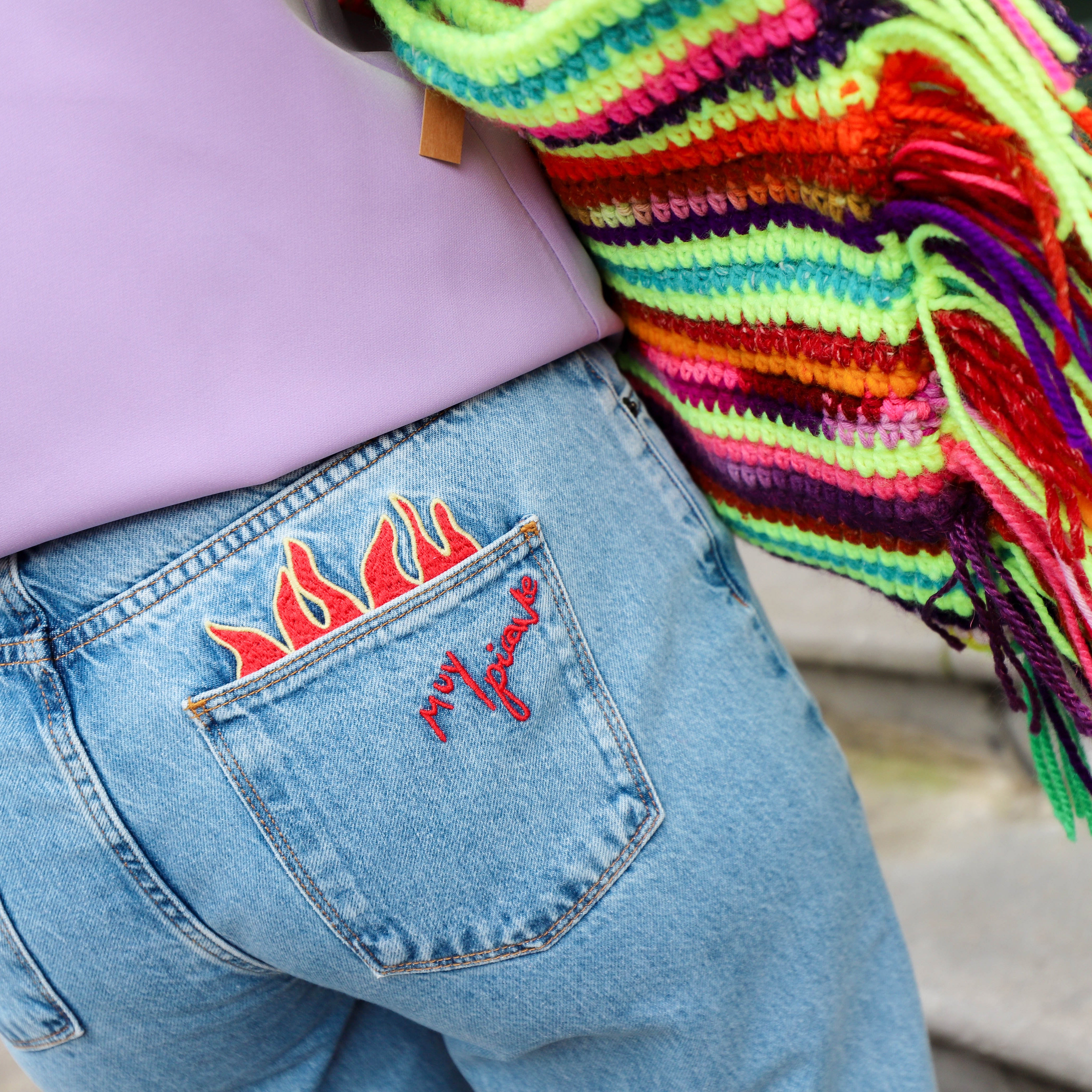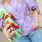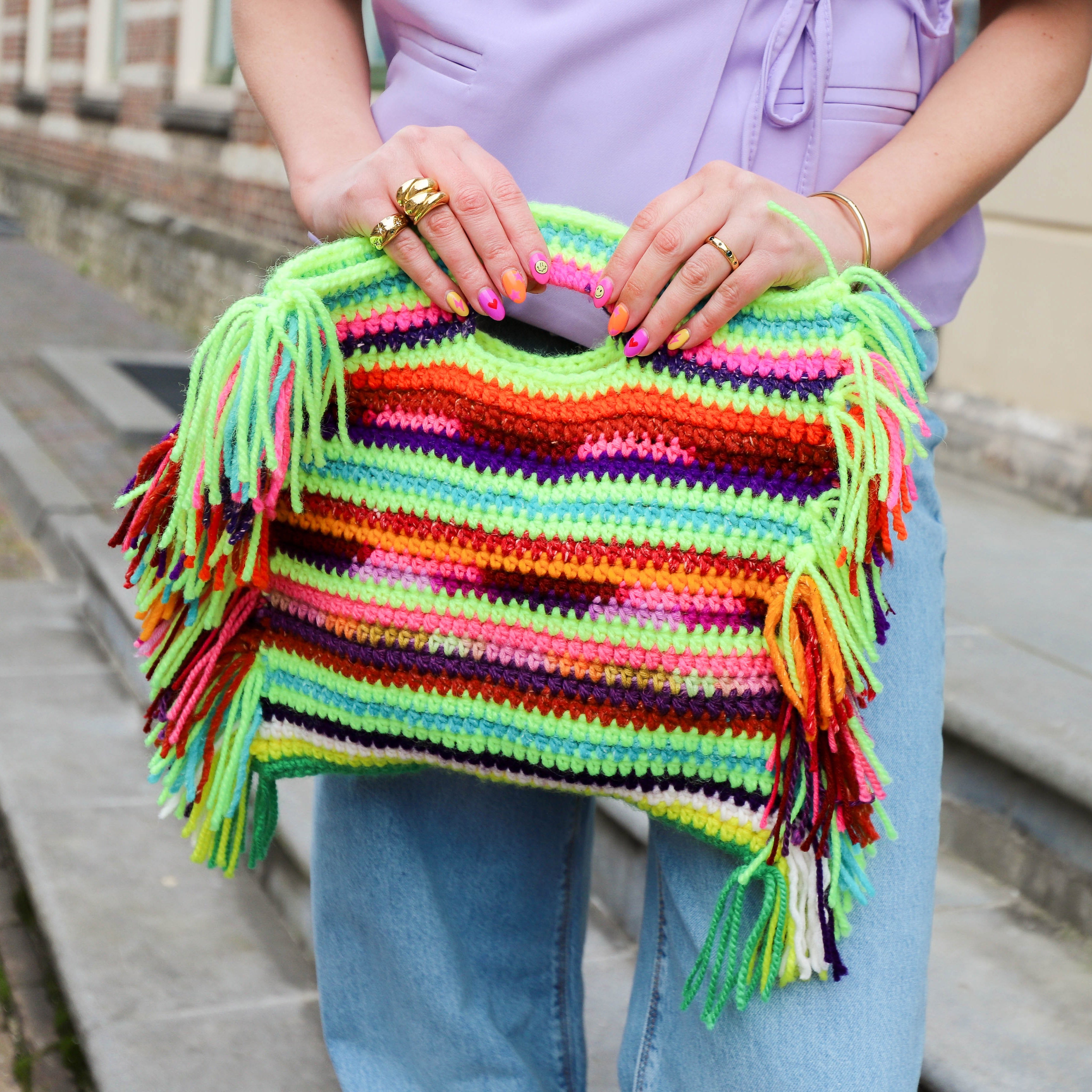 Clutch met meerkleurig harlekijnmotief, handgehaakt van wol. Deze tas heeft geïntegreerde handvatten en franjes aan beide zijden.