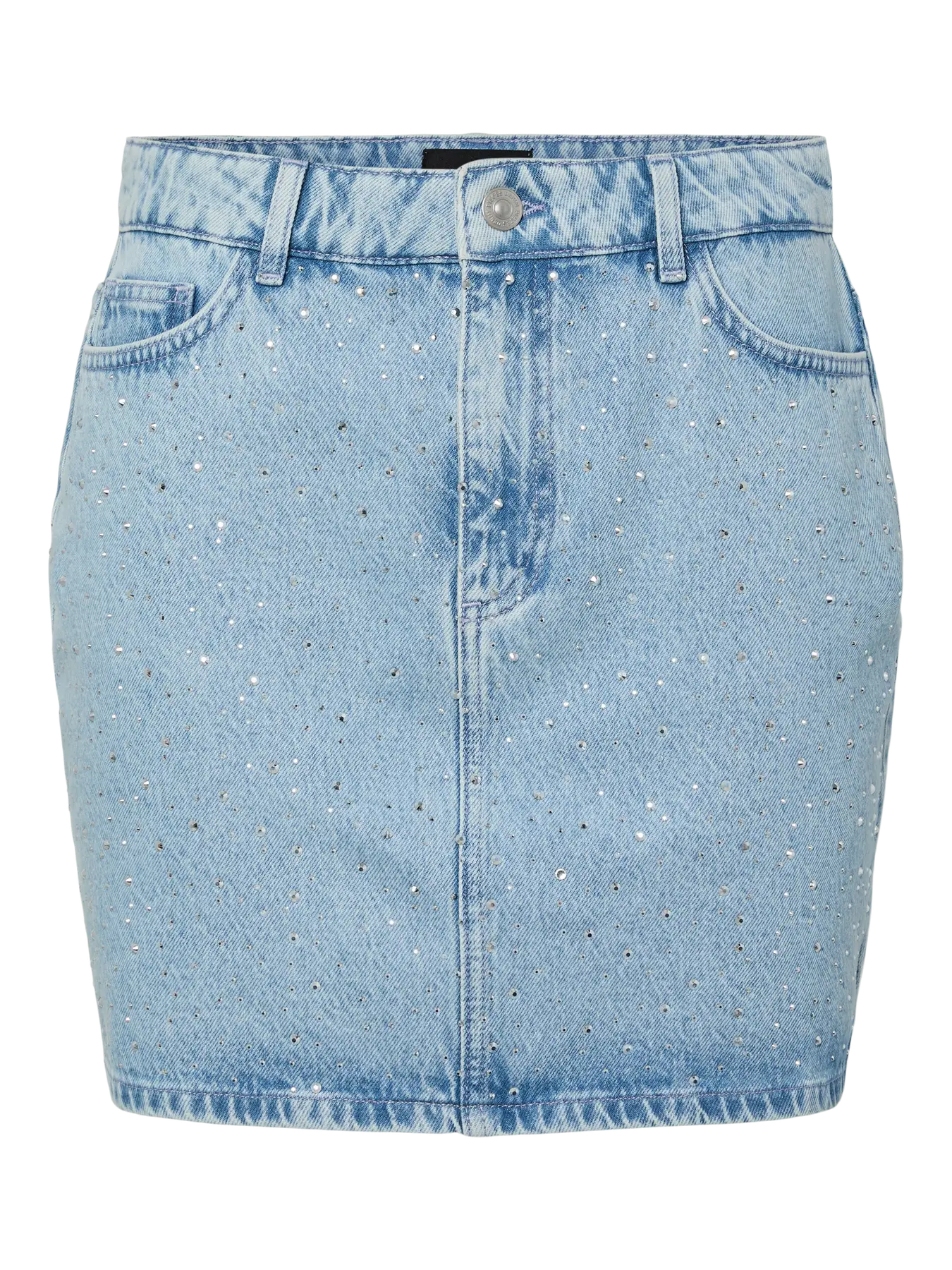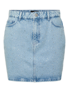 Deze trendy 'Noel MW short denim skirt' is een absolute blikvanger die een vleugje glamour toevoegt aan je casual look. De rok is uitgevoerd in een frisse lichtblauwe denimwassing en volledig versierd met subtiele strass-steentjes, wat zorgt voor een sprankelend effect. De klassieke five-pocket styling, knoop- en ritssluiting, en de lichte A-lijn pasvorm maken deze denim rok zowel comfortabel als modieus. Leuk in combi met de bijpassende top.