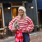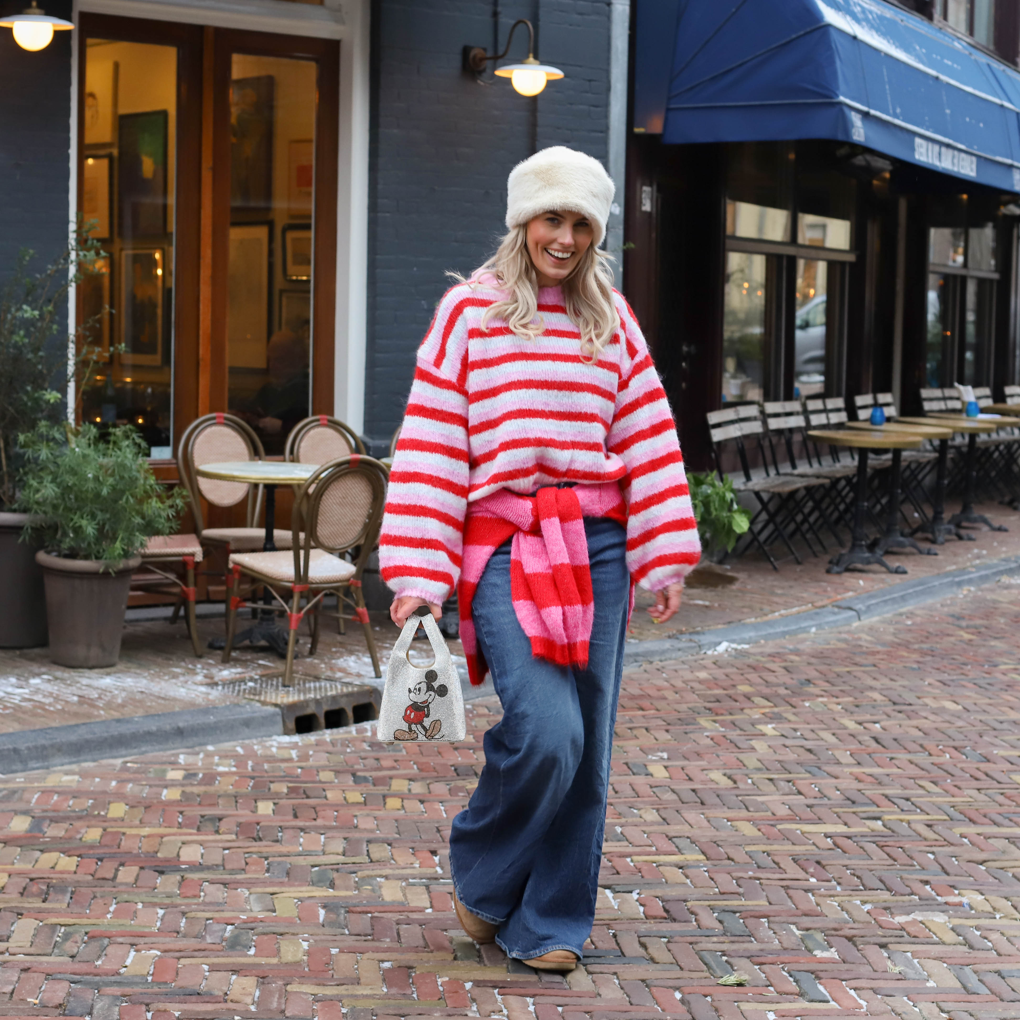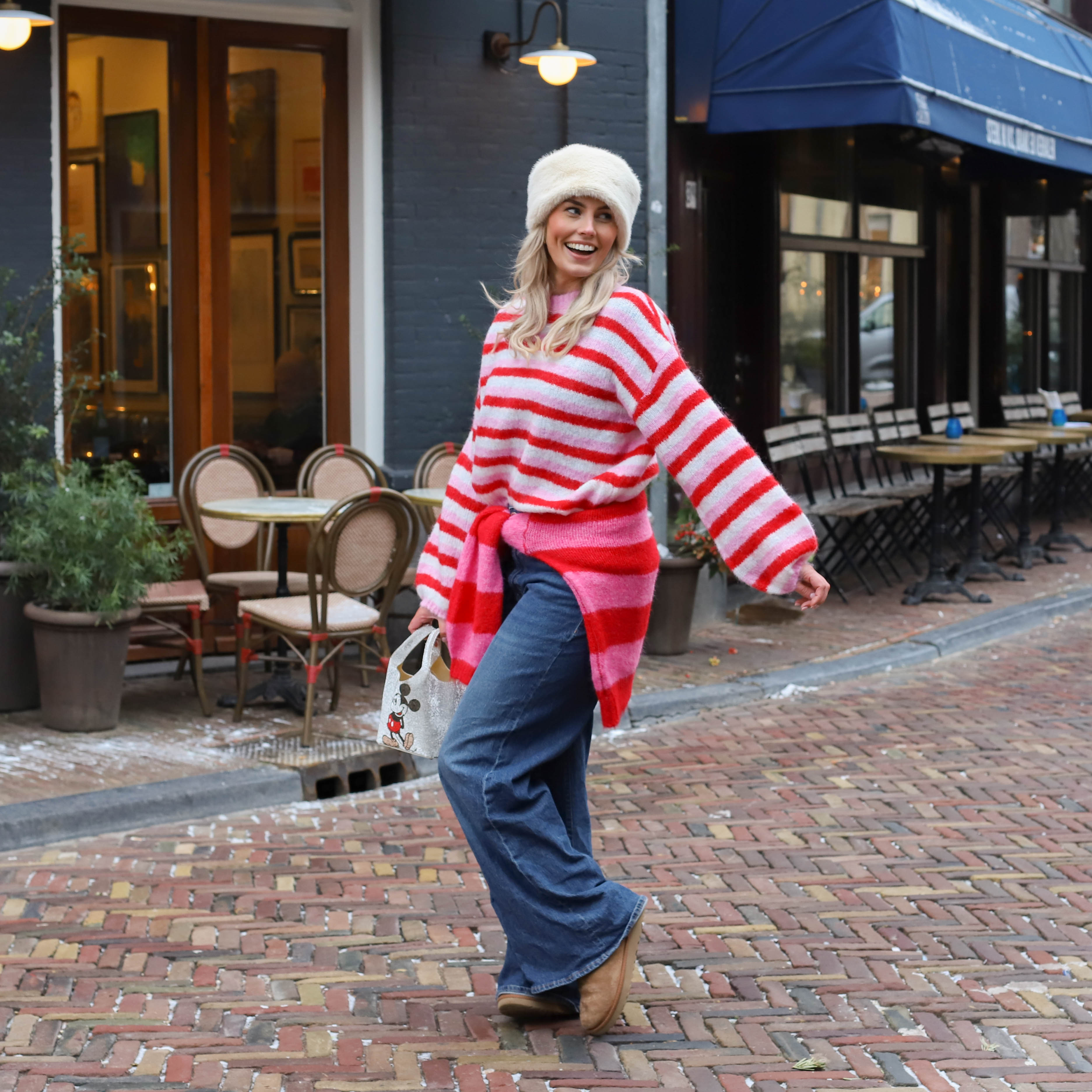 Voeg een vleugje kleur toe aan je outfit met deze eyecatcher. De combinatie van felrood en zachtroze strepen geeft deze trui een frisse, moderne uitstraling. Door de zachte materiaalmix met wol voelt de trui heerlijk comfortabel aan en heeft het die populaire, harige "mohair-look"