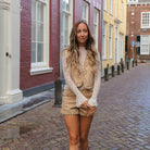 Geef je outfit een stoere en trendy twist met dit unieke gilet. Dit mouwloze gilet heeft een suède-look en is versierd met talloze goudkleurige studs. Combineer met het bijpassende shortje.