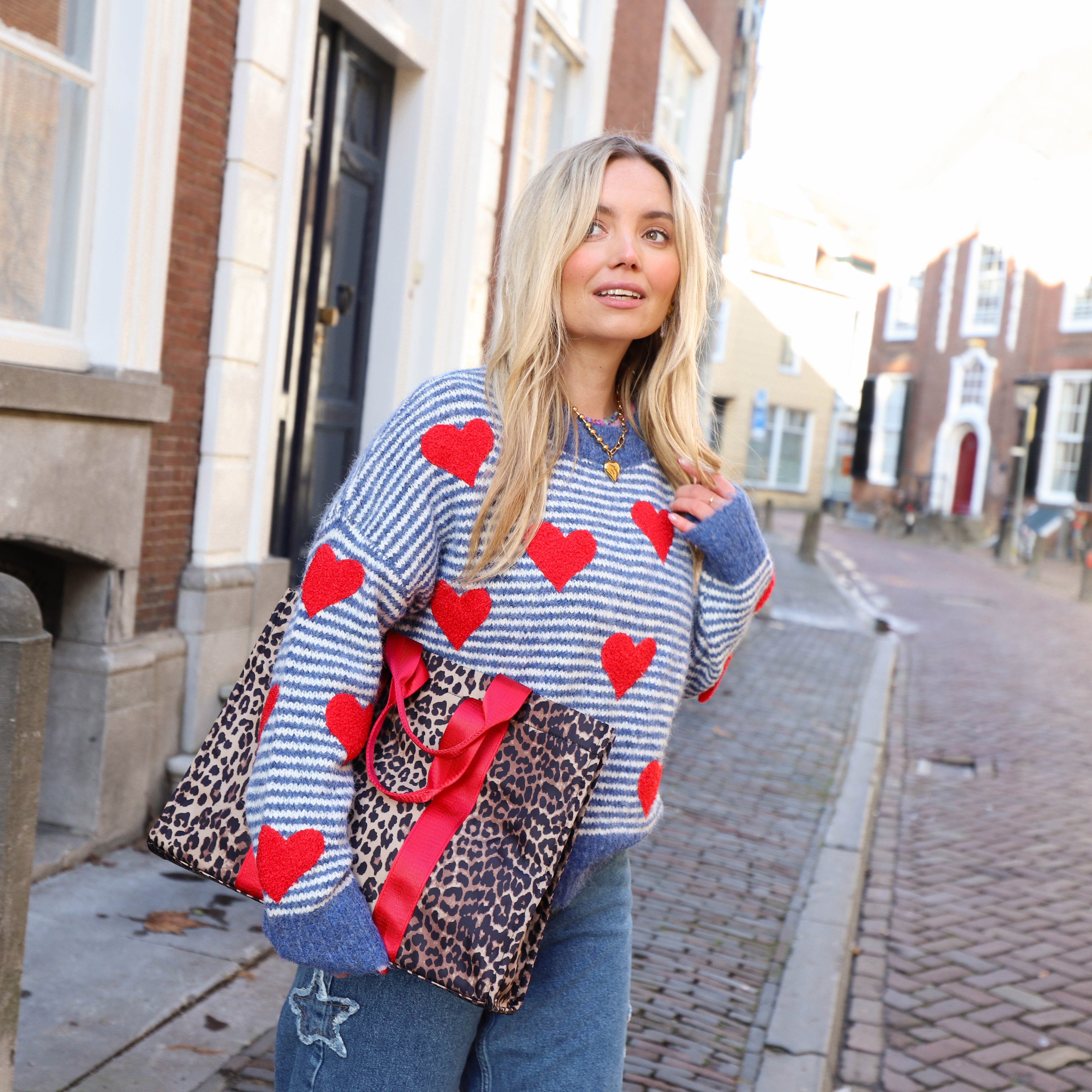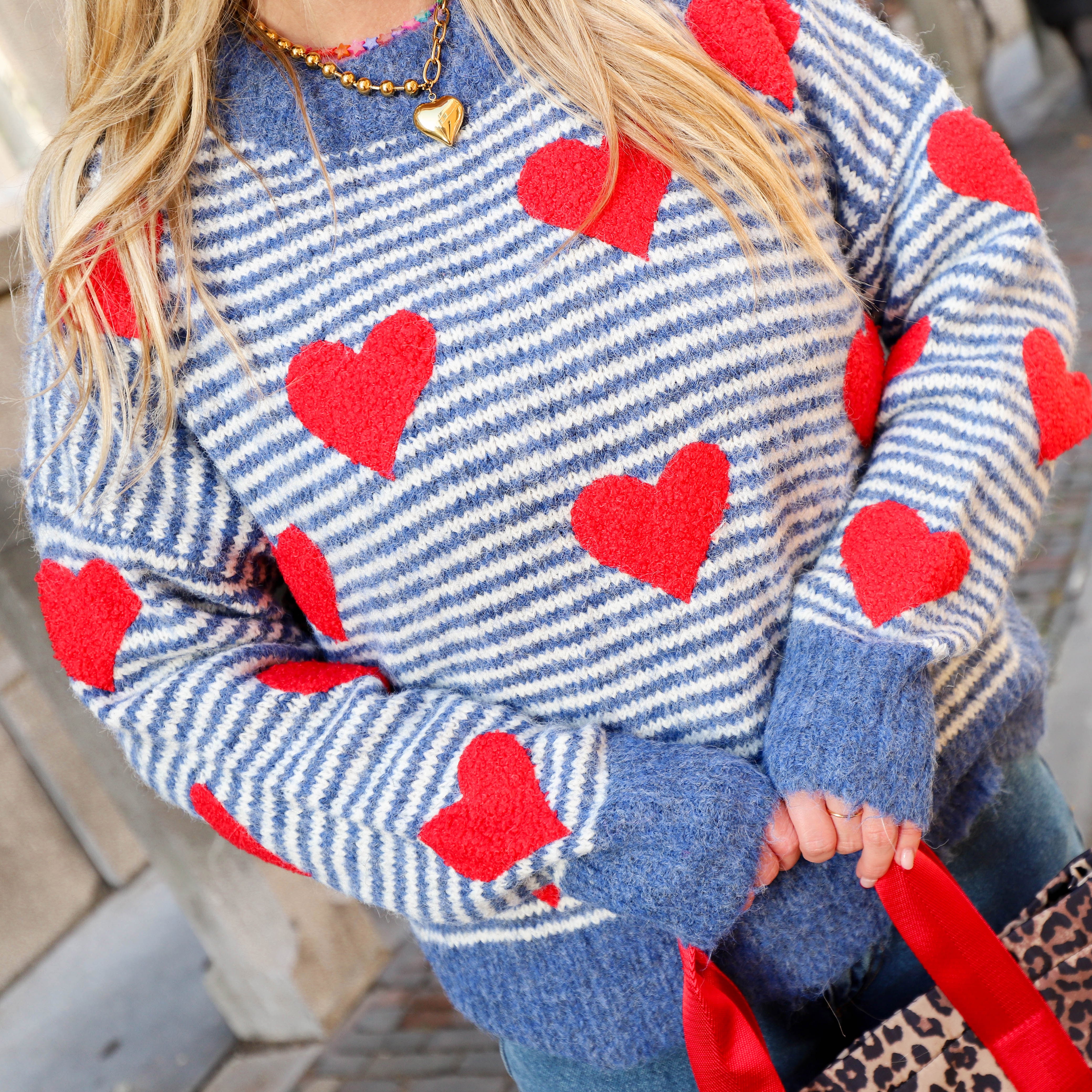 Mooie oversized trui in het blauw met dunne witte strepen. De trui heeft een print vna rode hartjes en staat leuk met een spijkerbroek.