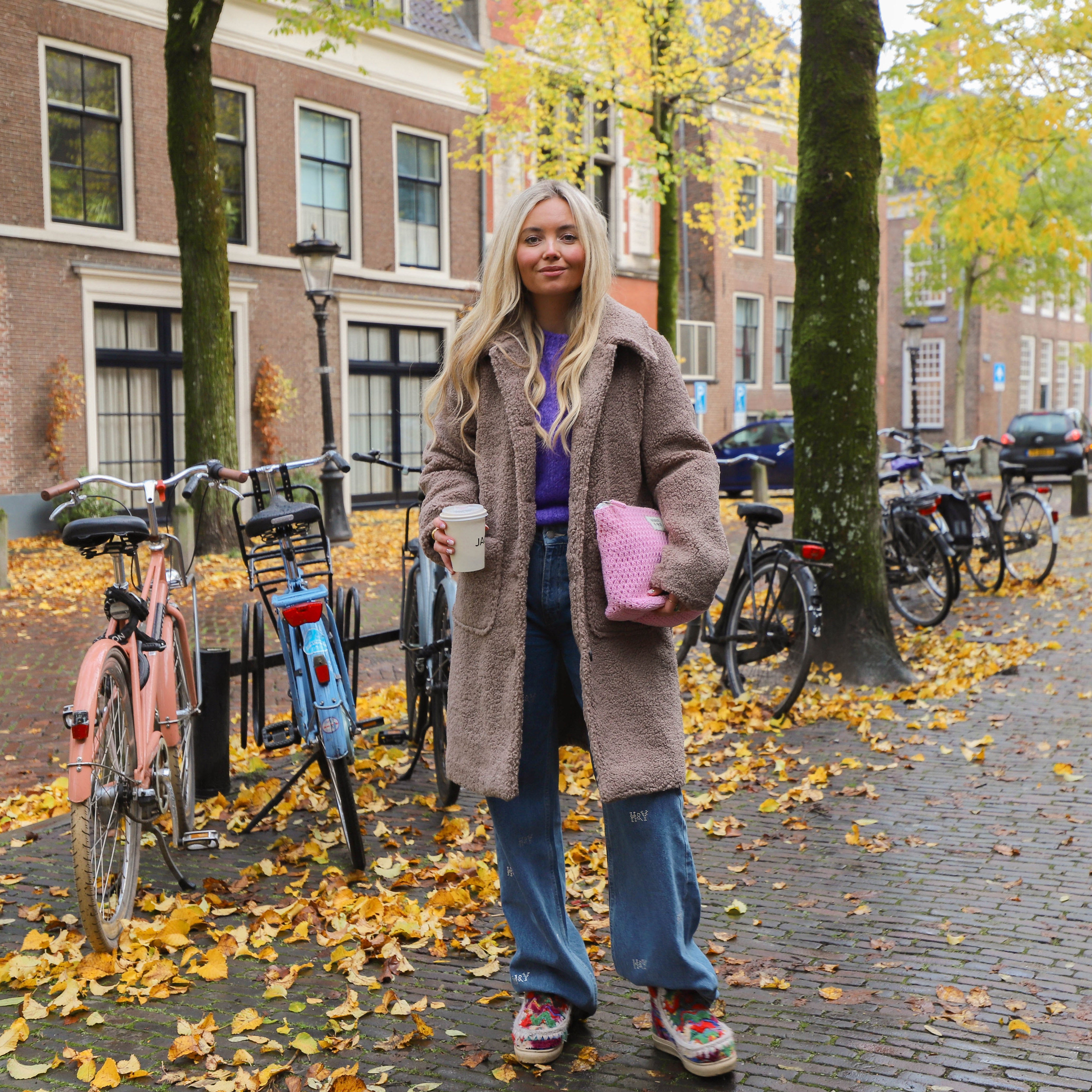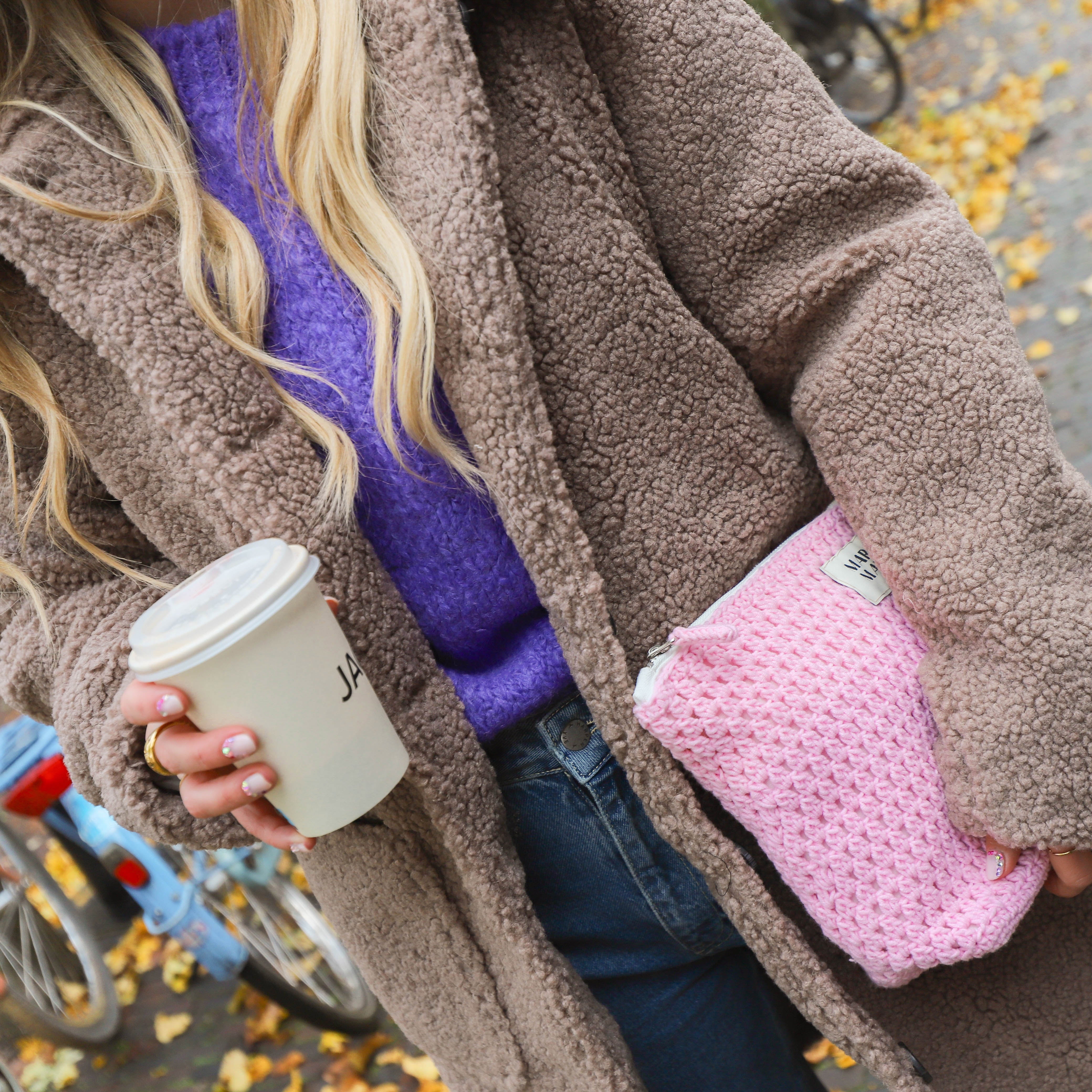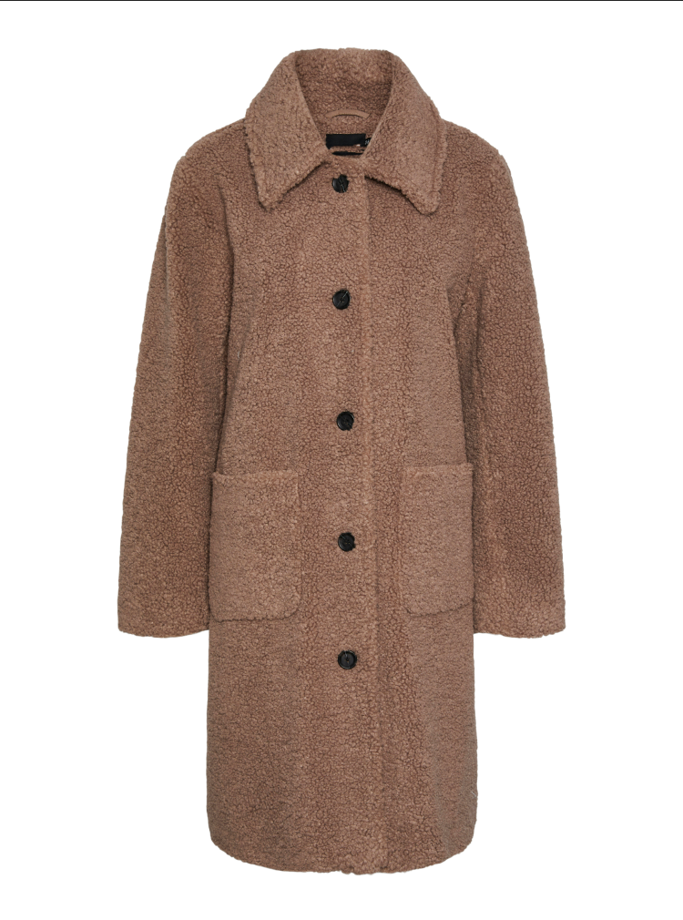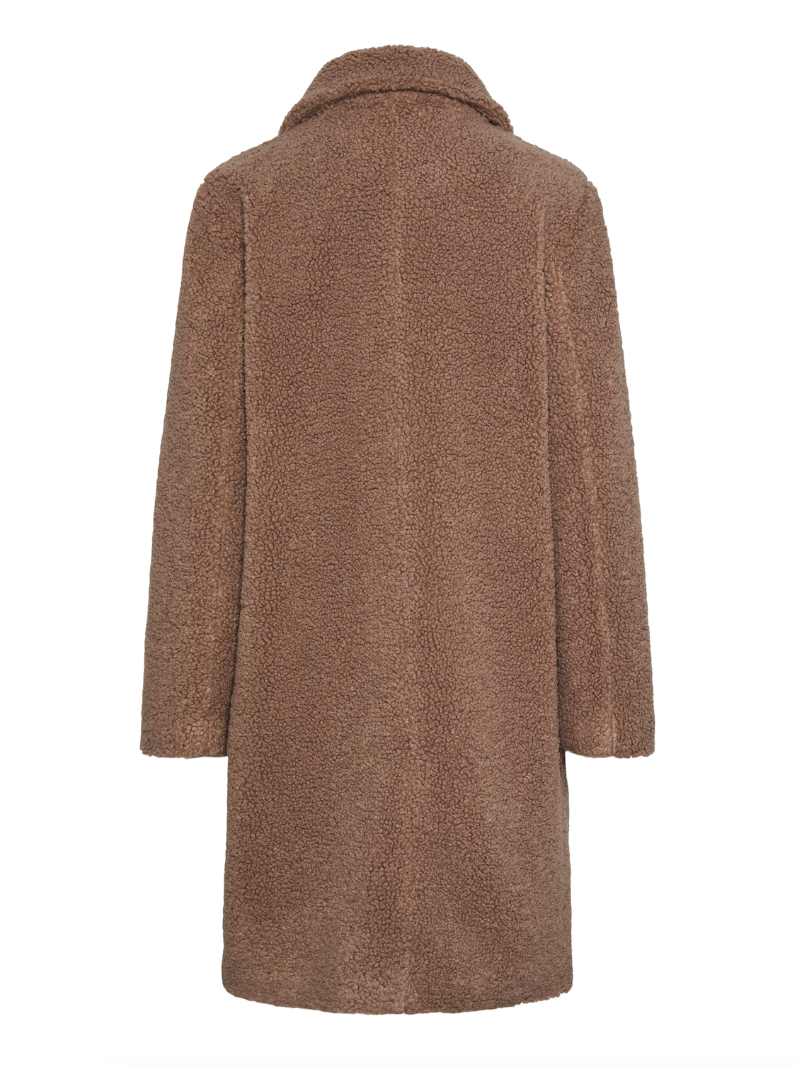 Mooie taupekleurige jas van Teddystof. De jas zit heerlijk, sluit met knopen en heeft twee zakken aan de voorkant.