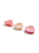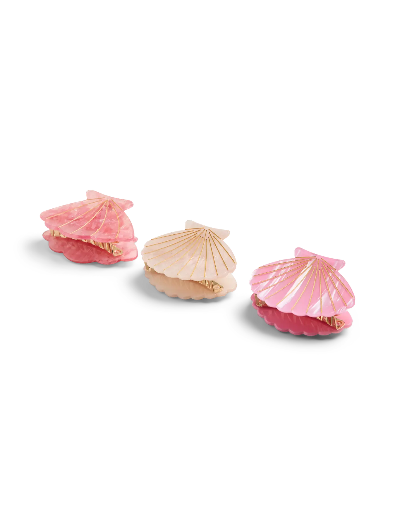 Drie prachtige haarklemmen in de vorm van een schelp. Twee van de klemmen zijn zachtroze van kleur, en de middelste klem is crème-wit. Elke klem heeft fijne, goudkleurige lijnen die de ribbels van een schelp imiteren, en aan de onderkant is de rand golvend. De klemmen zijn spiegelend aan de onderkant, wat een reflectie geeft.