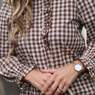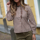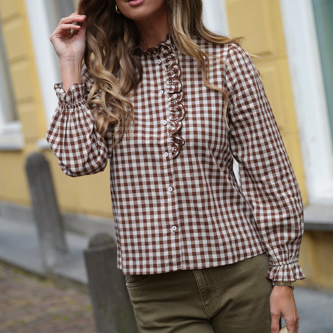 Deze charmante ruitjes blouse is een stijlvolle toevoeging aan je garderobe. De blouse heeft een klassiek gingham ruitpatroon in een warme chocoladebruine en gebroken witte kleurstelling.