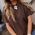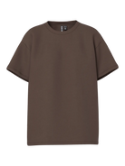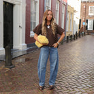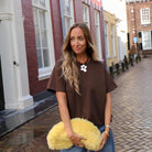 Mooi bruin shirtje in een oversized model. Het shirtje heeft korte mouwen en een ronde hals. Een musthave basic voor in je kast. Combineer hem net als ons model met een denim jeans.