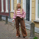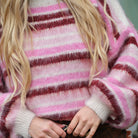 Deze Streep Trui is een heerlijk zachte en oversized trui met een knusse uitstraling. De trui heeft een opvallend horizontaal streepdessin in een speelse mix van roze, bordeauxrood en off-white. De fluffy knit, de wijde ronde hals en de relaxte pasvorm maken dit de perfecte trui voor de koude dagen.