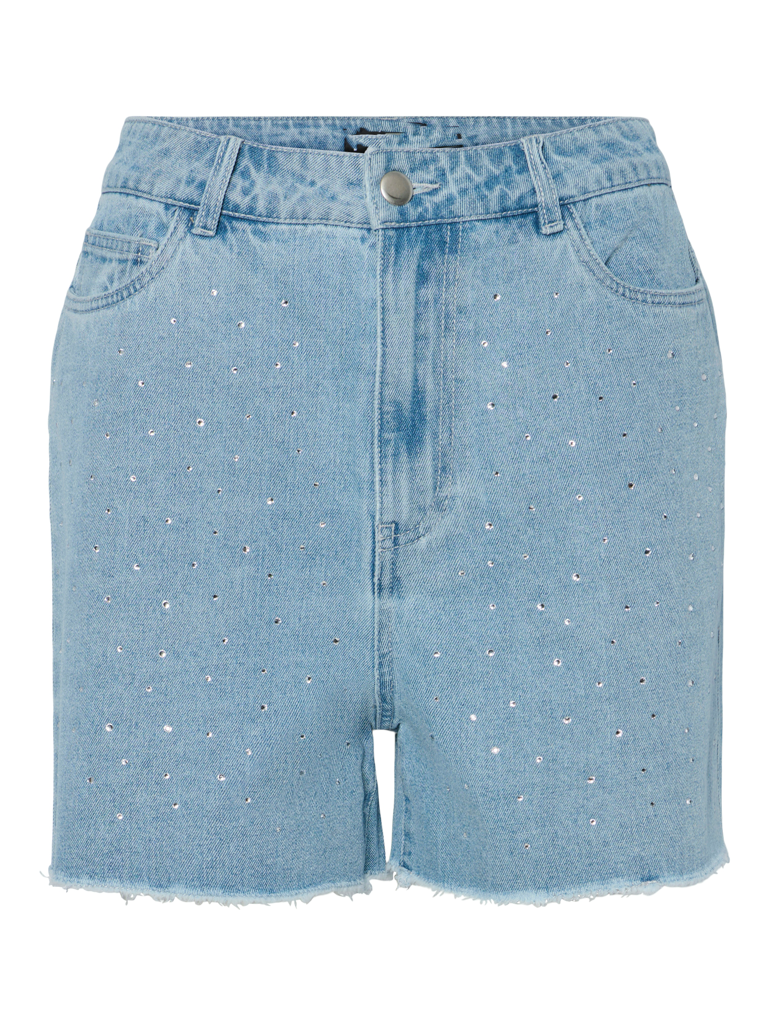Deze Denim Shorts zijn een stijlvolle en trendy toevoeging aan je zomerse garderobe. De denim shorts zijn versierd met subtiele strass steentjes, wat zorgt voor een unieke en opvallende look. De high waist en regular fit zorgen voor een comfortabele pasvorm, perfect voor warme dagen.