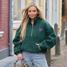 De oversized pasvorm, de hoge kraag met een halve rits en de ruime kangoeroezak aan de voorkant zorgen voor een sportieve en nonchalante uitstraling. De ronde, geborduurde patch op de borst geeft een speels kleuraccent. Draag dit jack zowel binnen als buiten voor extra warmte.
