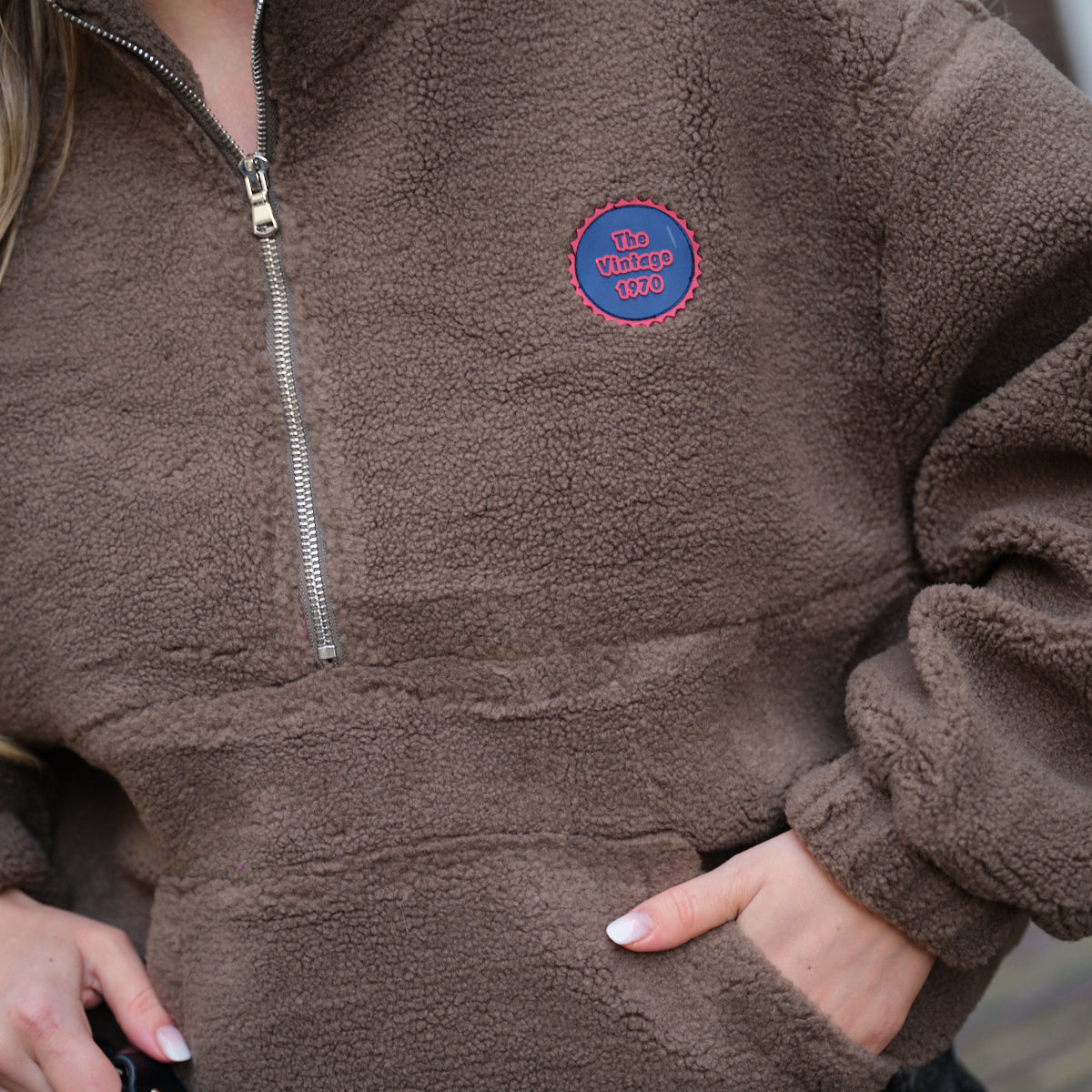 De oversized pasvorm, de hoge kraag met een halve rits en de ruime kangoeroezak aan de voorkant zorgen voor een sportieve en nonchalante uitstraling. De ronde, geborduurde patch op de borst geeft een speels kleuraccent. Draag dit jack zowel binnen als buiten voor extra warmte.