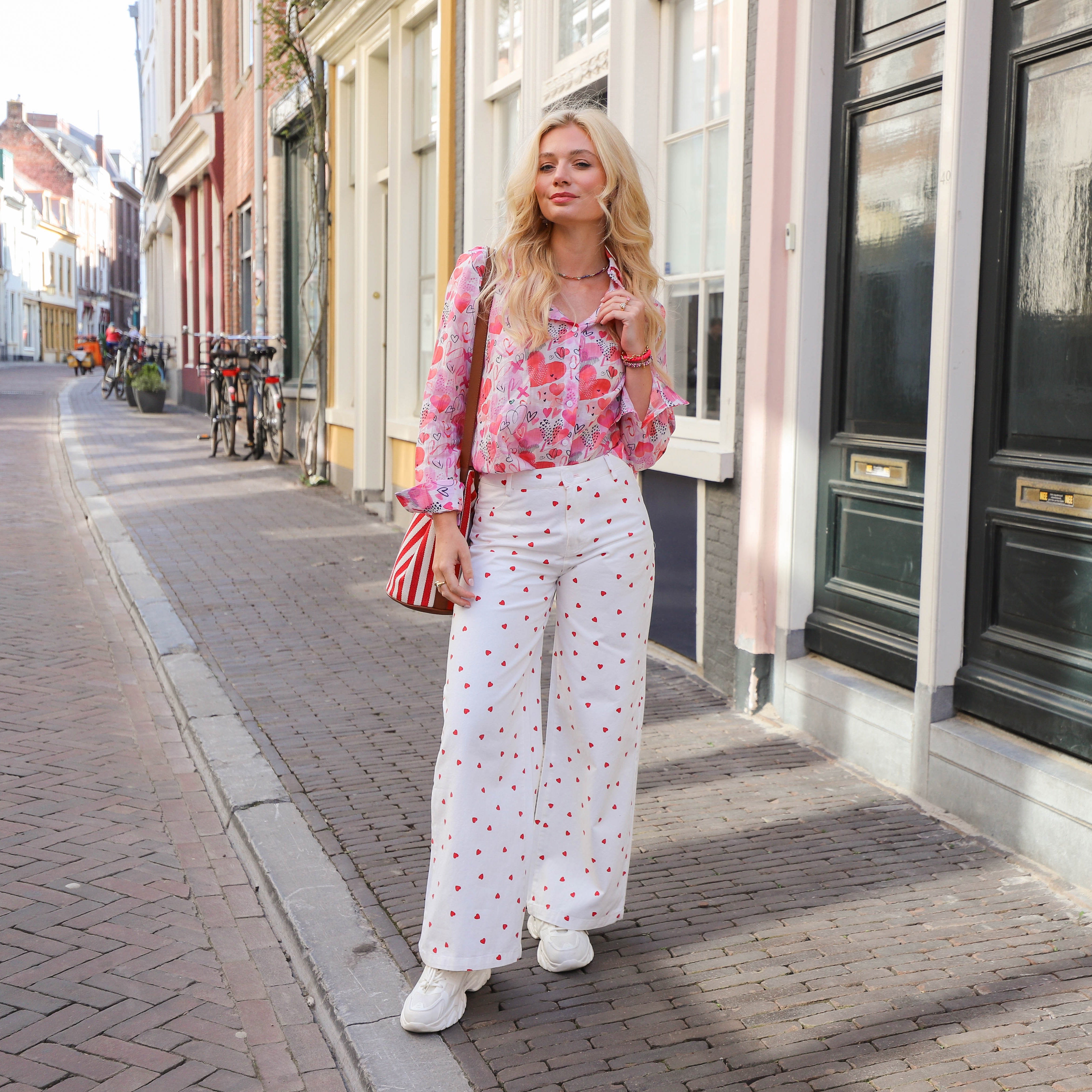 Deze blouse is een opvallend en romantisch item. De blouse heeft een all-over hartjesprint in roze en oranje tinten, wat zorgt voor een vrolijke en vrouwelijke uitstraling. Combineer met een witte denim jeans met hartjes.