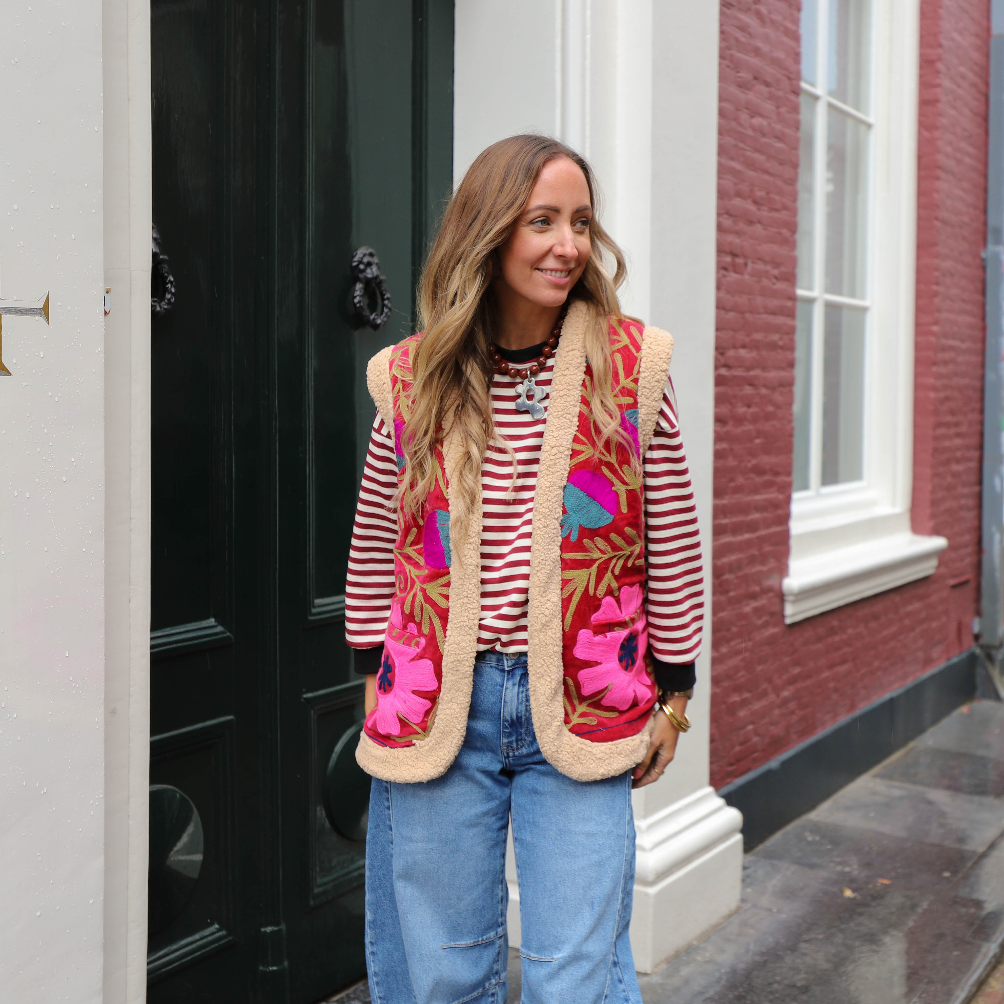 Geef je outfit een unieke en bohemian twist met dit prachtig geborduurde gilet. Dit gilet is aan de buitenkant gemaakt van een zacht fluweel materiaal in een bordeauxrode kleur en is voorzien van een opvallend bloemenborduurwerk. De binnenkant en de randen van het gilet zijn gemaakt van een zachte teddy stof. Het gilet heeft een mouwloze pasvorm en opgestikte zakken.