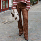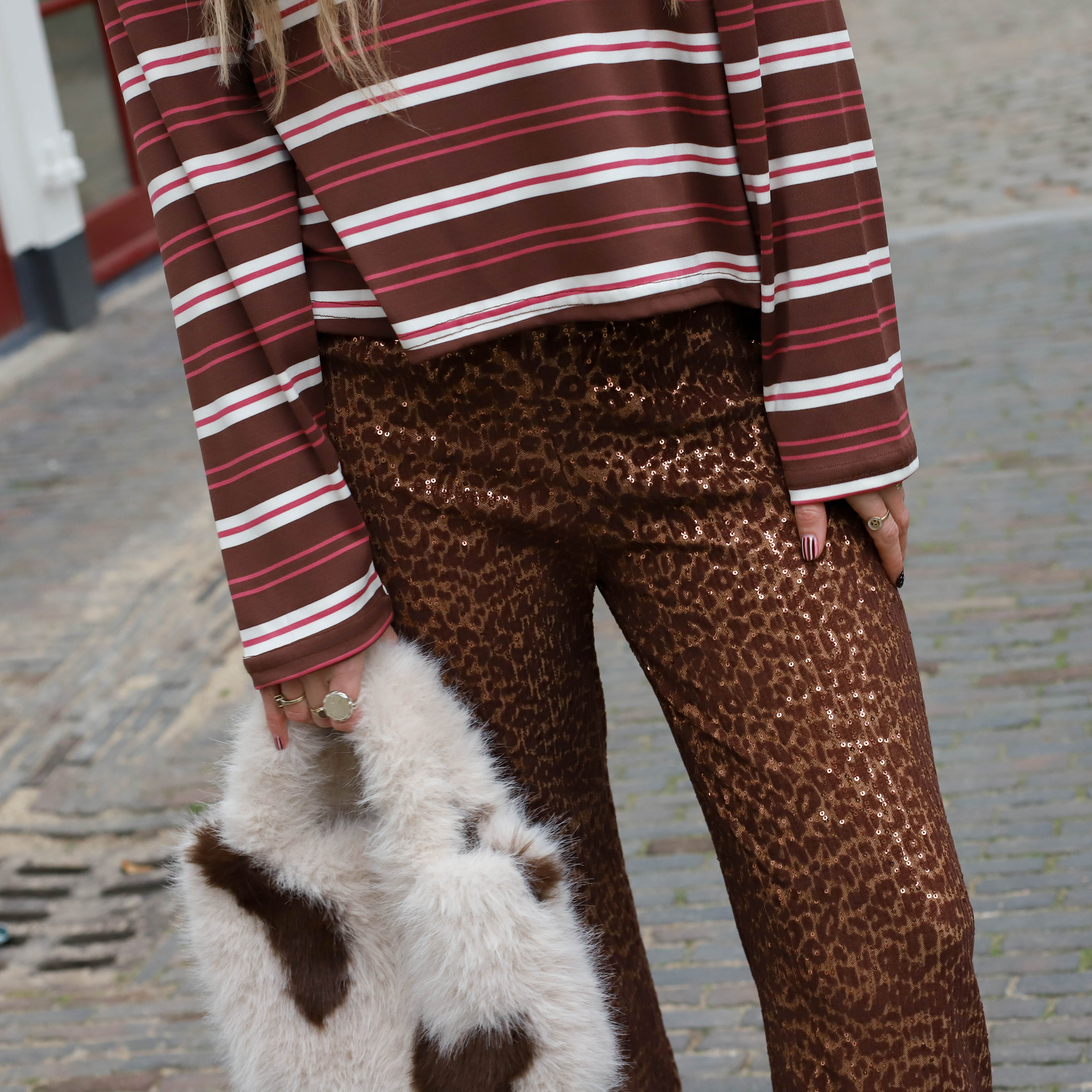 Deze Leo Paillet Broek is een opvallende en trendy broek. De broek is gemaakt van een geplisseerde stof met een all-over luipaardprint. De stof heeft een lichte glans, waardoor de print extra opvalt. De broek heeft een hoge taille met een elastische tailleband en wijde, rechte pijpen.