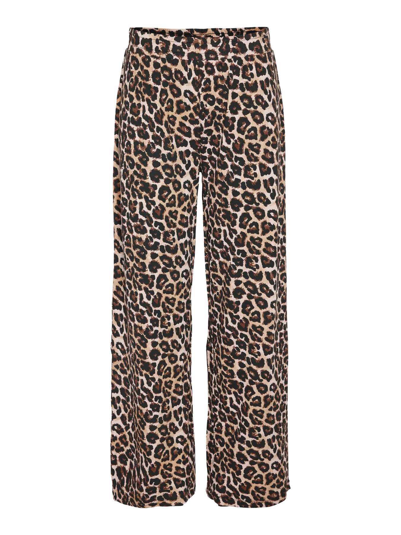Deze NM Pasa Wide Pants is een trendy en comfortabele broek. De broek is gemaakt van een soepele stof met een opvallende all-over luipaardprint in bruin en zwart. De broek heeft een hoge taille met een elastische tailleband en wijde, rechte pijpen.