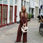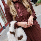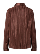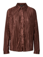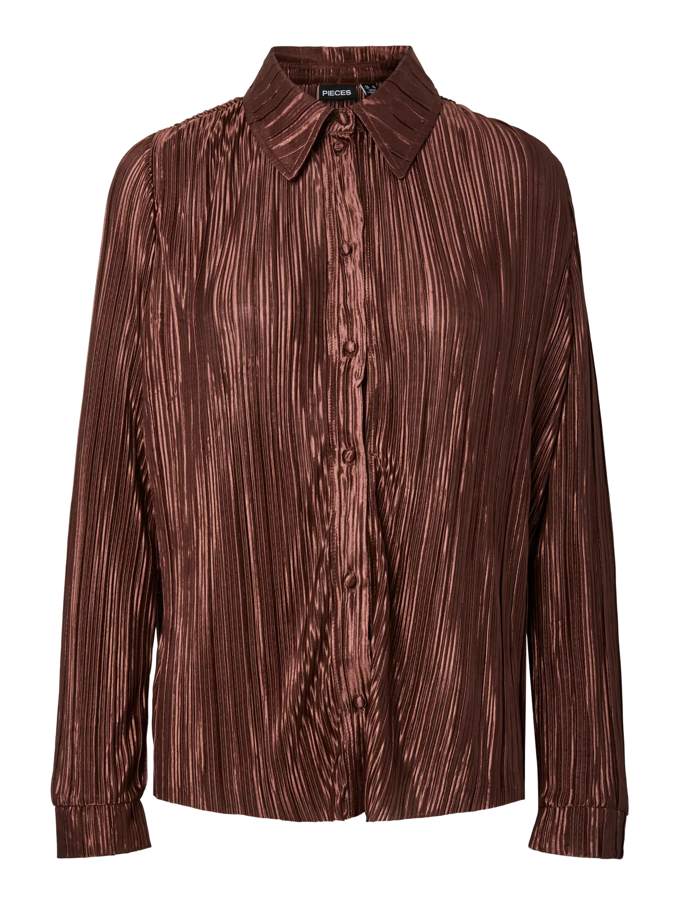 Deze Pc Nora Shirt is een elegante blouse met een opvallende textuur. Het shirt is gemaakt van een glanzende, plissé-achtige stof in een diepe 'hot fudge' (bruine) kleur. Het shirt heeft een klassieke kraag, een doorlopende knoopsluiting en geplooide schouderdetails, wat zorgt voor een chique uitstraling.