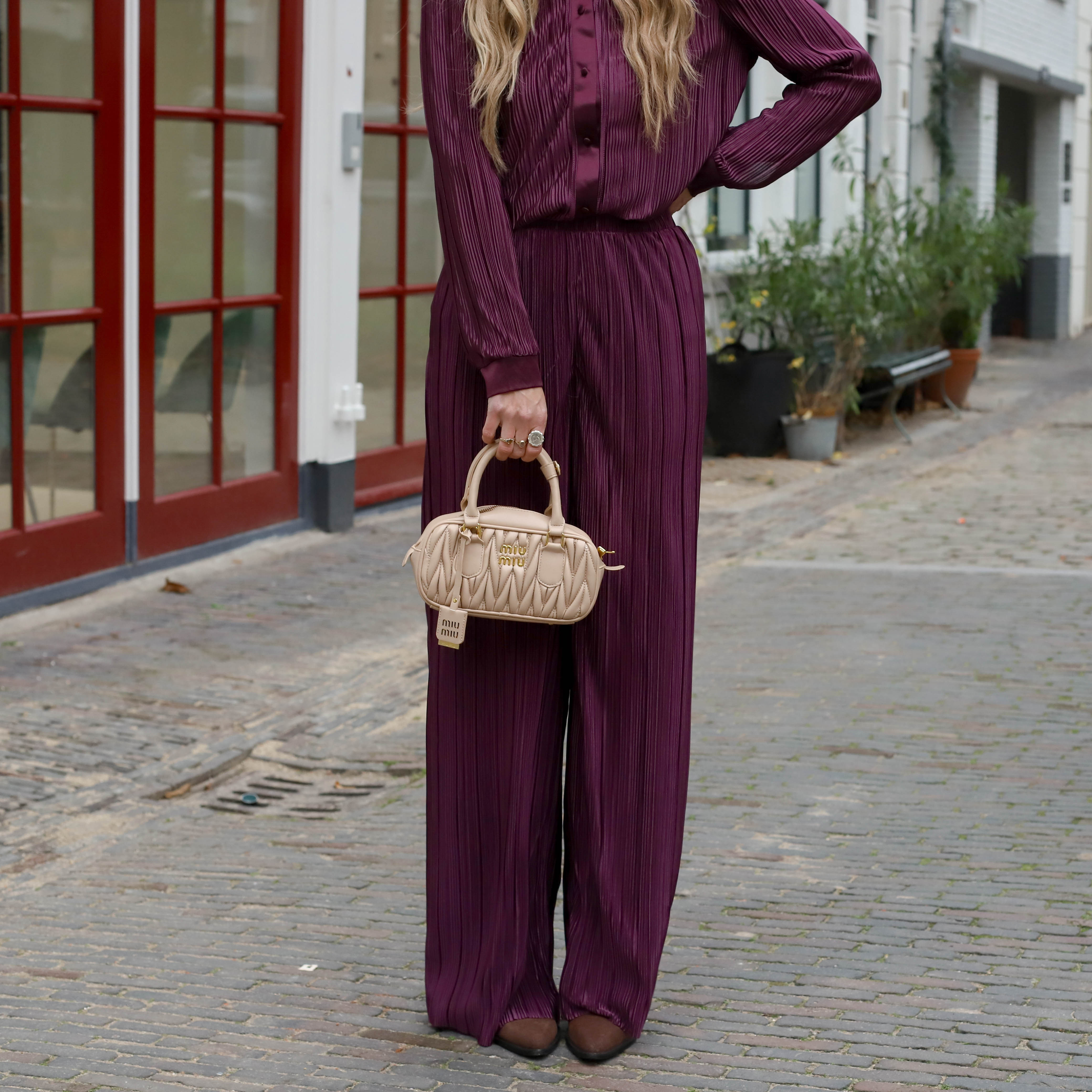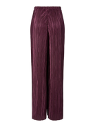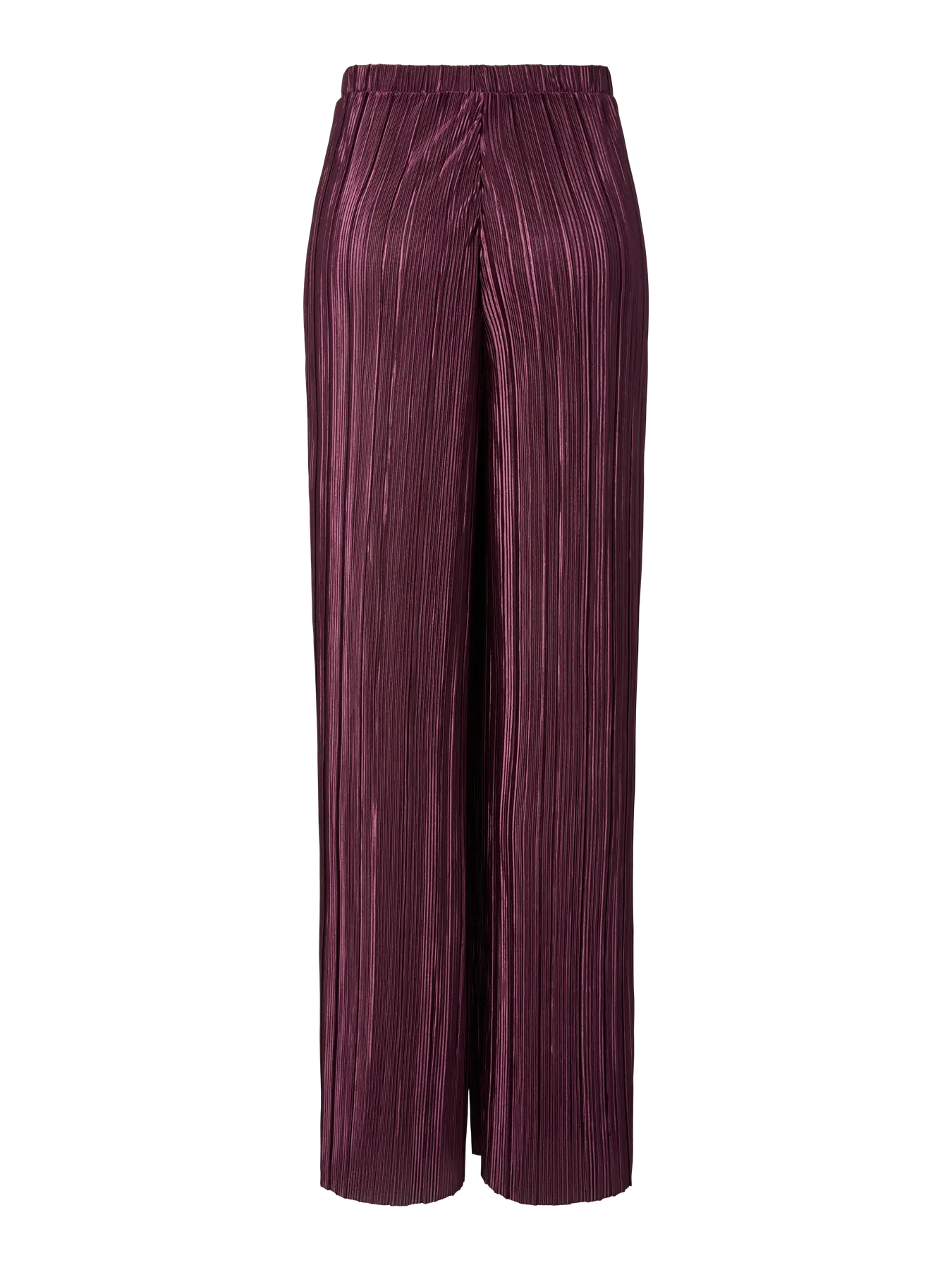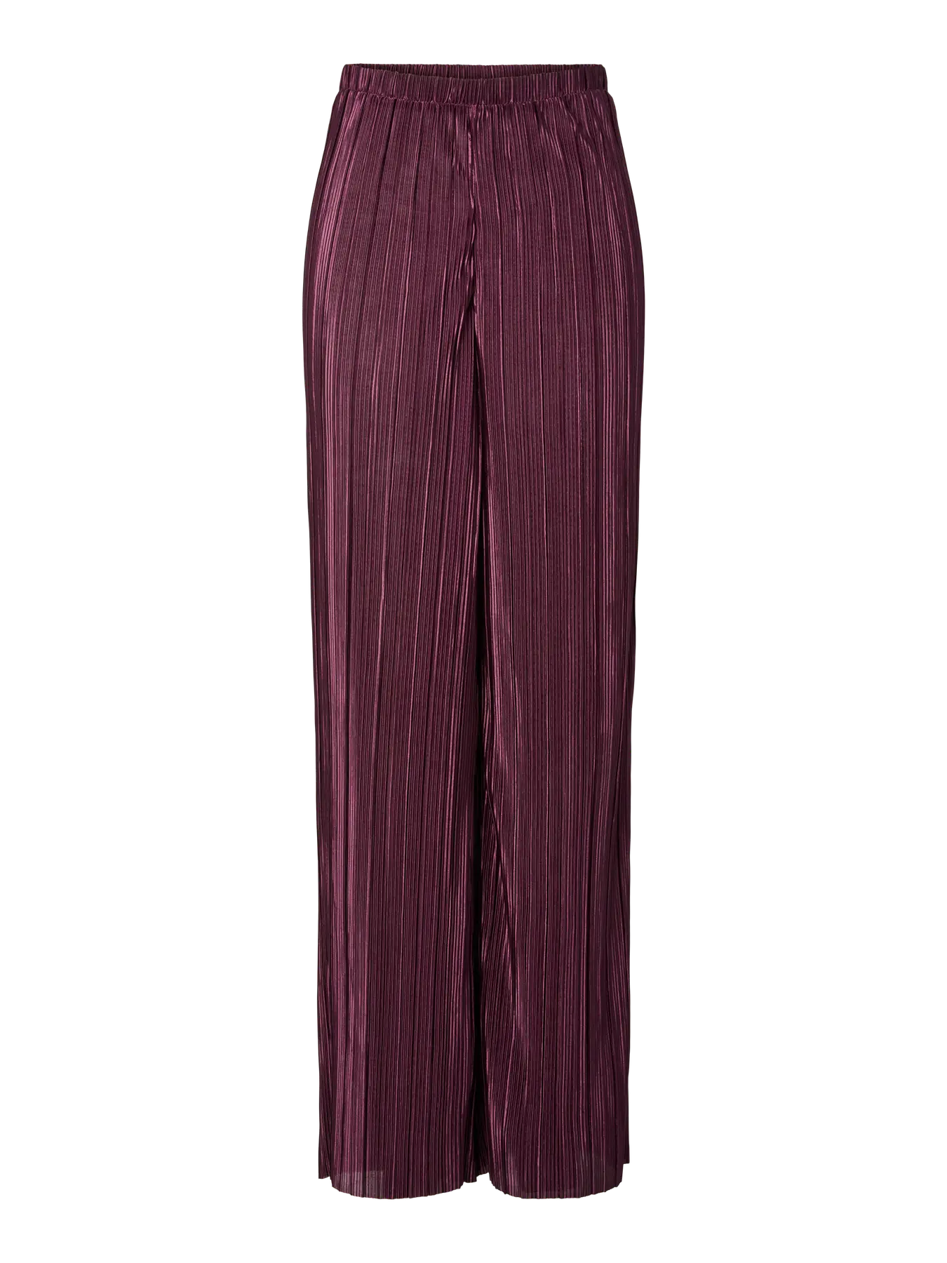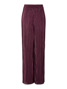 Deze Pc Nora Wide Pants is een trendy en comfortabele broek met een elegante uitstraling. De broek is gemaakt van een geplisseerde stof in een diepe 'winetasting' (paars/bordeaux) kleur. De broek heeft een hoge taille met een elastische tailleband en wijde, rechte pijpen.