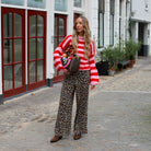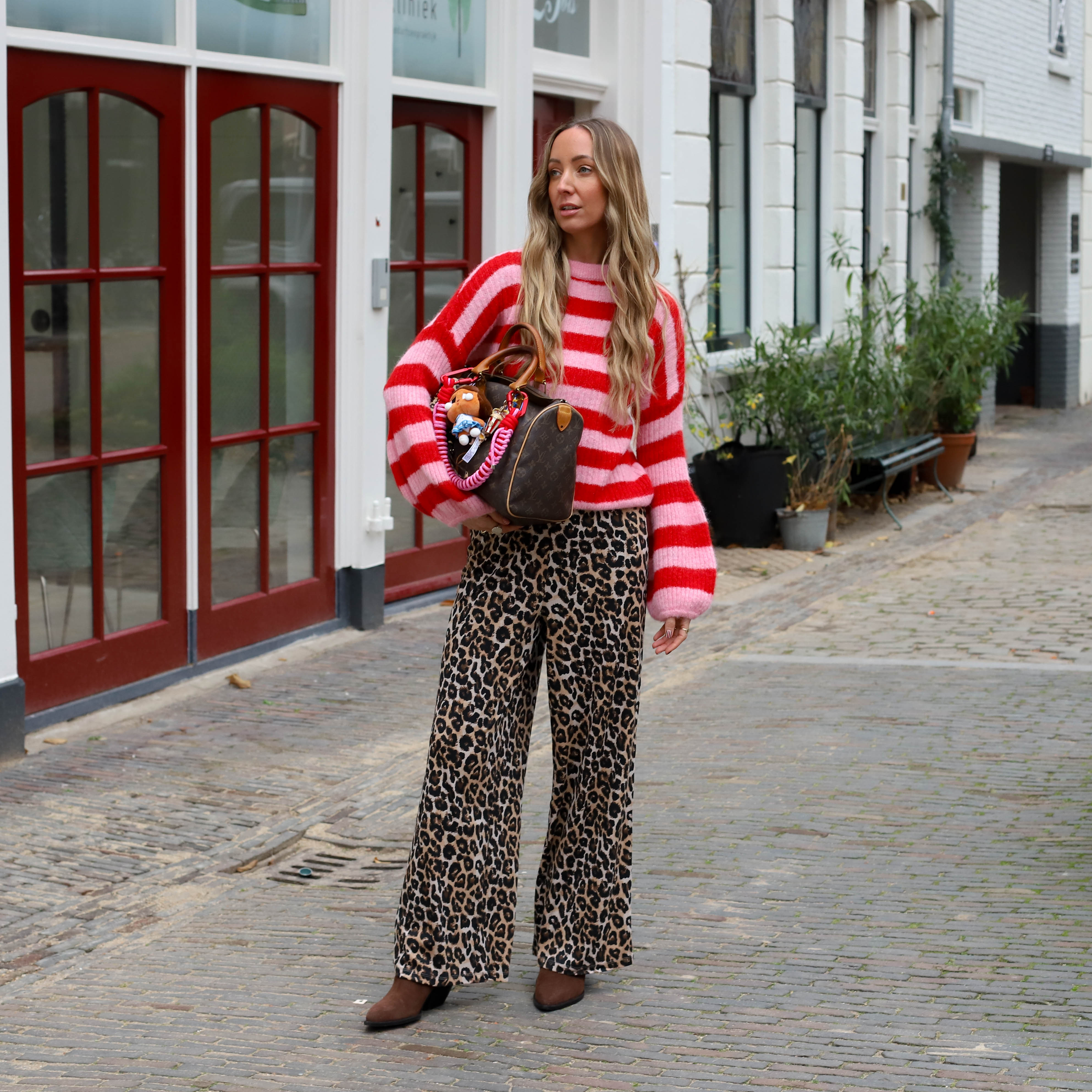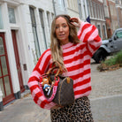 Deze Pip Streep Trui is een zachte en harige knitwear. De trui is grof gebreid met brede horizontale strepen in roze en rood. De trui heeft een klassieke ronde hals en een ruime, cropped pasvorm met opvallende ballonmouwen.
