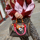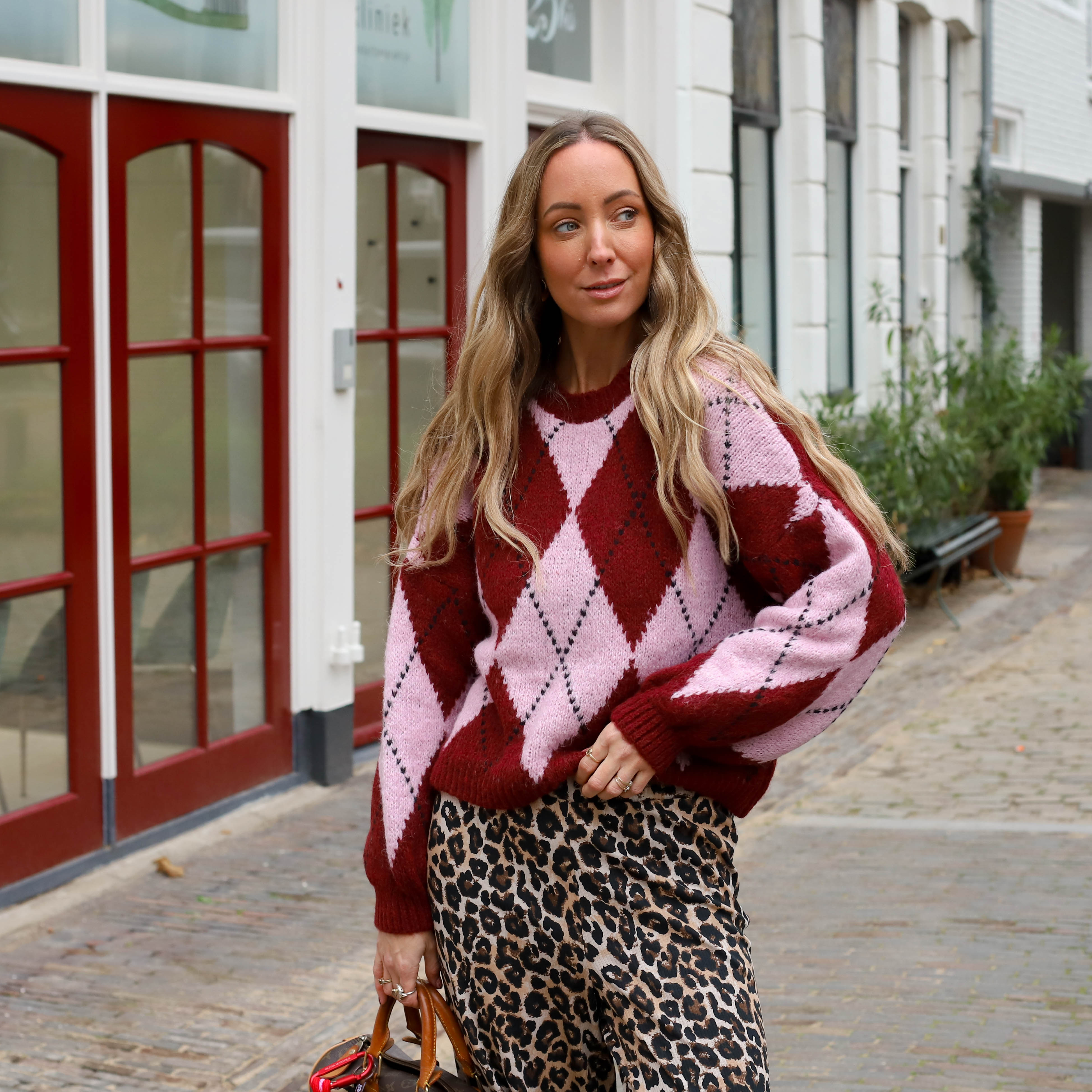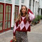 Deze Geruite Trui is een zachte en trendy knitwear. De trui heeft een opvallend ruitpatroon (Argyle) in roze en bordeauxrood. De trui heeft een klassieke ronde hals en een ruime, cropped pasvorm met opvallende ballonmouwen.