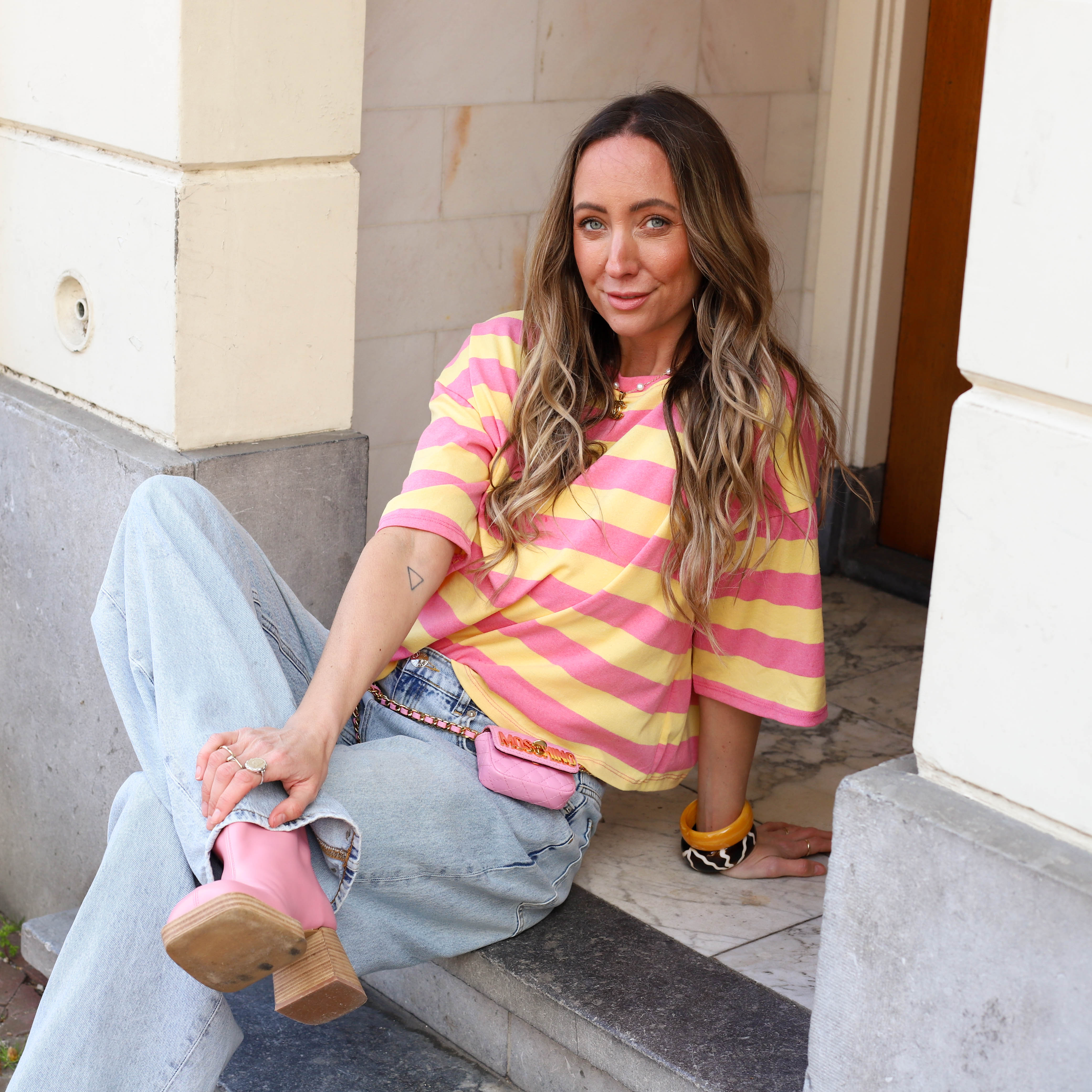 Deze gestreepte top in lichtroze en geel is een vrolijke toevoeging aan je dagelijkse rotatie. Het shirt heeft brede banen en een relaxte pasvorm met verlaagde schoudernaden, wat zorgt voor een nonchalante uitstraling. Gemaakt van een zachte katoenmix met stretch, is dit een ideale basistop voor een frisse lentedag. Makkelijk te combineren met een goede jeans of een casual rokje.