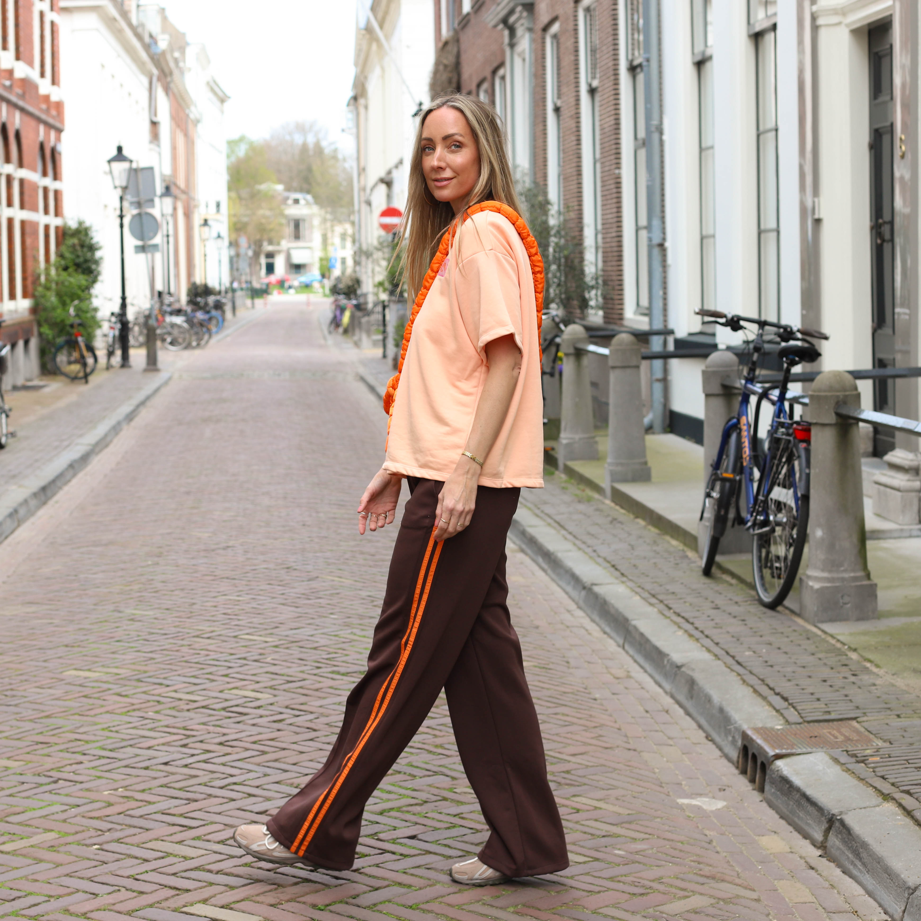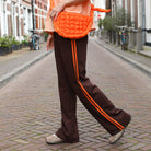 Deze bruine pantalon met oranje zijstreep is de perfecte mix van sportief en chic! De broek heeft een flatterende, licht uitlopende pijp en een opvallende dubbele bies aan de zijkant die je benen eindeloos lang laat lijken. Dankzij de soepele stof en de elastische tailleband zit hij niet alleen super fashionable, maar ook nog eens heerlijk comfortabel.