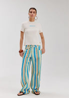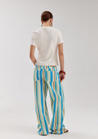 De MAYRA broek heeft een high-waisted fit met wijde pijpen en een relaxte uitstraling. De verticale strepen in verschillende blauwtinten geven de broek een frisse, opvallende look. Gemaakt van katoen en daardoor luchtig en comfortabel. Perfect te combineren met een simpele top of als set.