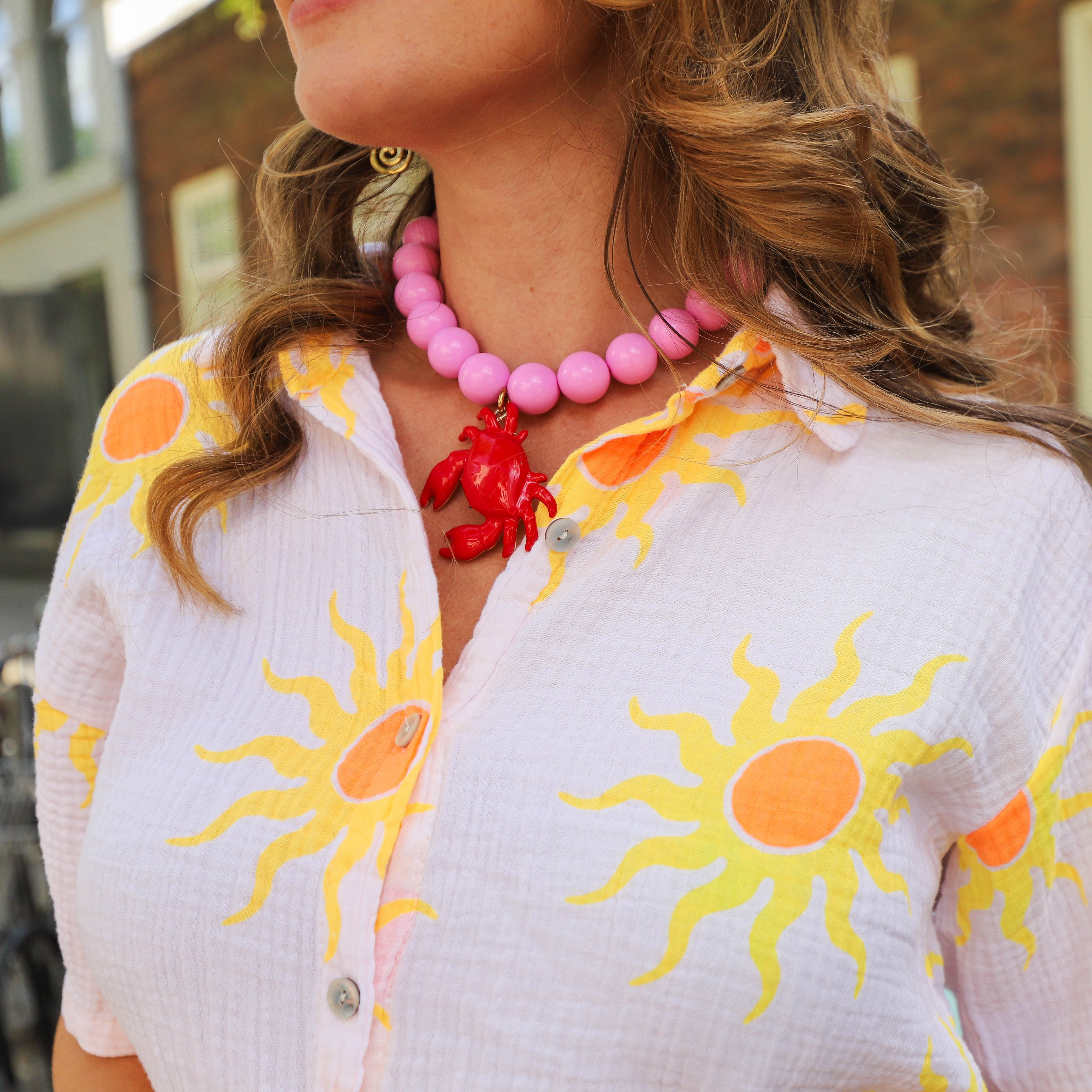 Deze heerlijke Mousseline Top Soleil is een must-have voor je zomercollectie! De top is gemaakt van een lichte en ademende stof die perfect is voor warme dagen. De vrolijke print van oranje en gele zonnen op een roze ondergrond geeft de blouse een speelse en zonnige uitstraling.
