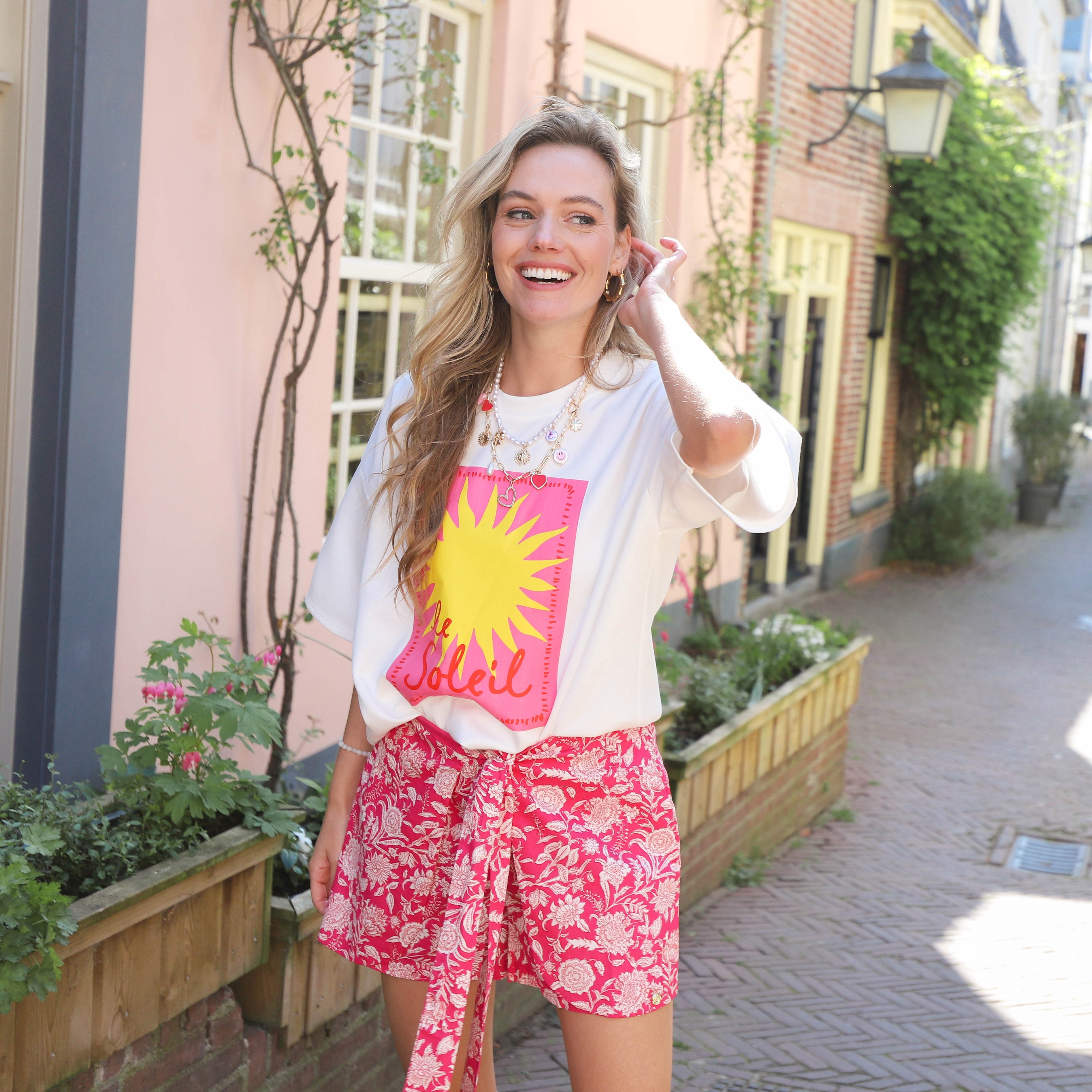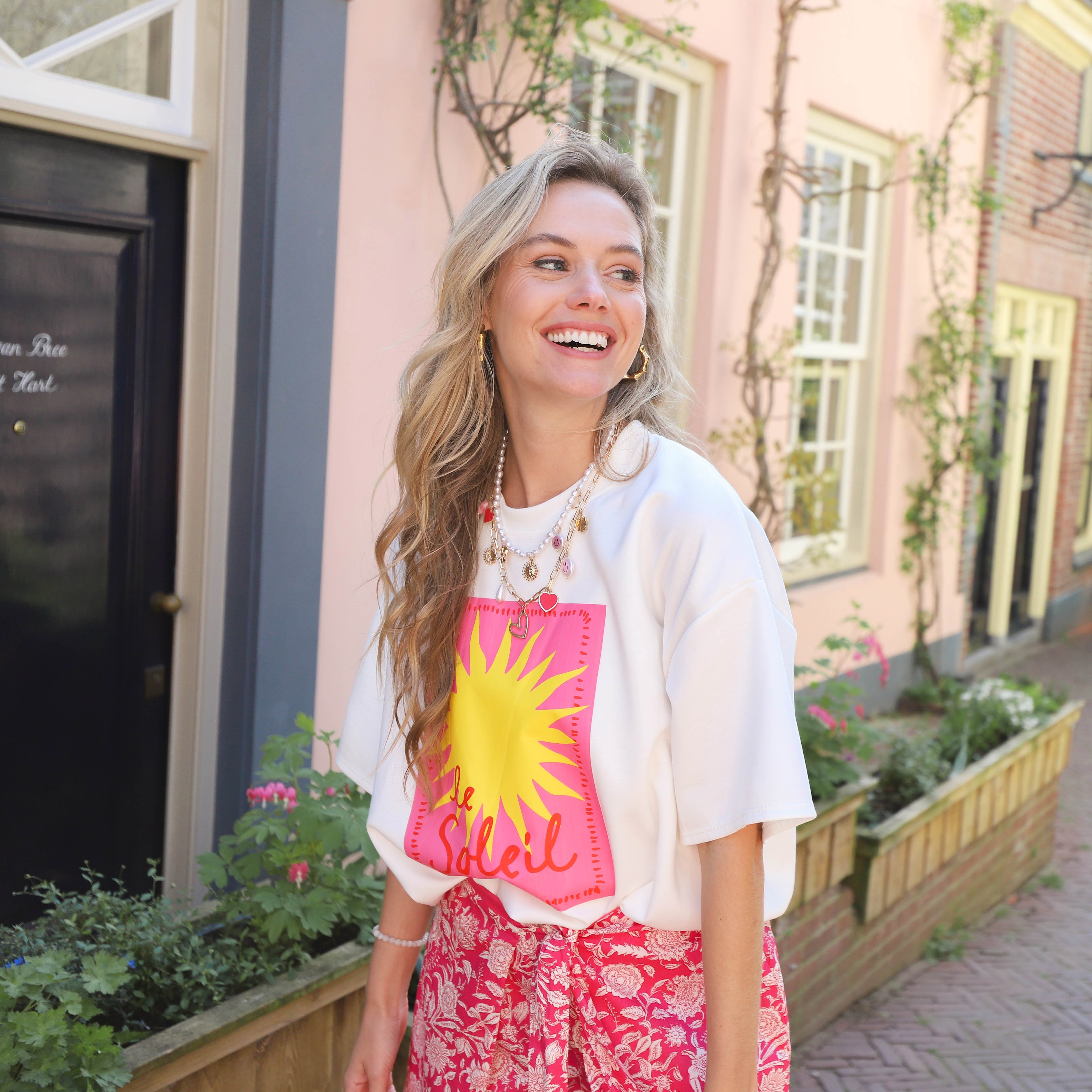 Zomer vibes all year long met dit zonnige Le Soleil T-shirt! Deze witte top met vrolijke zonprint in roze en geel straalt één en al good vibes uit – perfect voor zomerse dagen, vakantiegevoel of gewoon om een beetje zon mee te nemen in je outfit. De luchtige stof valt soepel en voelt heerlijk zacht aan. Gemaakt van een comfortabele mix van polyester, viscose en elastaan – stretchy én ademend.