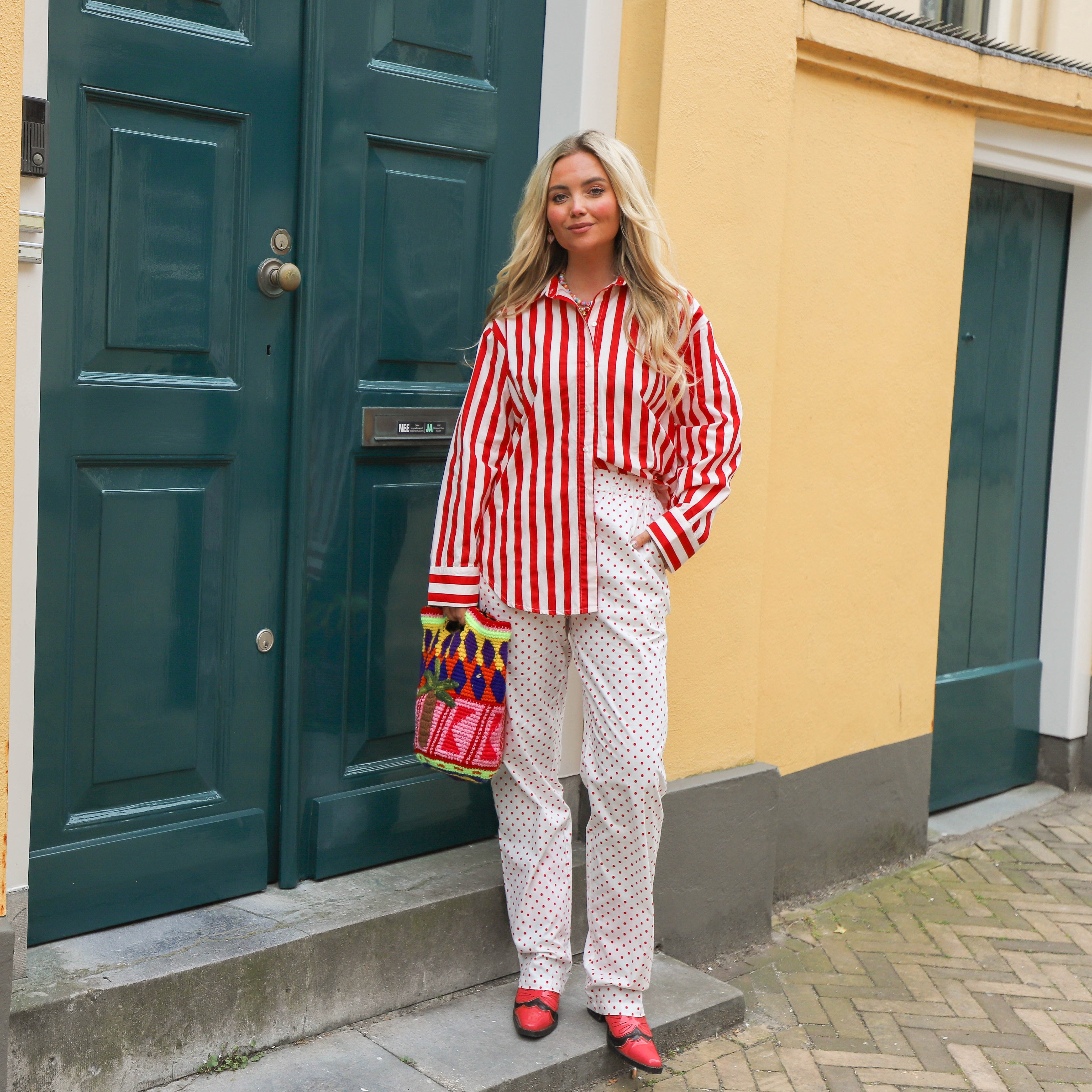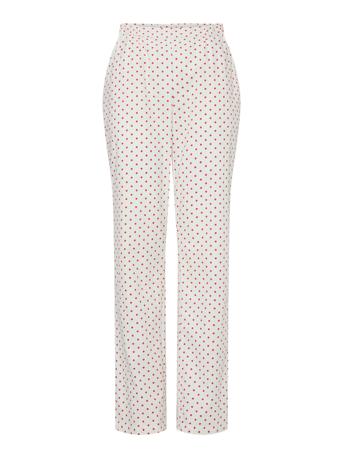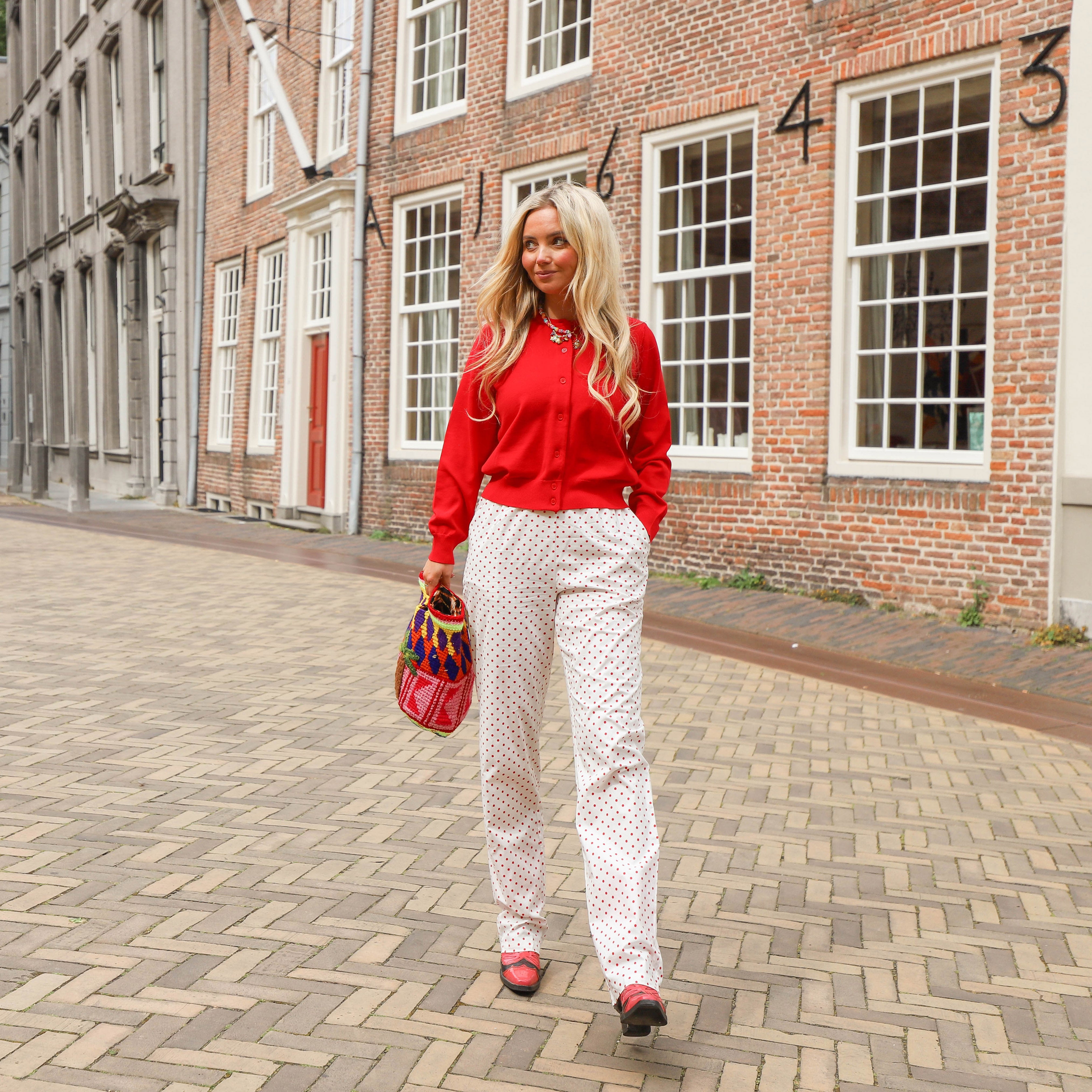 Mooie high waisted wijde broek met rechte pijpen. De broek heeft een rode stipjesprint en een getailleerde band, waardoor hij altijd mooi aangesloten zit. Combineer met een leuke blouse of vest.