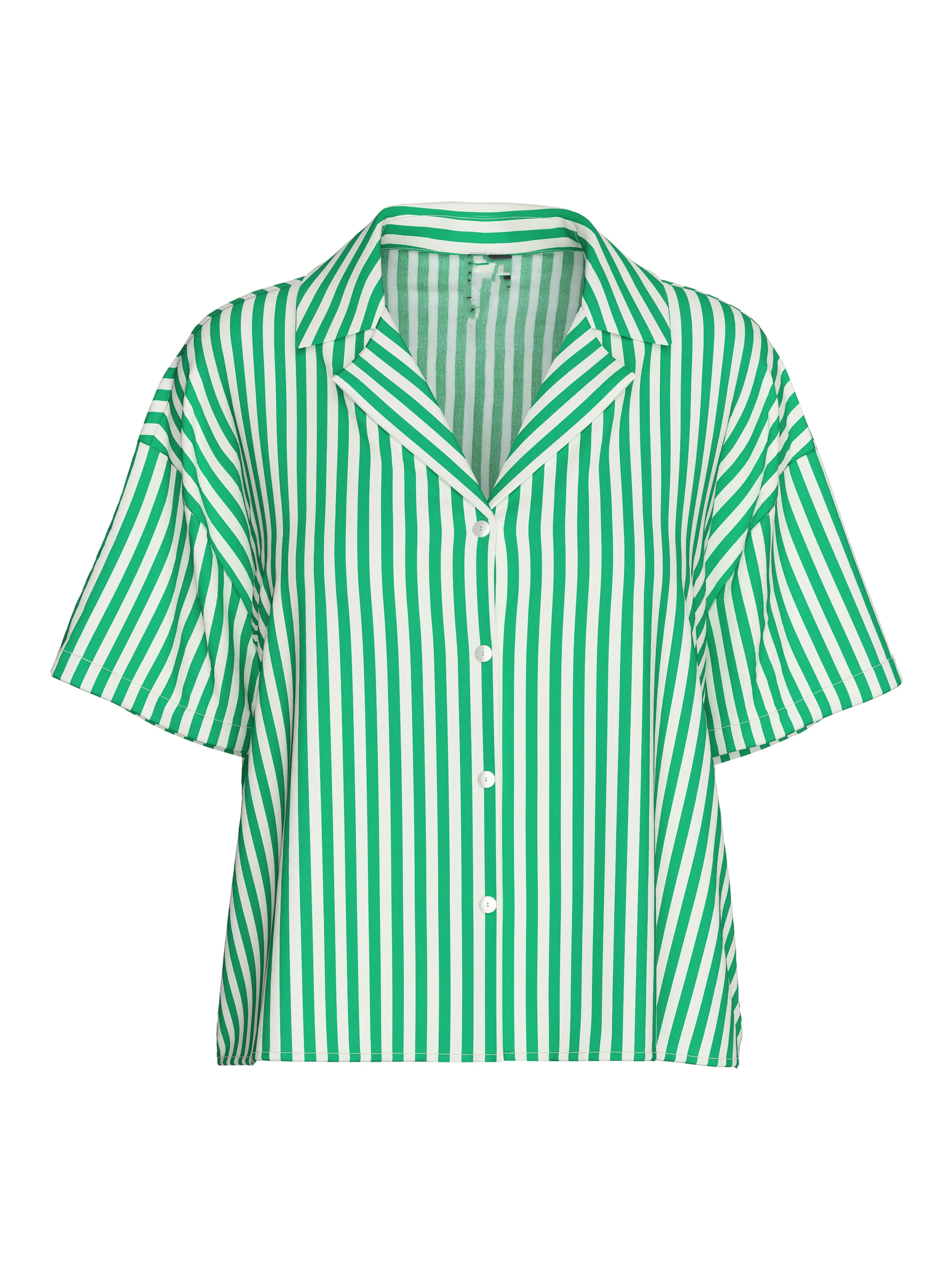 Deze stijlvolle blouse met een trendy groene witte streepjes print is een must-have voor je garderobe. De blouse is gemaakt van 100% EcoVero™ Lenzing viscose, wat zorgt voor een soepele en duurzame kwaliteit. Perfect om je outfit een modieuze touch te geven!