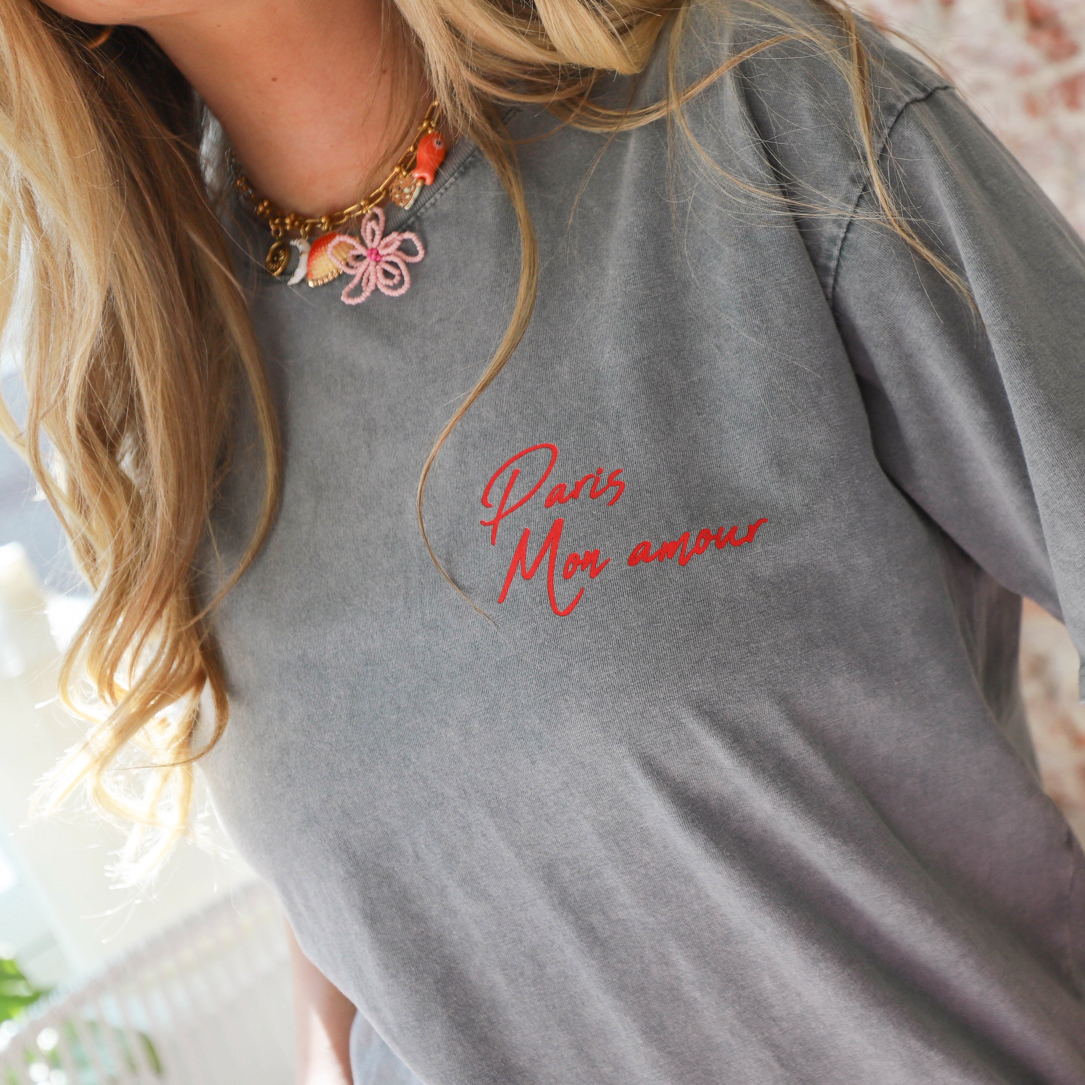 Dit grijze T-shirt straalt een relaxte, vintage vibe uit. Het shirt heeft een subtiele 'Paris Mon Amour' opdruk in rood, wat zorgt voor een speelse touch. Een perfecte aanvulling op je casual garderobe.