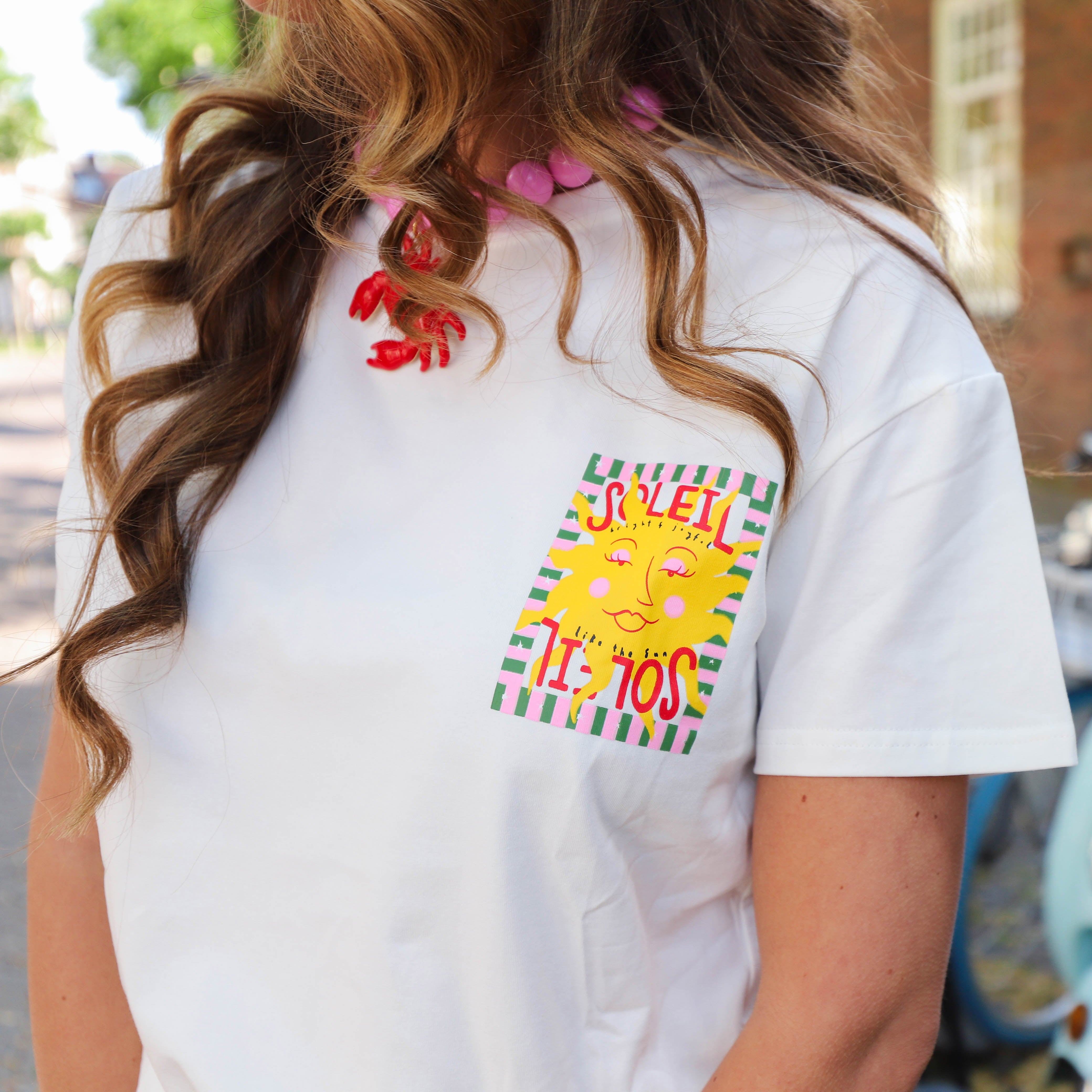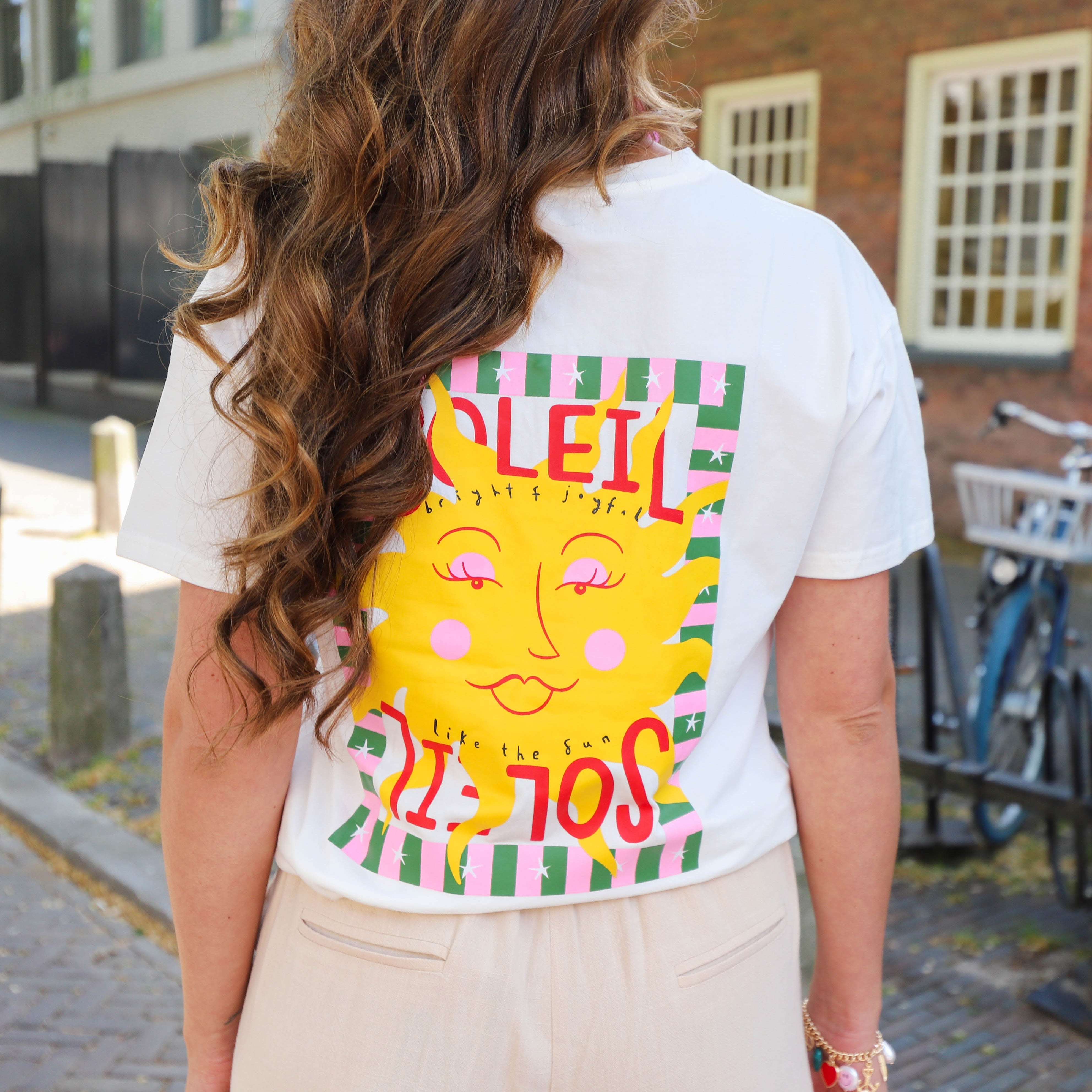 Deze comfortabele Sunny Soleil Tee Ecru is een absolute must-have voor de zomer! Het ecru T-shirt is voorzien van een vrolijke zonne-print op de borst, wat zorgt voor een zonnige en speelse uitstraling.