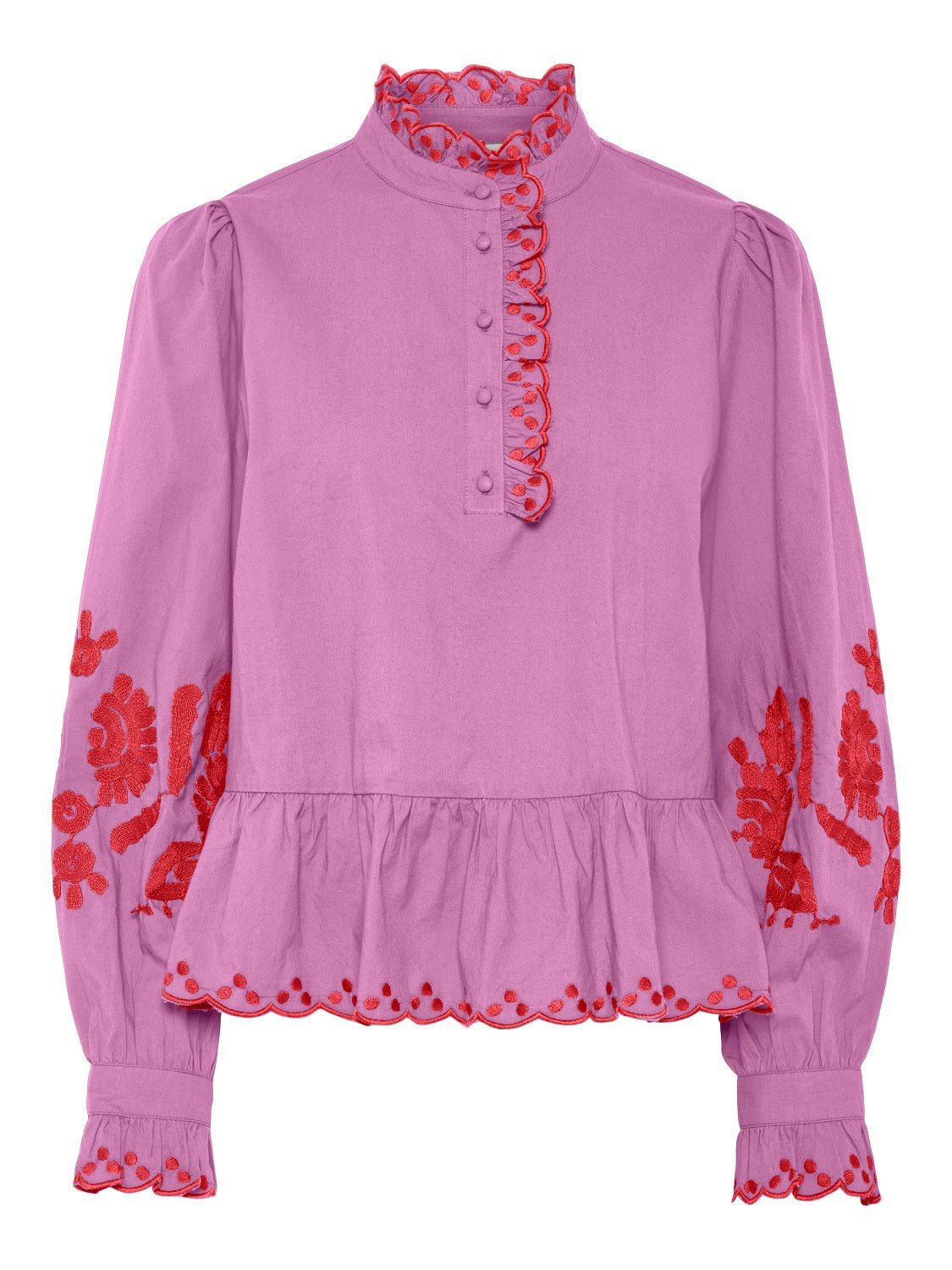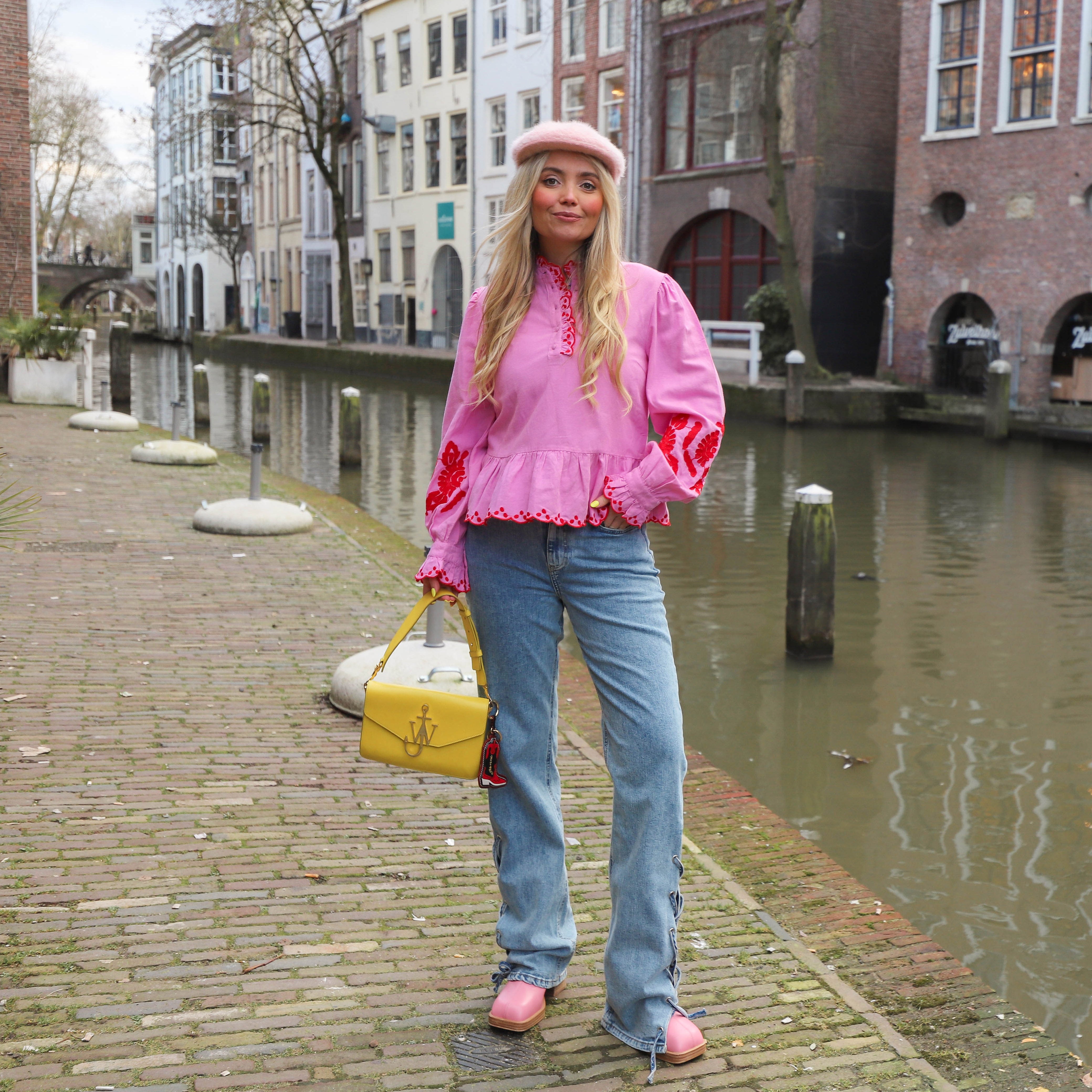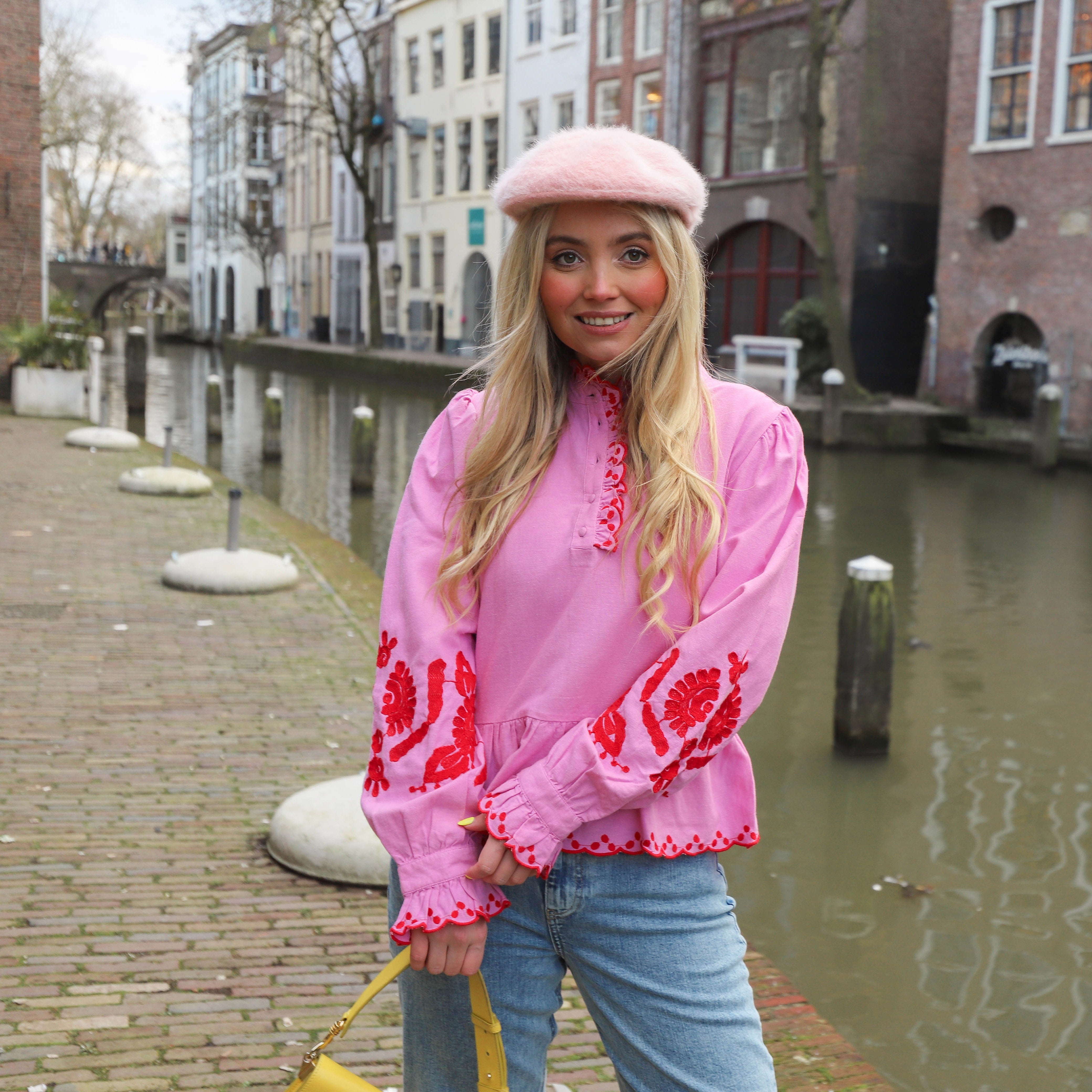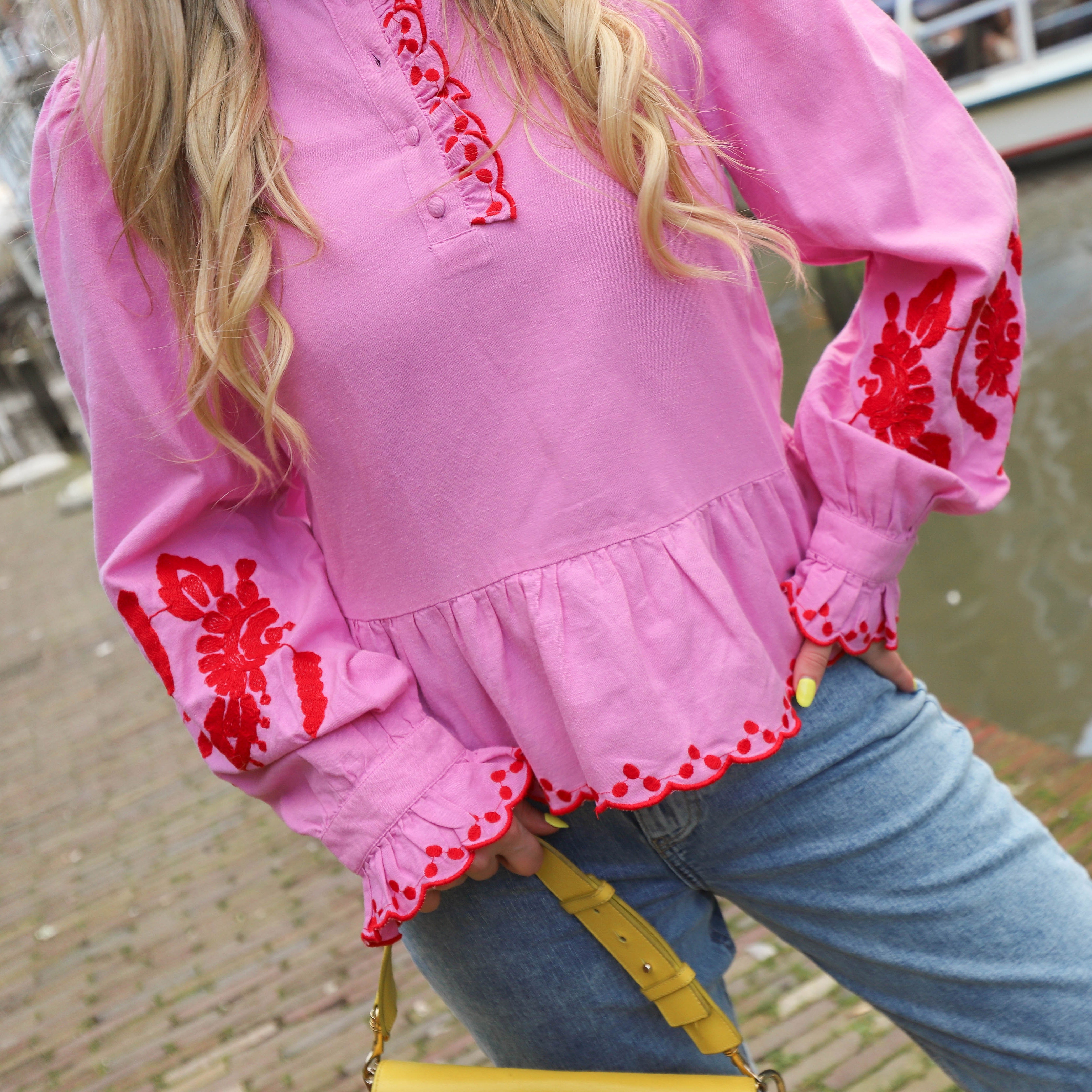 Deze mooie, roze top met kanten details is perfect voor een speciale gelegenheid of een avondje uit. De top heeft een hoge hals en lange mouwen, waardoor hij elegant en stijlvol is. De kanten details geven de top een vrouwelijke en verfijnde uitstraling. Ook leuk met een gilet.