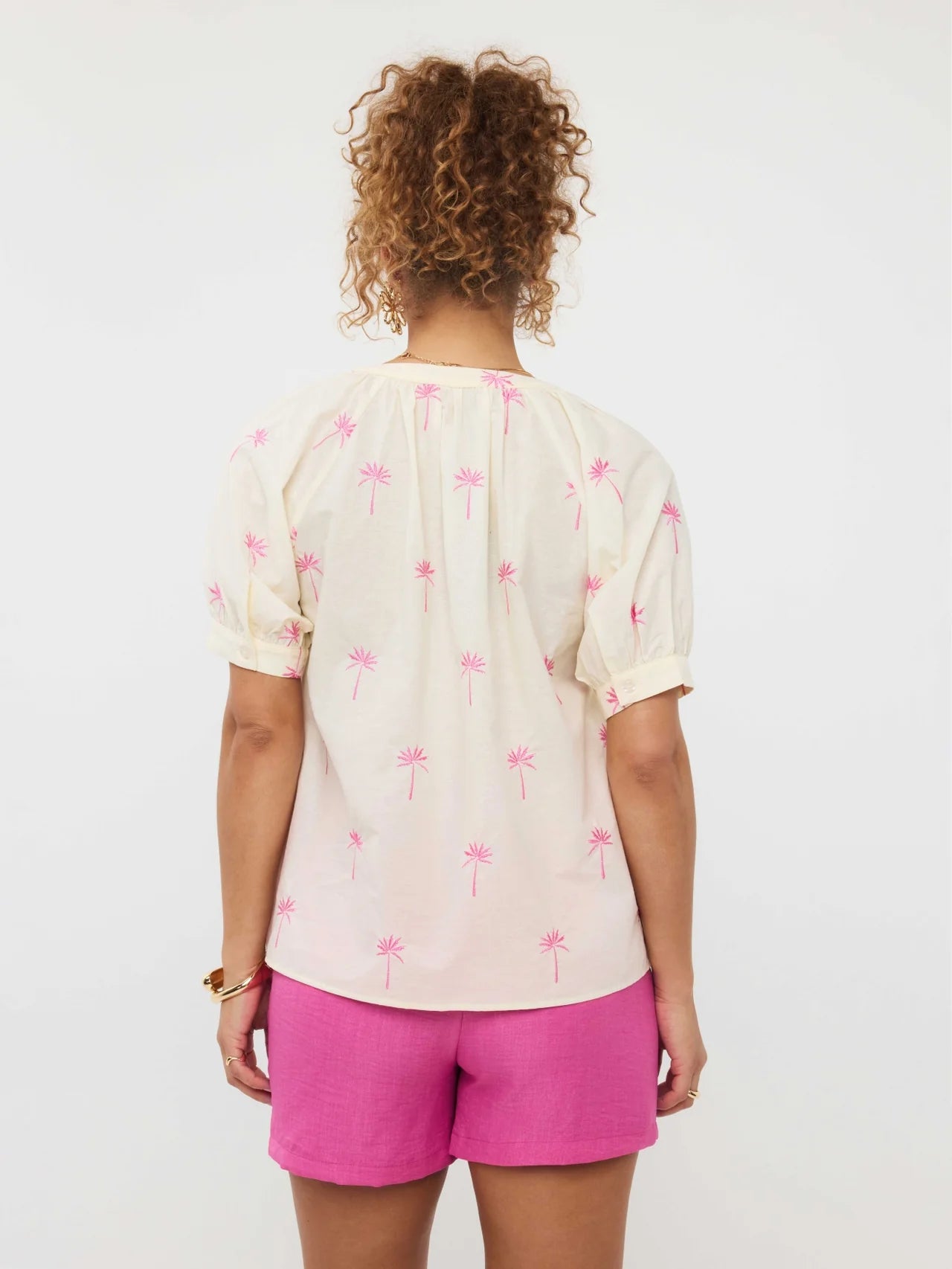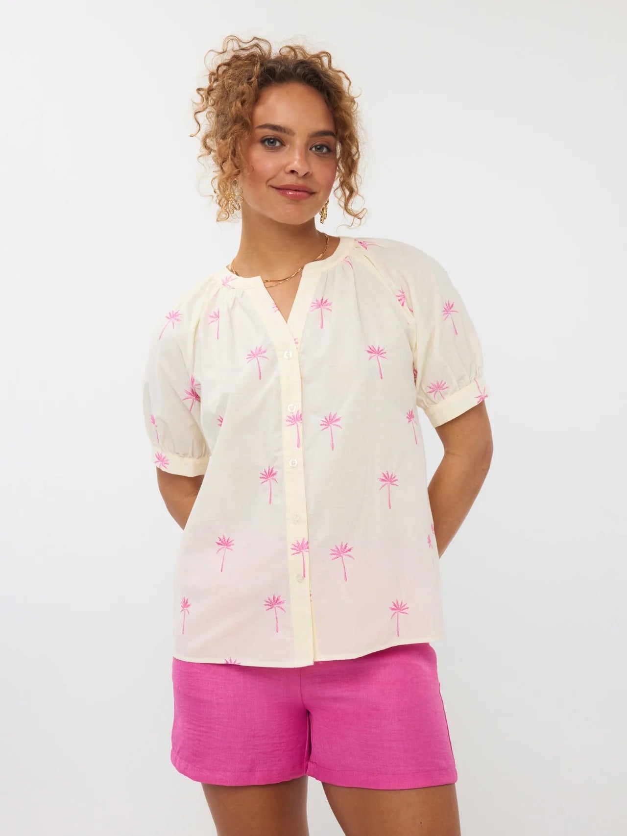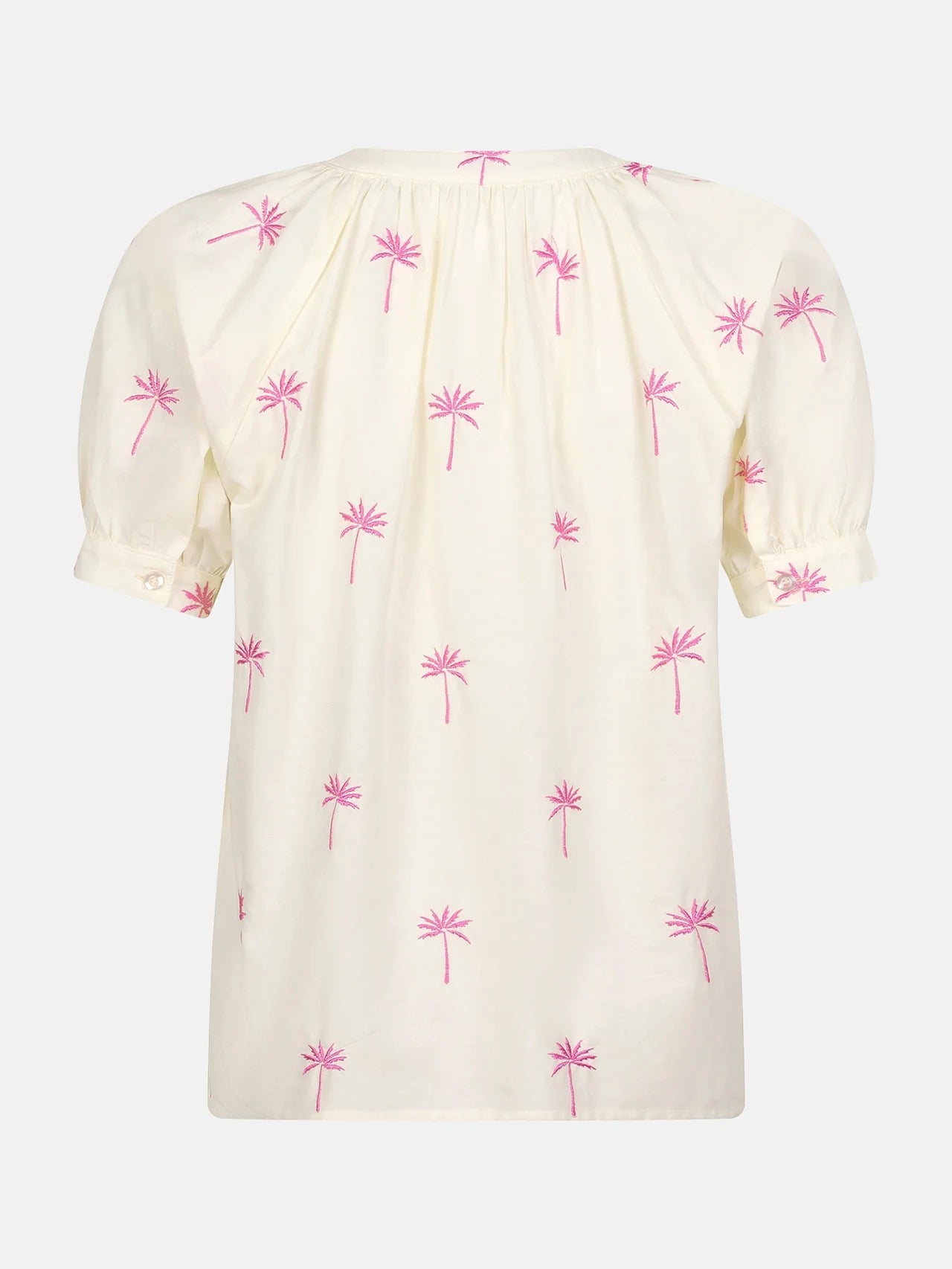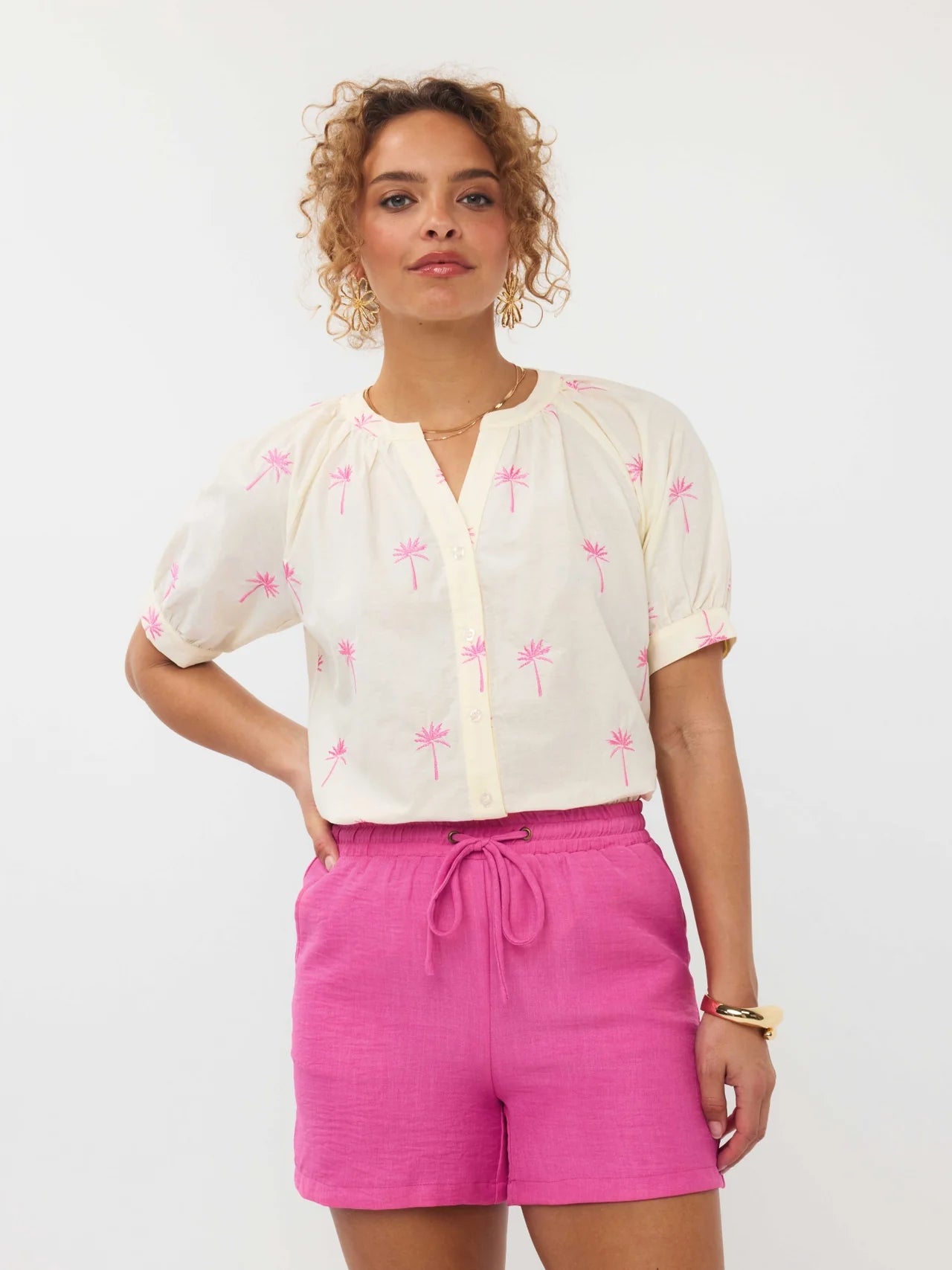 Blouse Lian is een leuke katoenen blouse met korte pofmouwen en geborduurde palmbomen op de stof. De blouse heeft een rechte pasvorm en sluit met een knoopsluiting aan de voorzijde. De totale lengte van blouse Lian is 61 cm in maat S