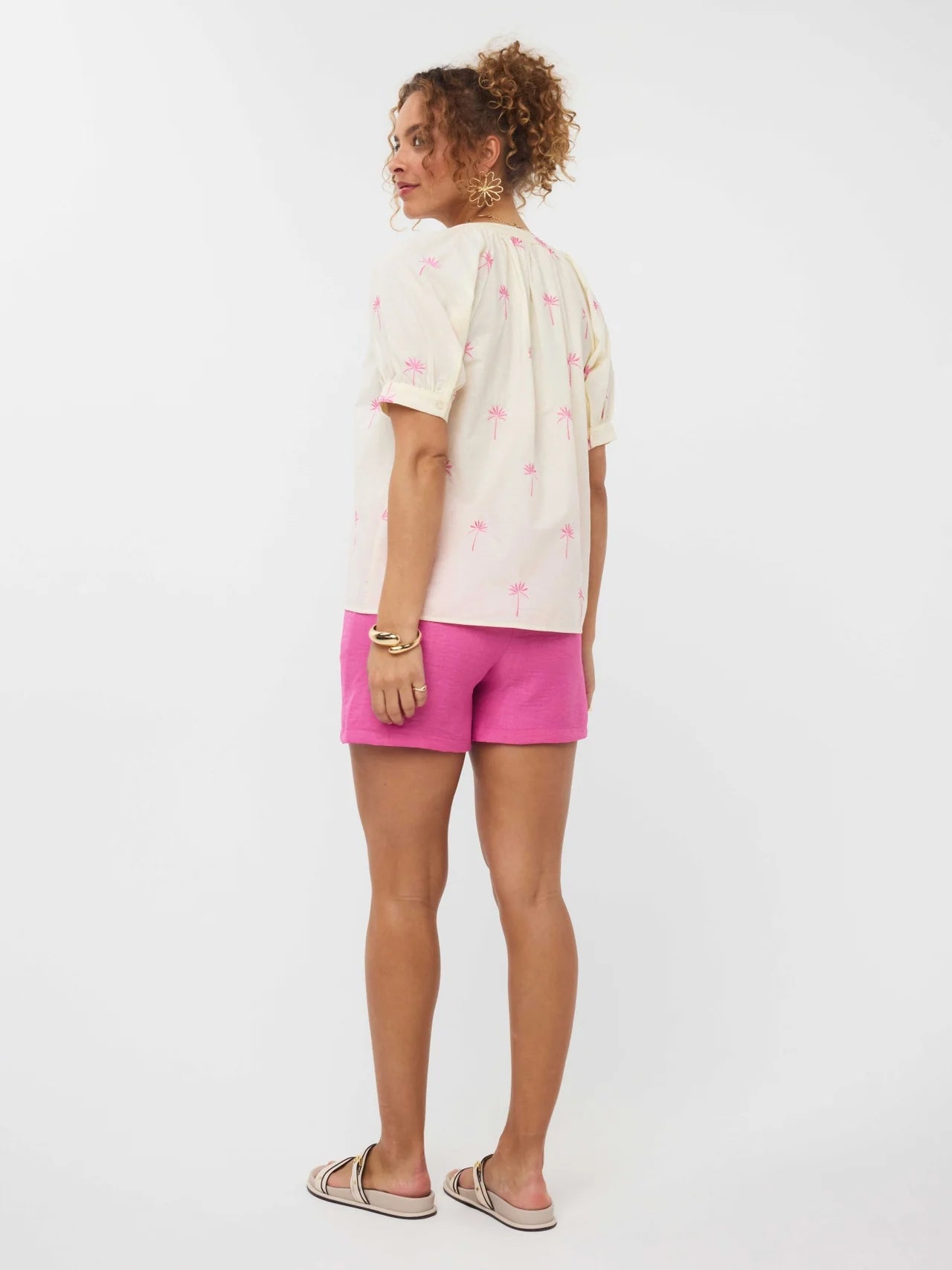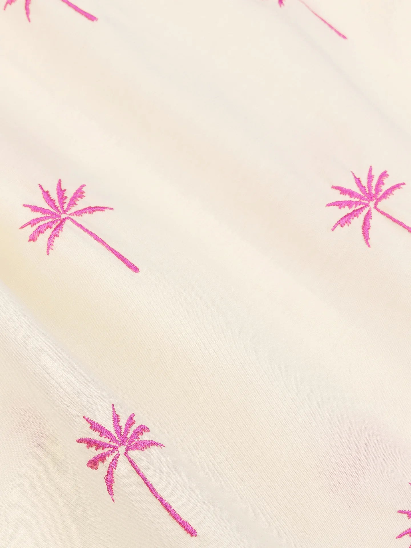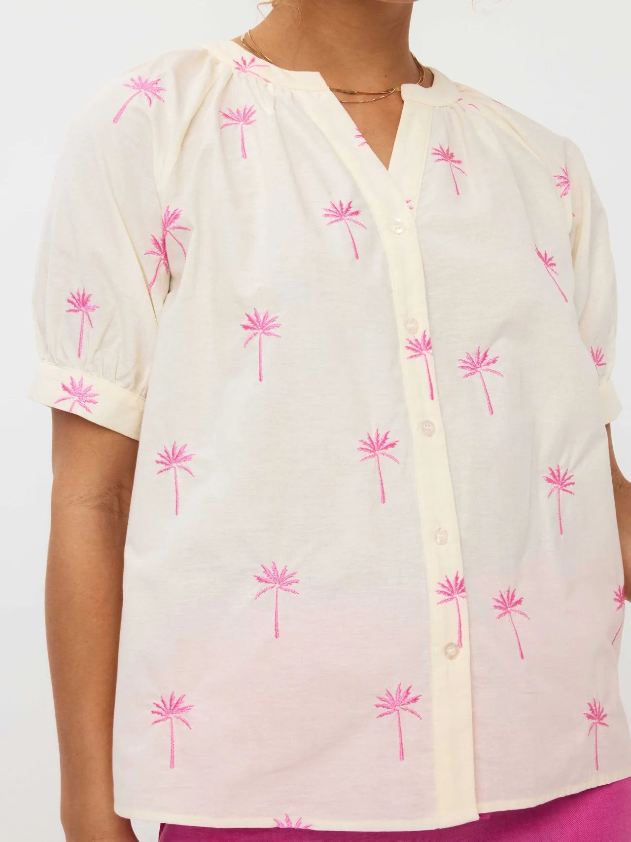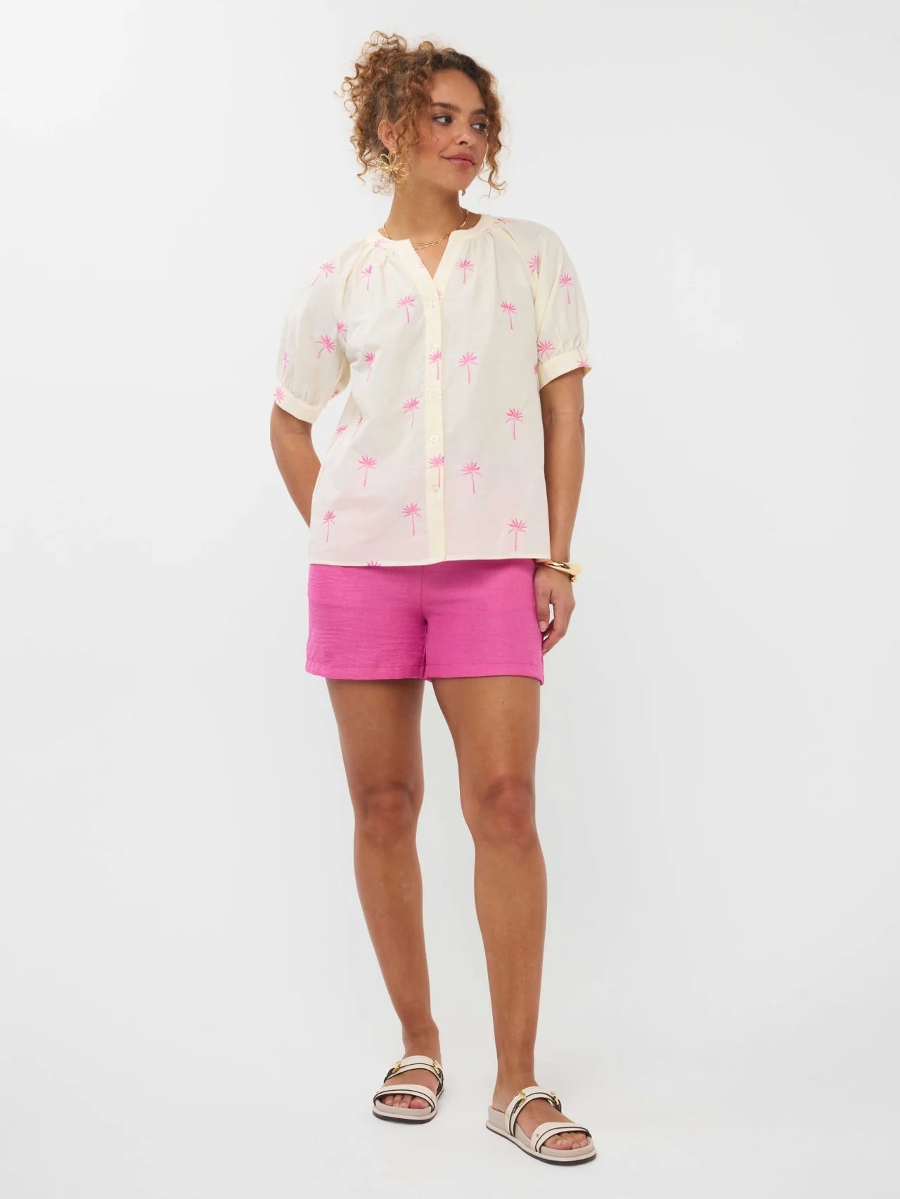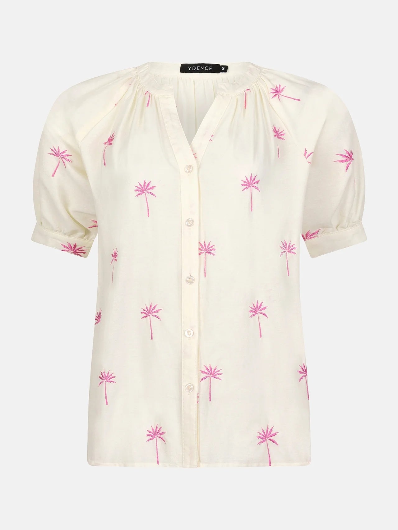 Blouse Lian is een leuke katoenen blouse met korte pofmouwen en geborduurde palmbomen op de stof. De blouse heeft een rechte pasvorm en sluit met een knoopsluiting aan de voorzijde. De totale lengte van blouse Lian is 61 cm in maat S
