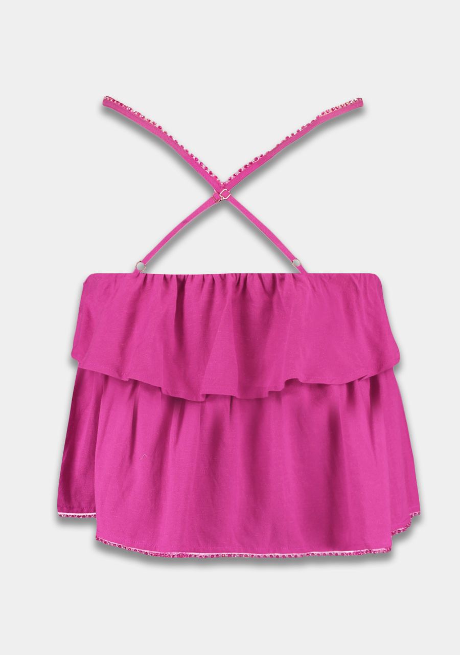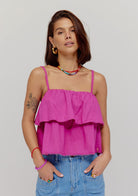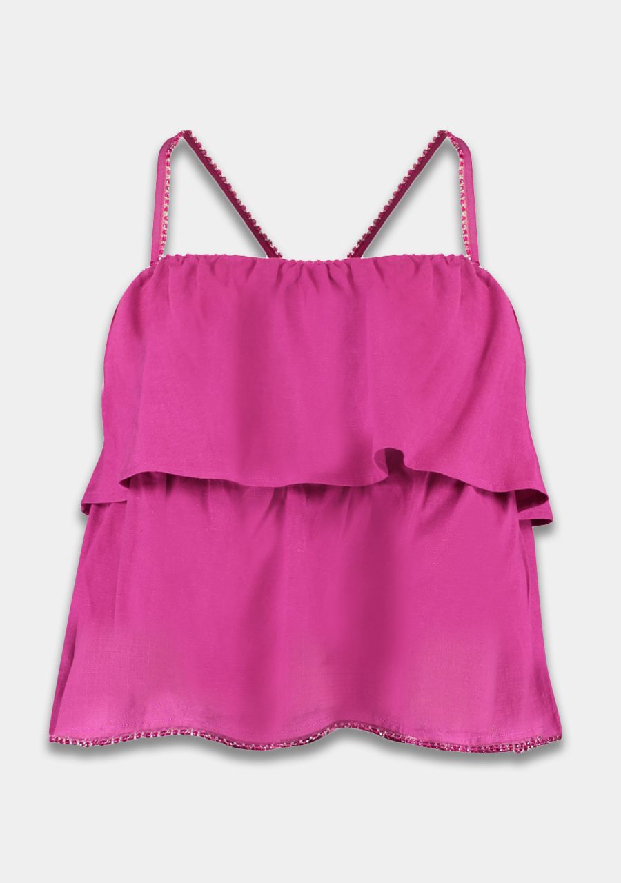 Deze speelse top met dubbele rufflelaag en glitterbandjes is een instant zomerfavoriet. Het luchtige materiaal en de rechte pasvorm zorgen voor een comfy fit die je zowel overdag als 's avonds laat stralen. Add a pop of color to your wardrobe.