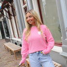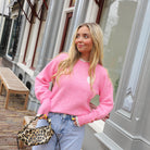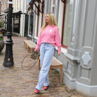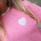 Deze schattige roze trui is een echte eyecatcher! De trui is afgewerkt met een lieflijk wit kanten kraagje en een schattig wit hartje met kant op de borst. De mouwen hebben trendy knoopjesdetail. De trui heeft een comfortabele pasvorm en is perfect voor een casual look. Combineer hem met een jeans of rok voor een stijlvolle outfit.