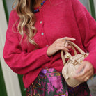 Dit vrolijke Peggy vest in een heldere fuchsia kleur is een heerlijk zachte en opvallende toevoeging aan je collectie. Het vest heeft een licht pluizige textuur. Het vest heeft een klassieke ronde hals, een knoopsluiting met lichte knoopjes en een wijde, boxy fit.