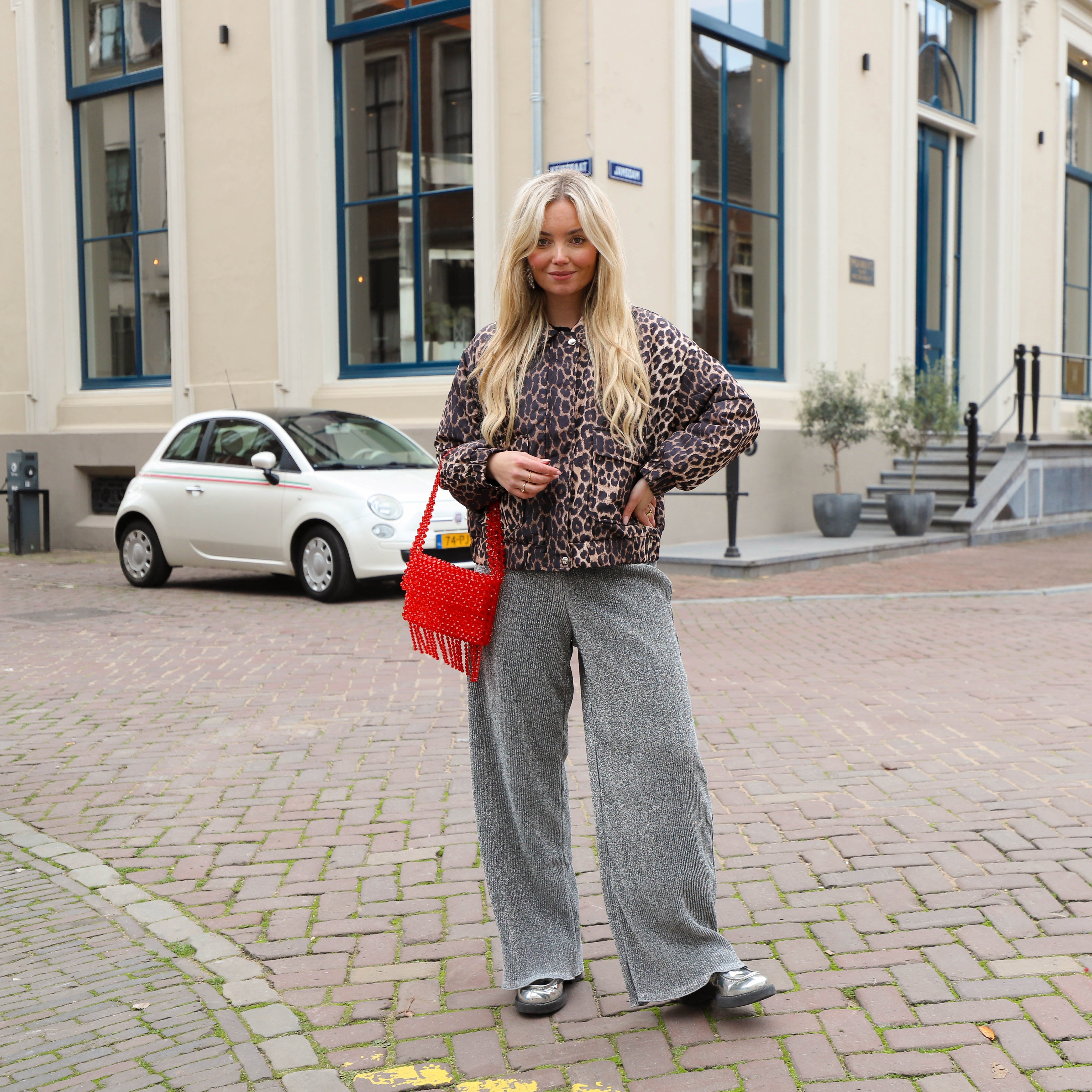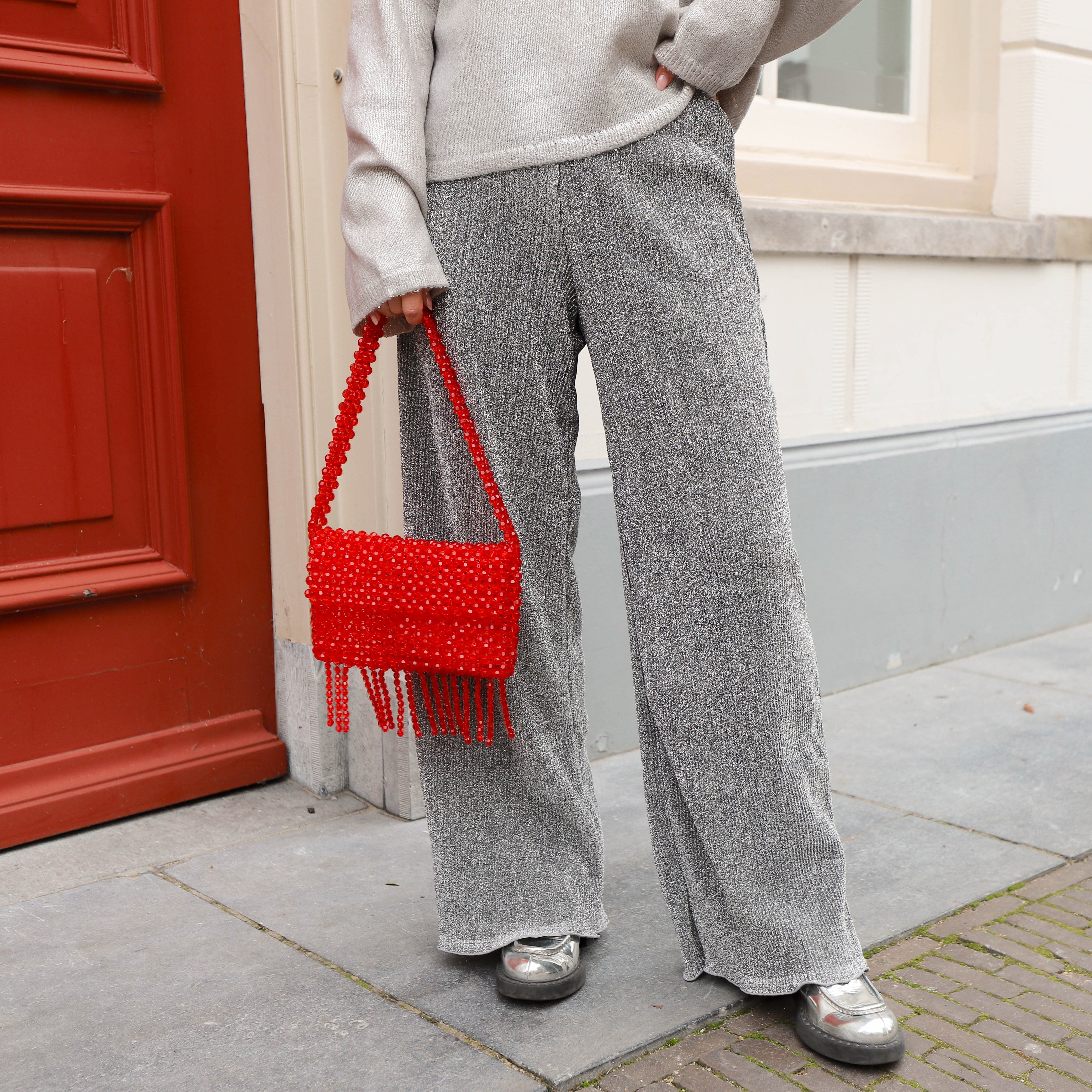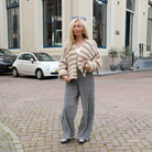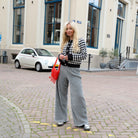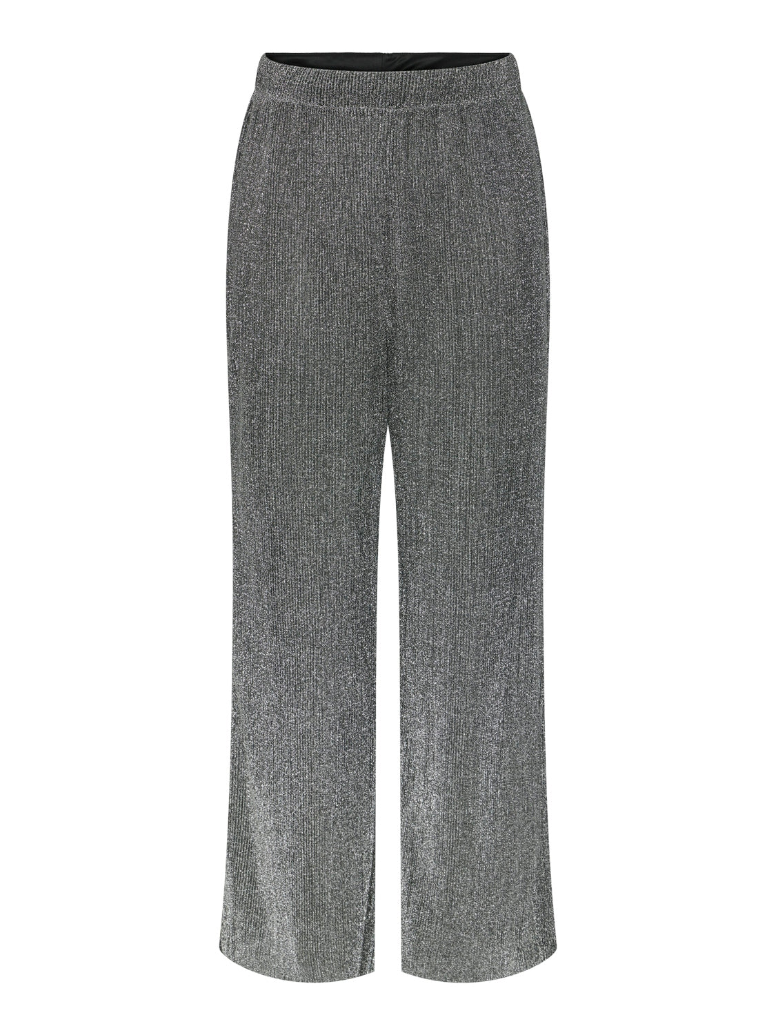 Mooie zilveren broek met een glimmend effect. De broek heeft wijde pijpen en een hoge taille. Staat leuk met een trui, vest of top.