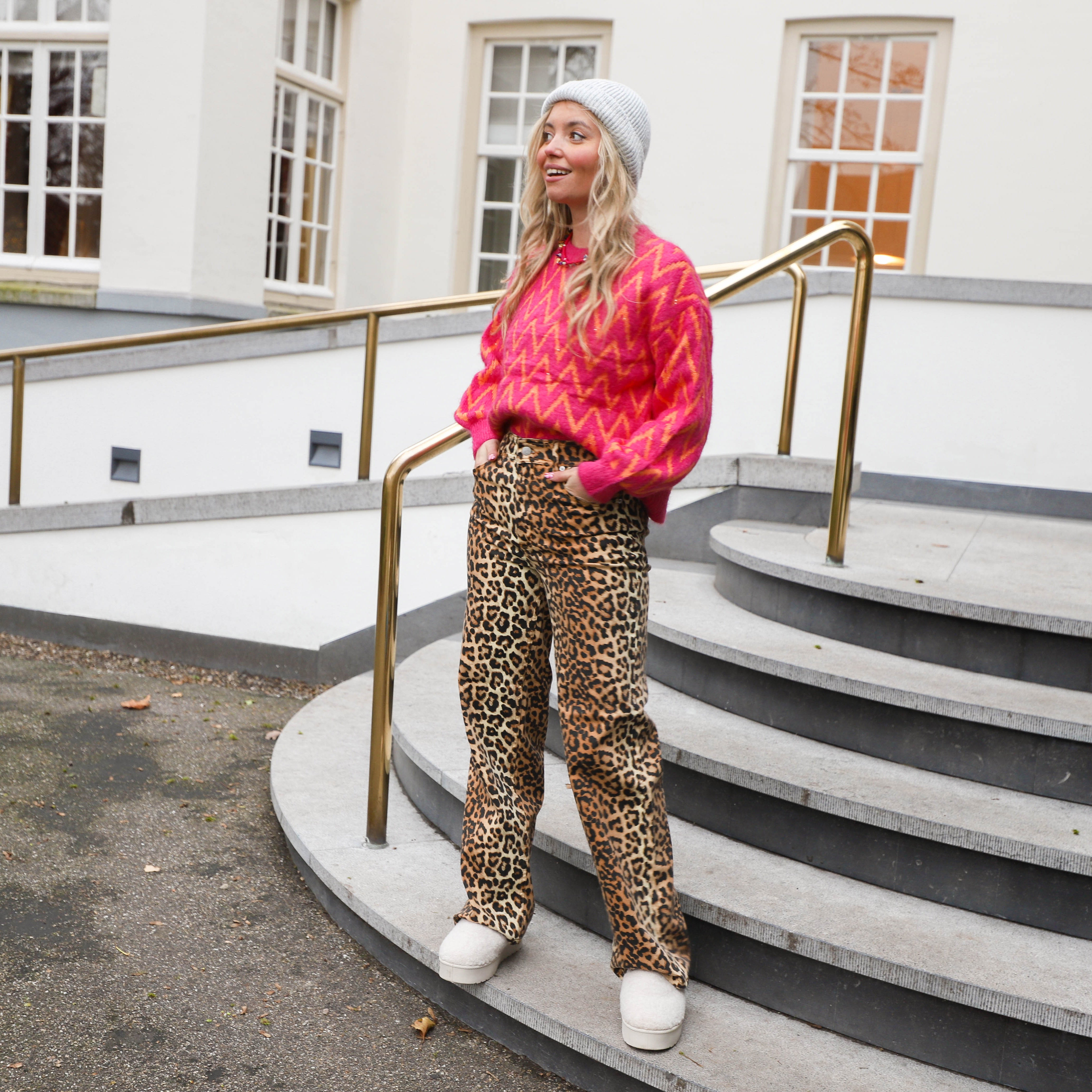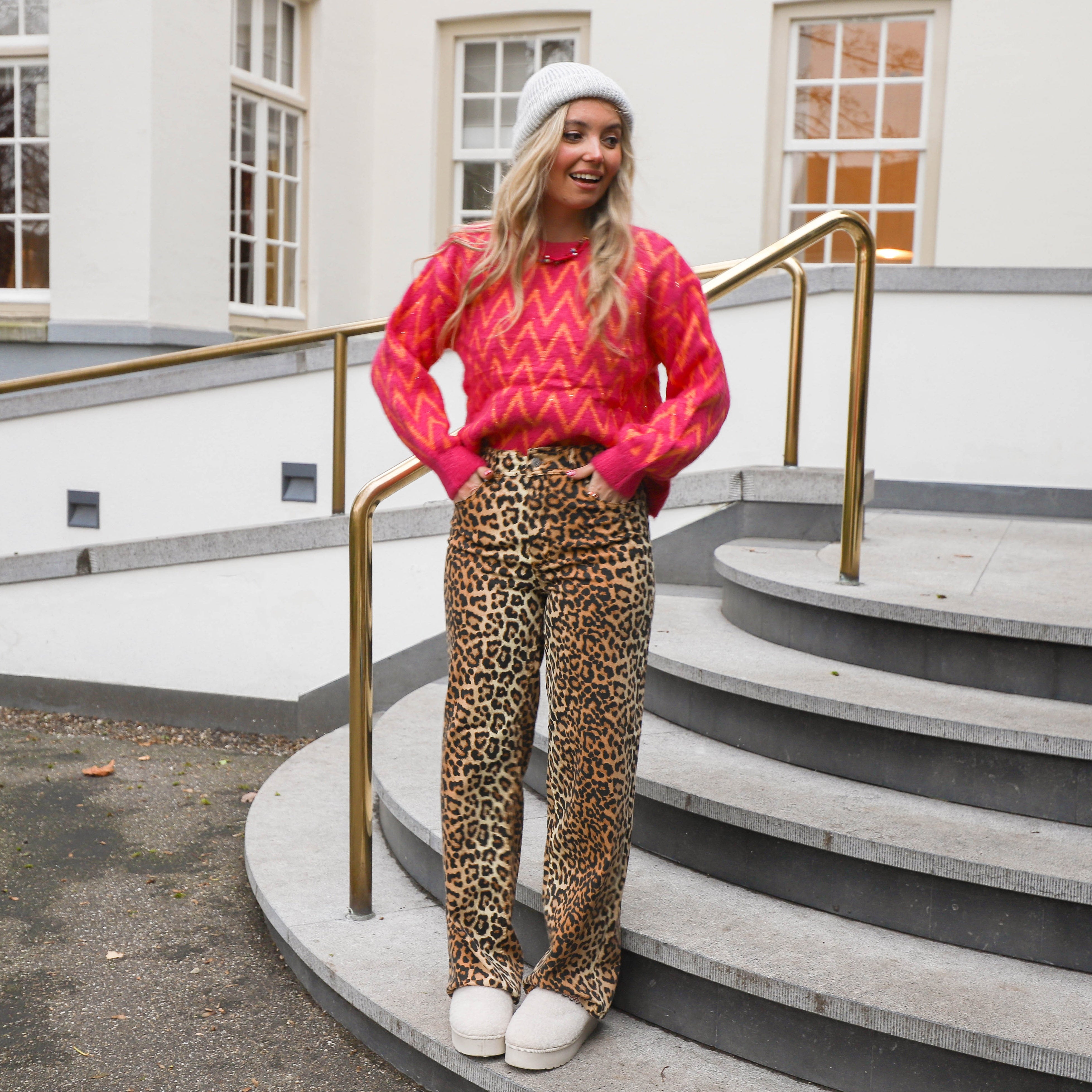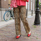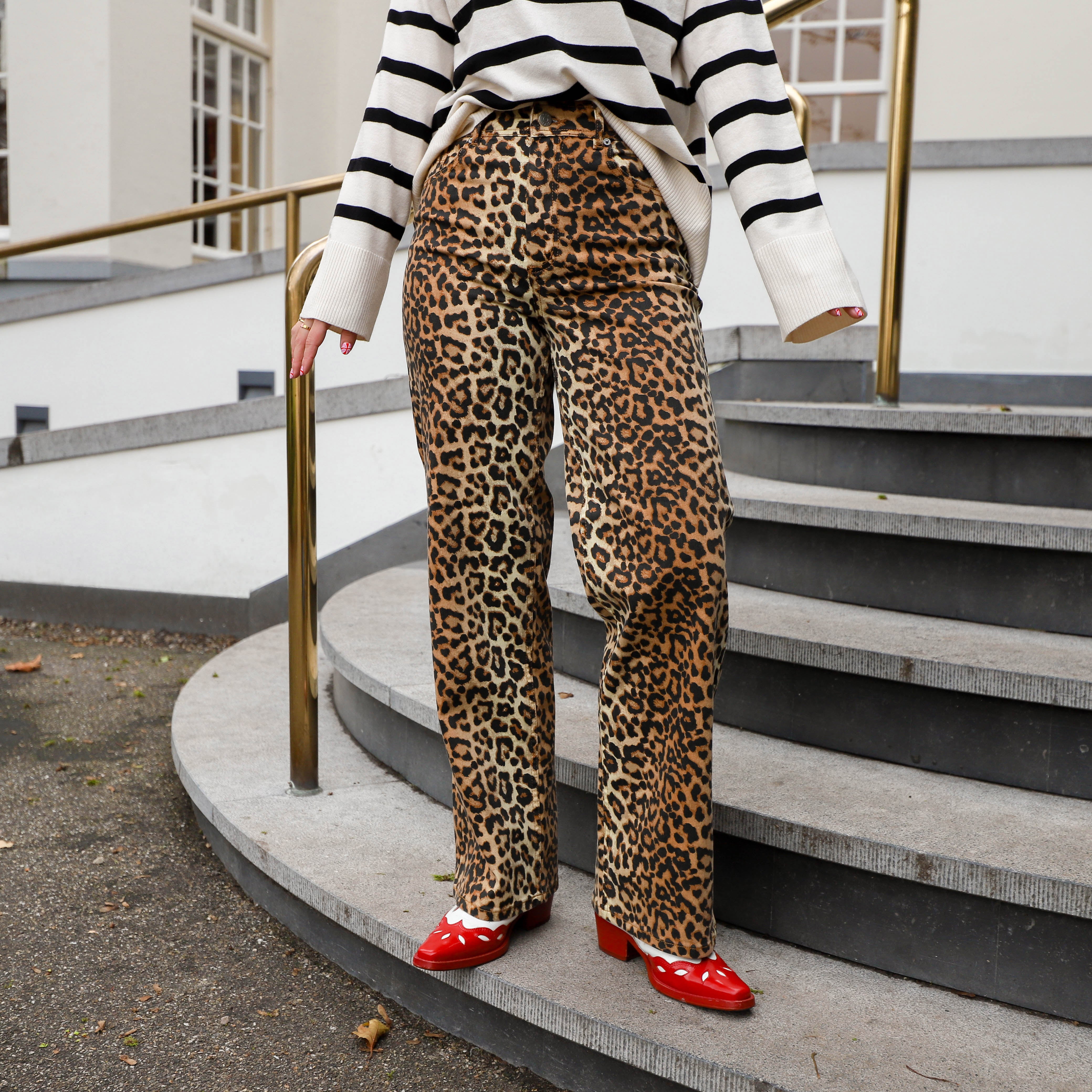 Mooie jeans met leopard print. De broek heeft een hoge taille, een wide fit en staat leuk met een blouse of trui.