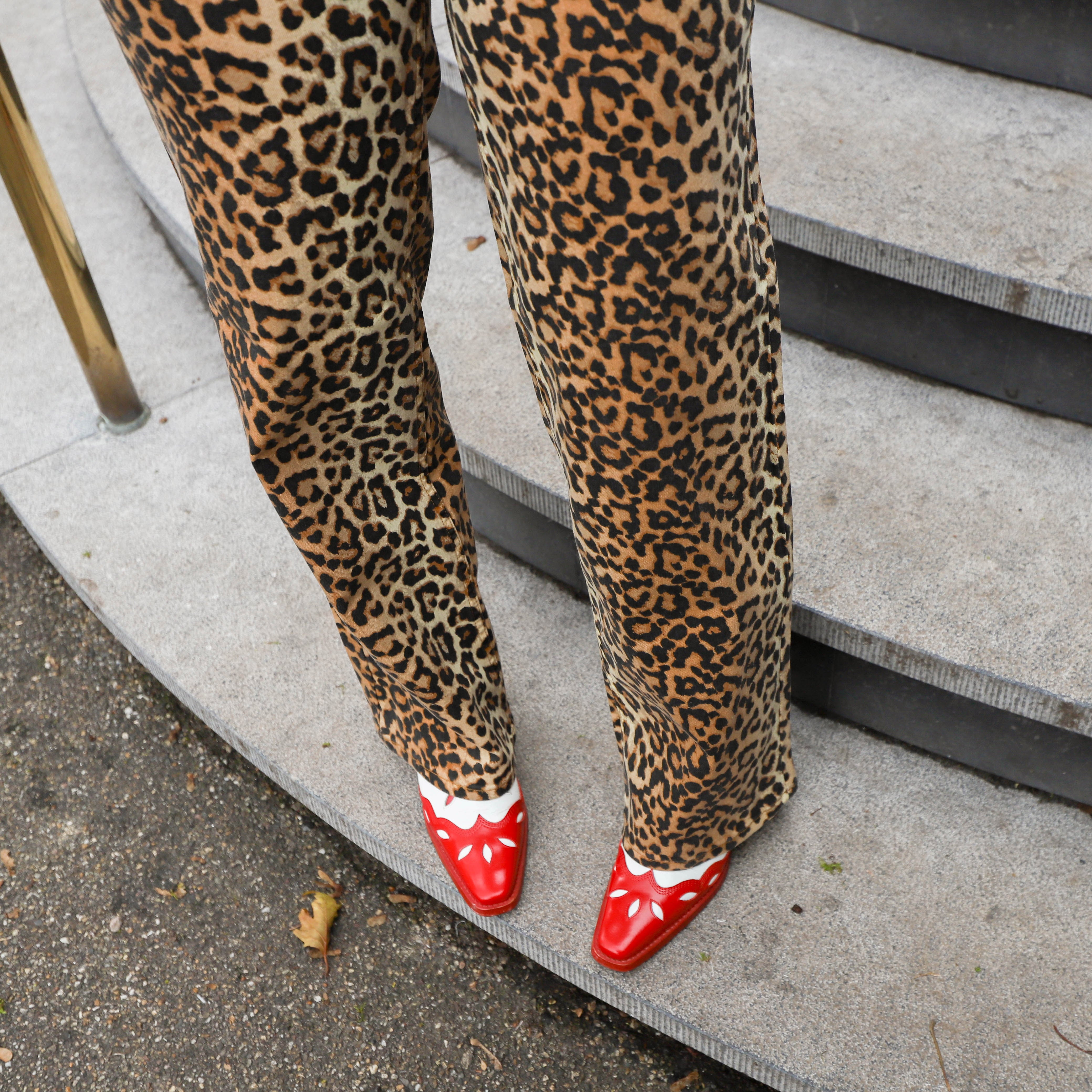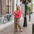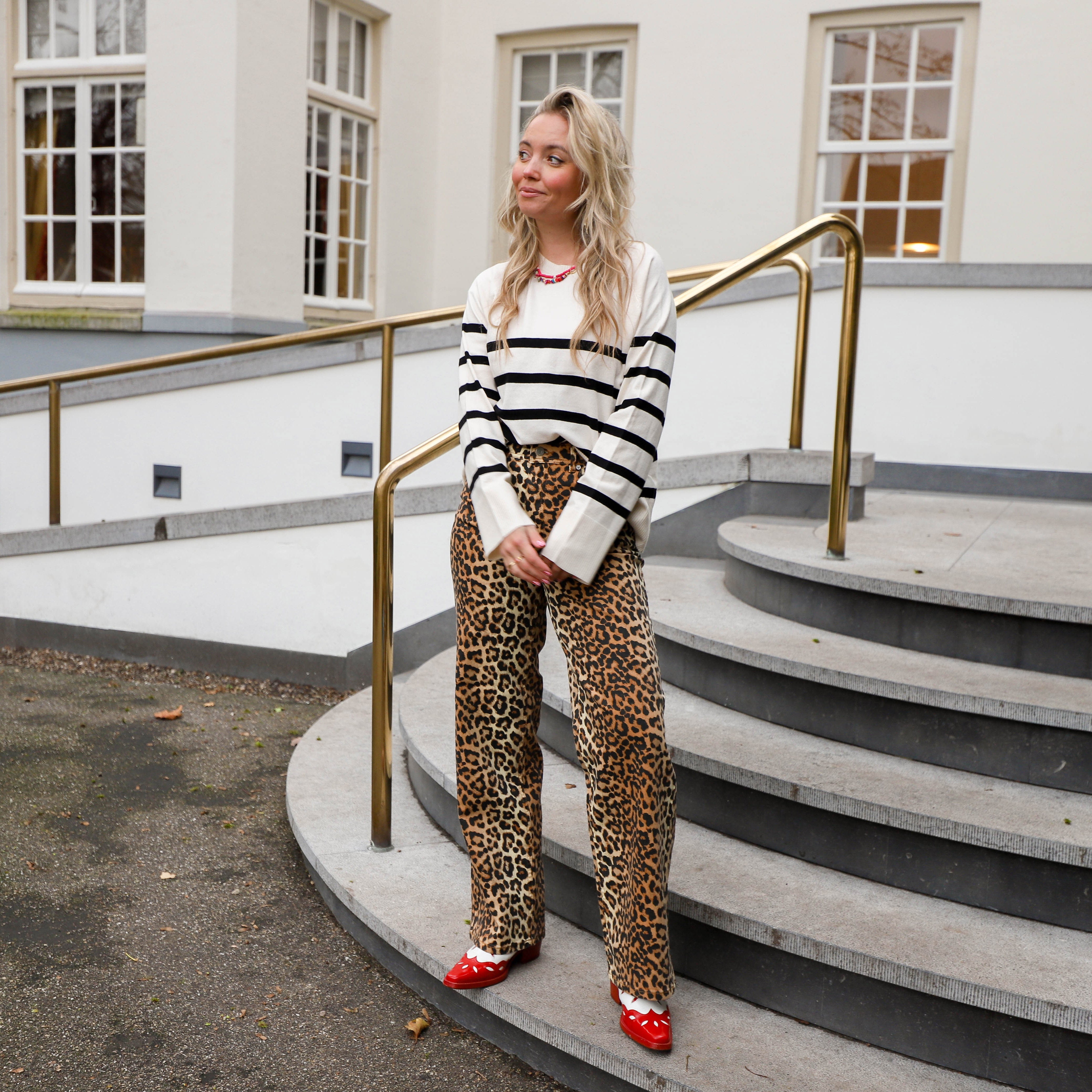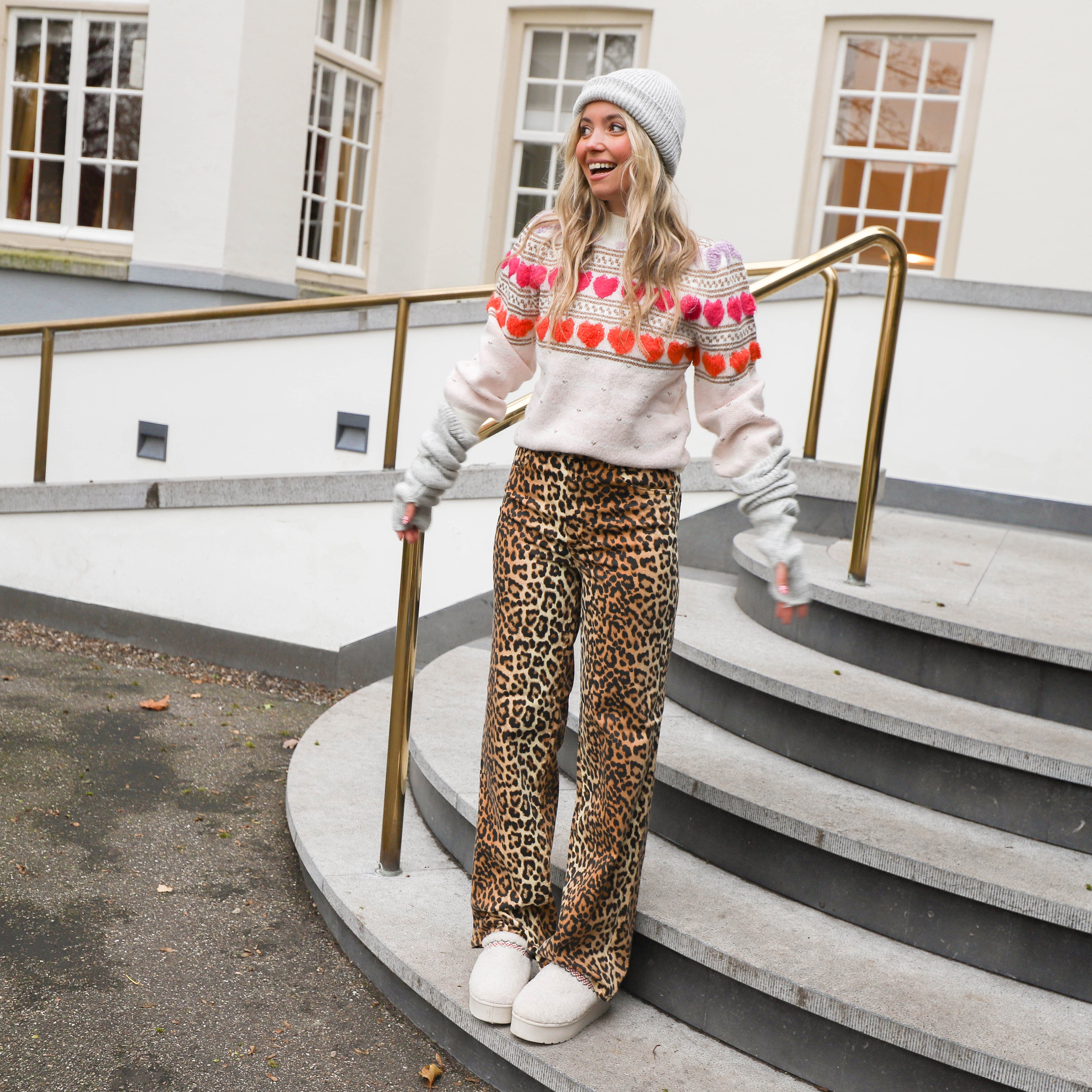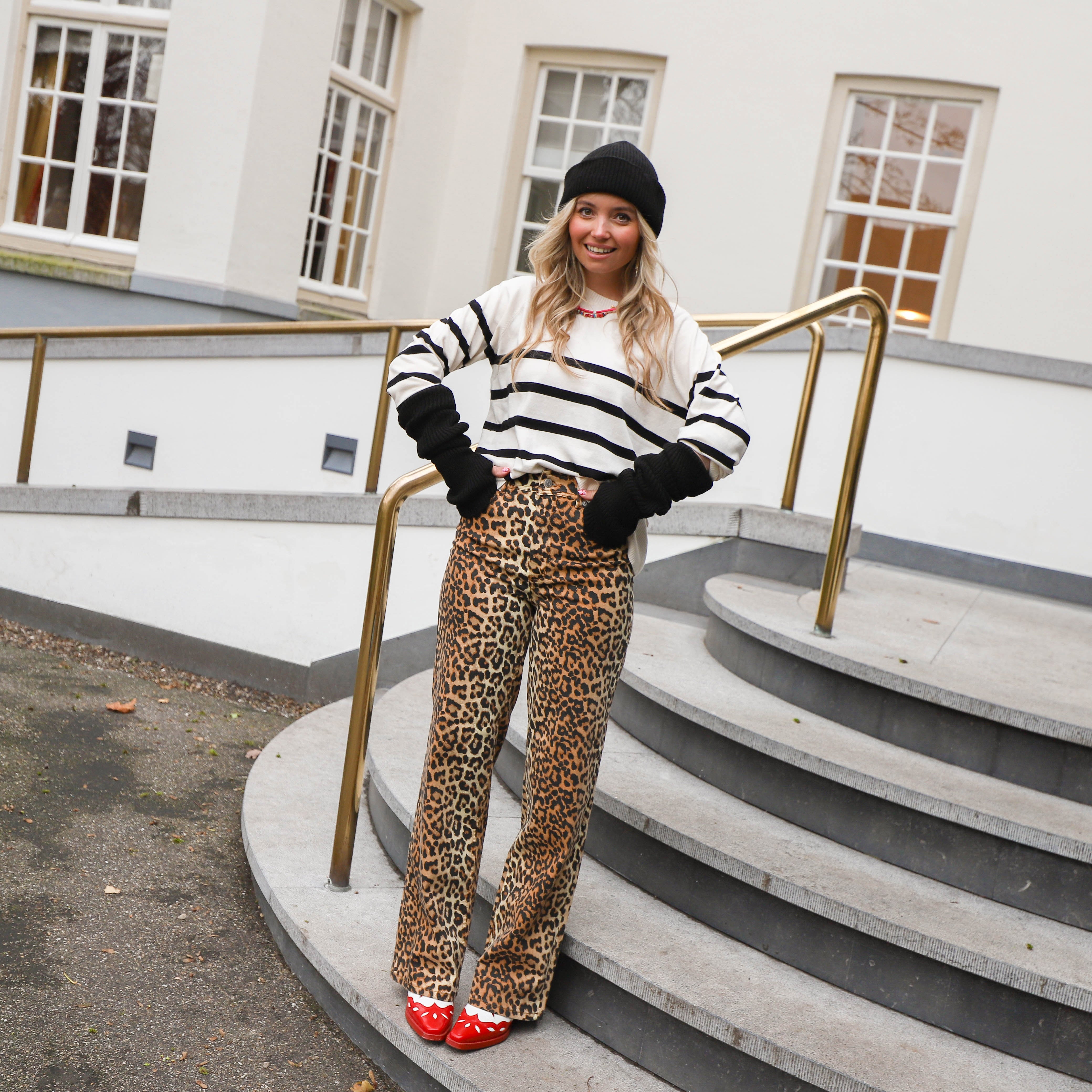 Mooie jeans met leopard print. De broek heeft een hoge taille, een wide fit en staat leuk met een blouse of trui.