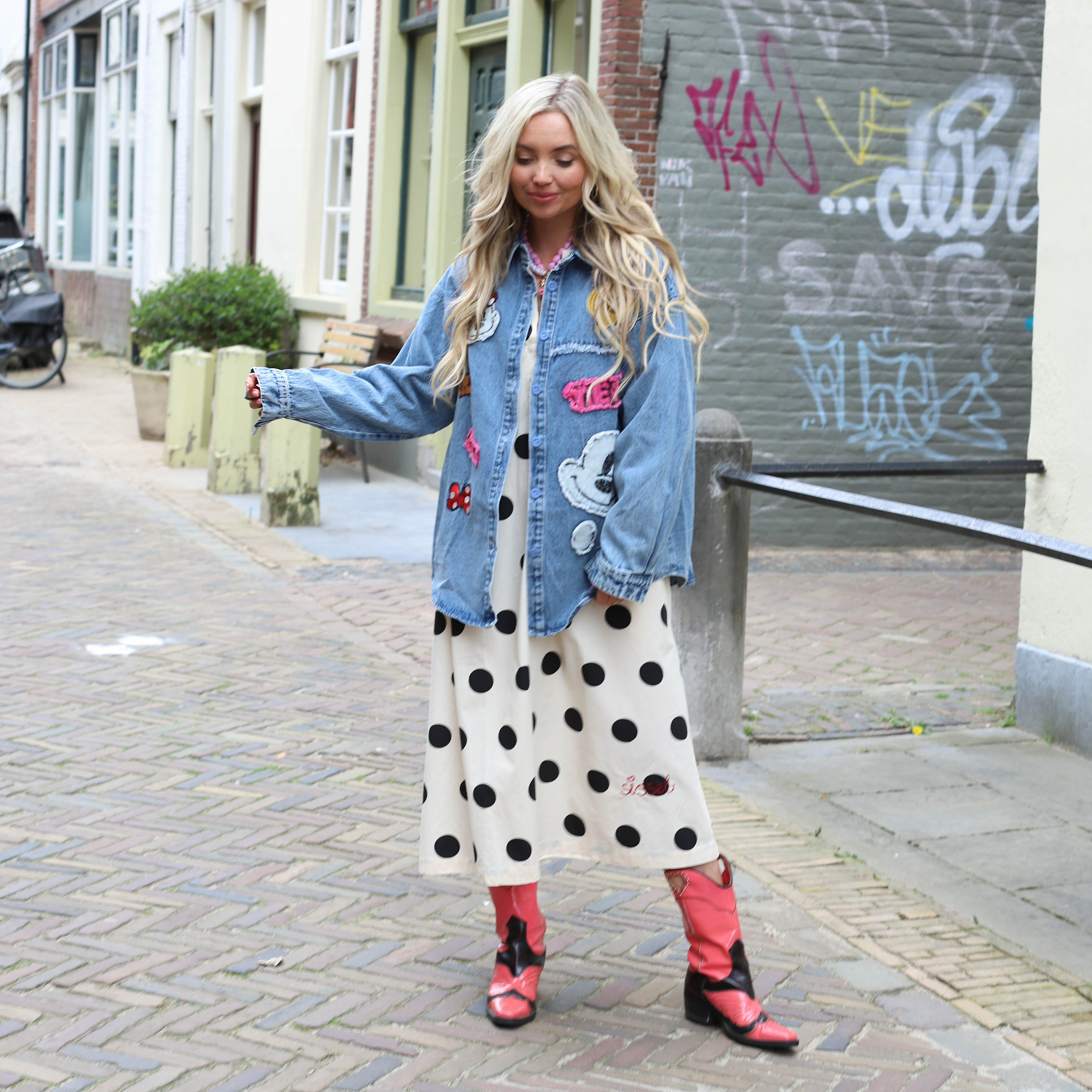 Het stevige materiaal en de rafelige details geven het item een stoere touch, terwijl de vrolijke applicaties het geheel een fashionable twist geven. Perfect te combineren met een basic broek of over een jurkje voor een eigenzinnige daily look.