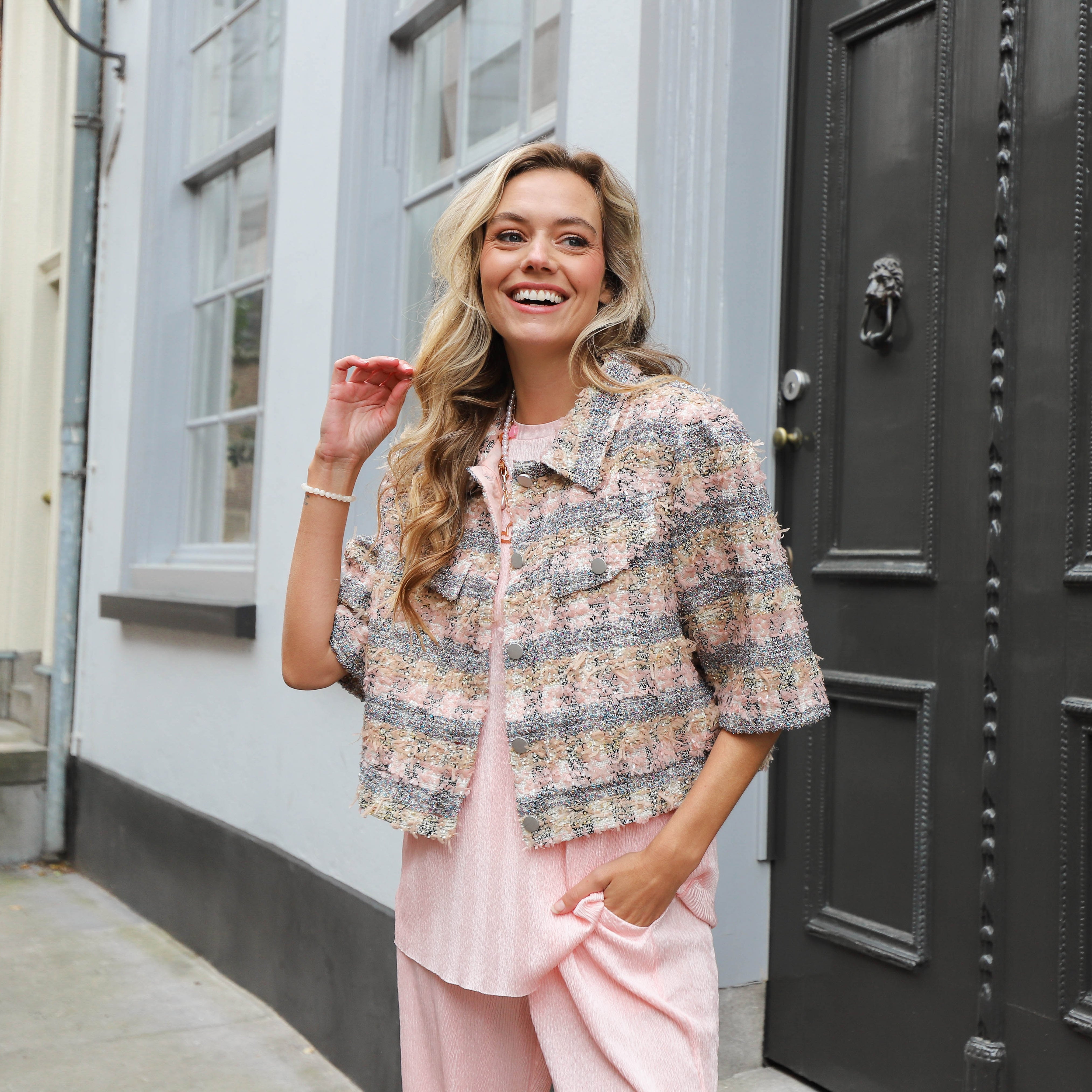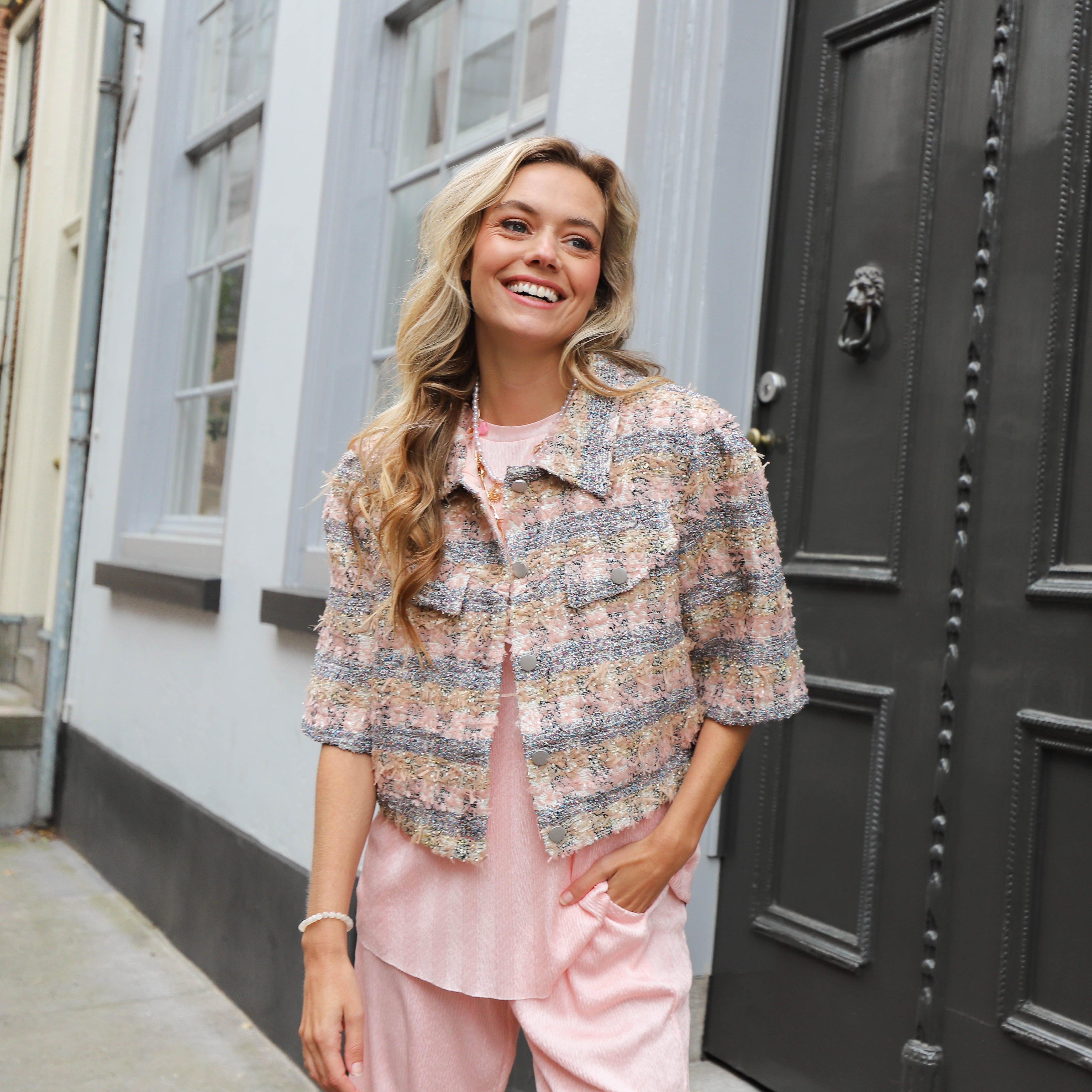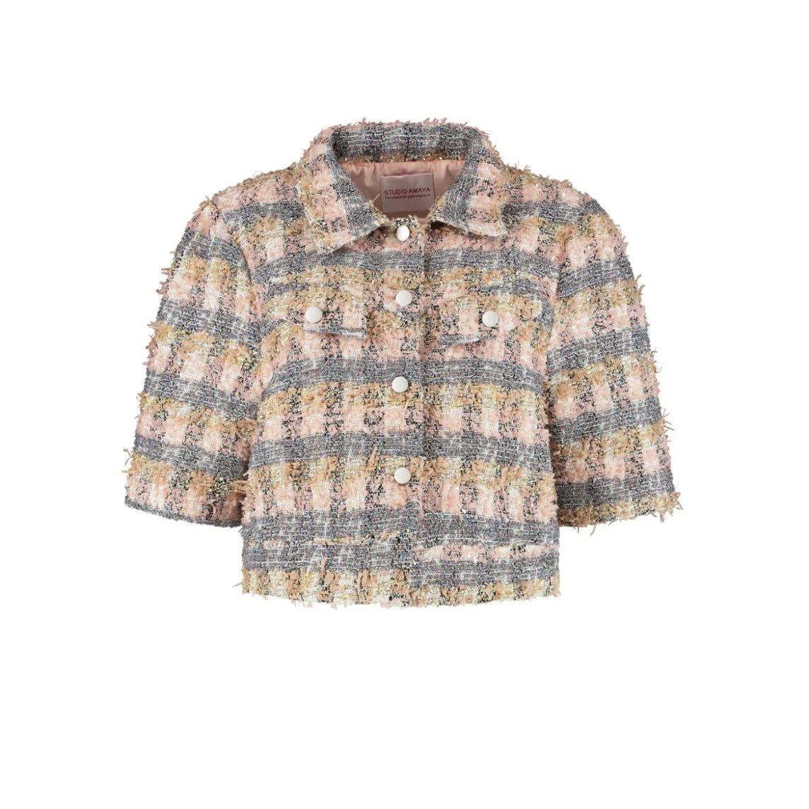 Dit stijlvolle Noor Bouclé Jacket van Studio Amaya is een elegante toevoeging aan je garderobe. Het jasje is uitgevoerd in een prachtig bouclé met verschillende texturen en subtiele glansdraadjes, wat zorgt voor een luxe uitstraling. Het cropped model en de stoere details zoals de borstzakken geven het een moderne twist. Perfect om je outfit een sophisticated en modieuze touch te geven!