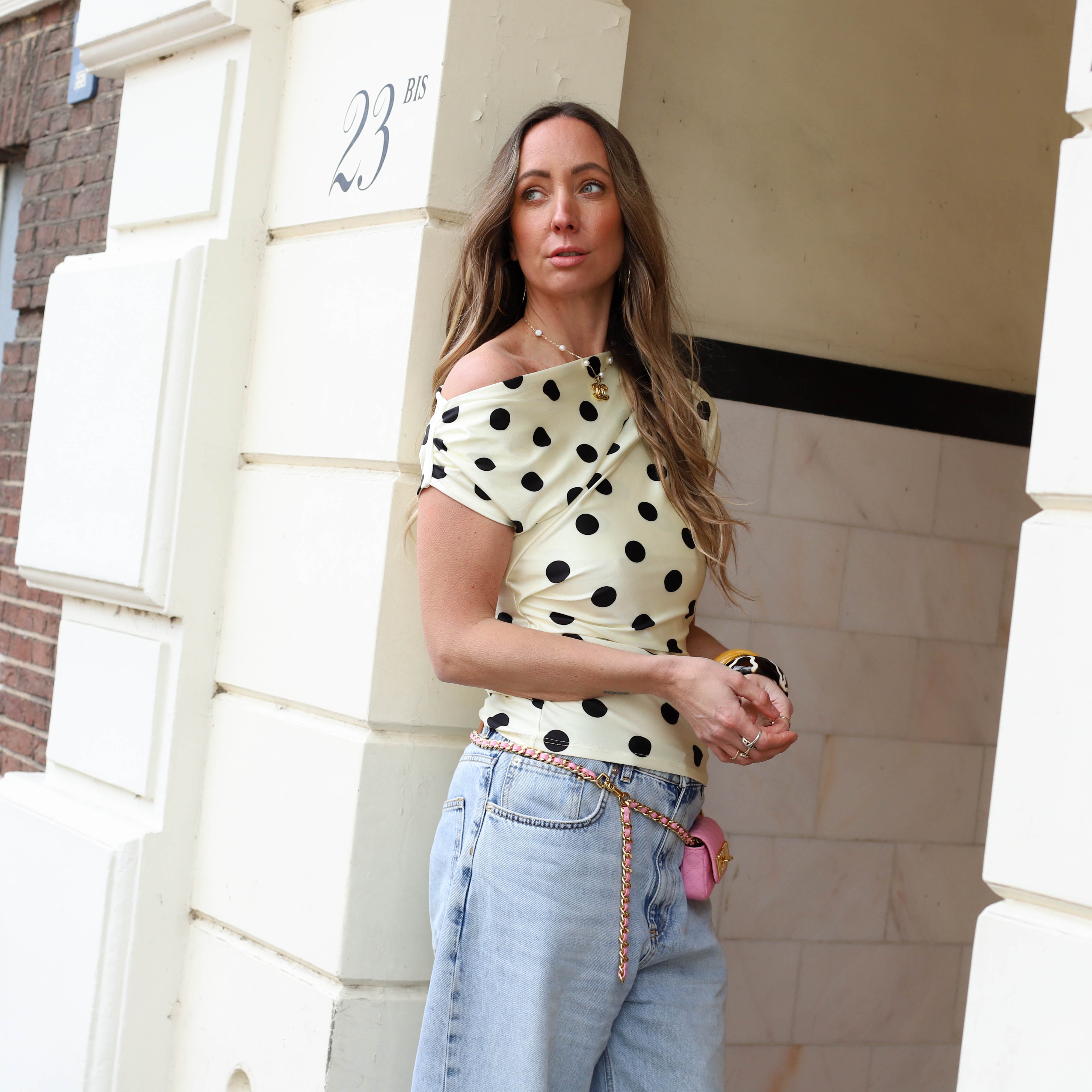 Met deze top geef je jouw outfit in één keer een stijlvolle upgrade. De frisse gele kleur met klassieke zwarte polkadots zorgt voor een tijdloze en speelse uitstraling. De gedrapeerde halslijn en subtiele rimpelingen aan de zijkant accentueren je silhouet op een mooie, vrouwelijke manier.