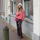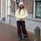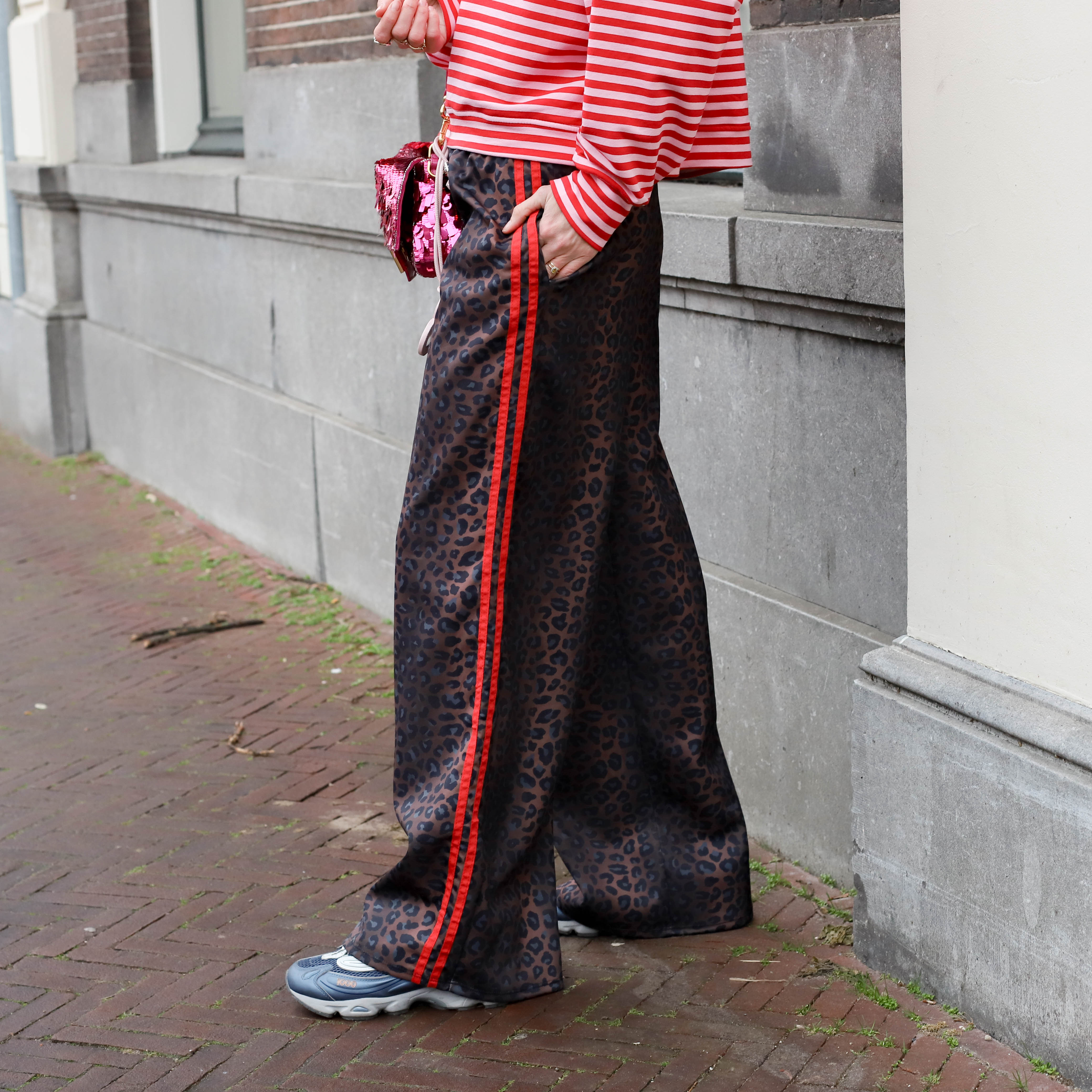 De broek heeft een comfortabele wide leg pasvorm en is voorzien van een elastische tailleband. Een opvallende rode streep langs de zijkant van de pijpen geeft de broek een sportieve touch.