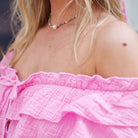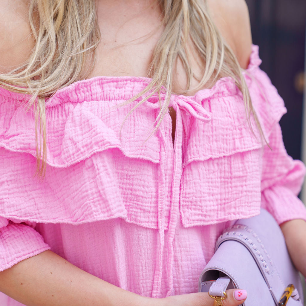 Leuk wikkeljurkje met een ruffle rand aan de bovenkant en smock details bij de mouwen. Het jurkje is te strikken. Combineer met cowboy laarsjes!