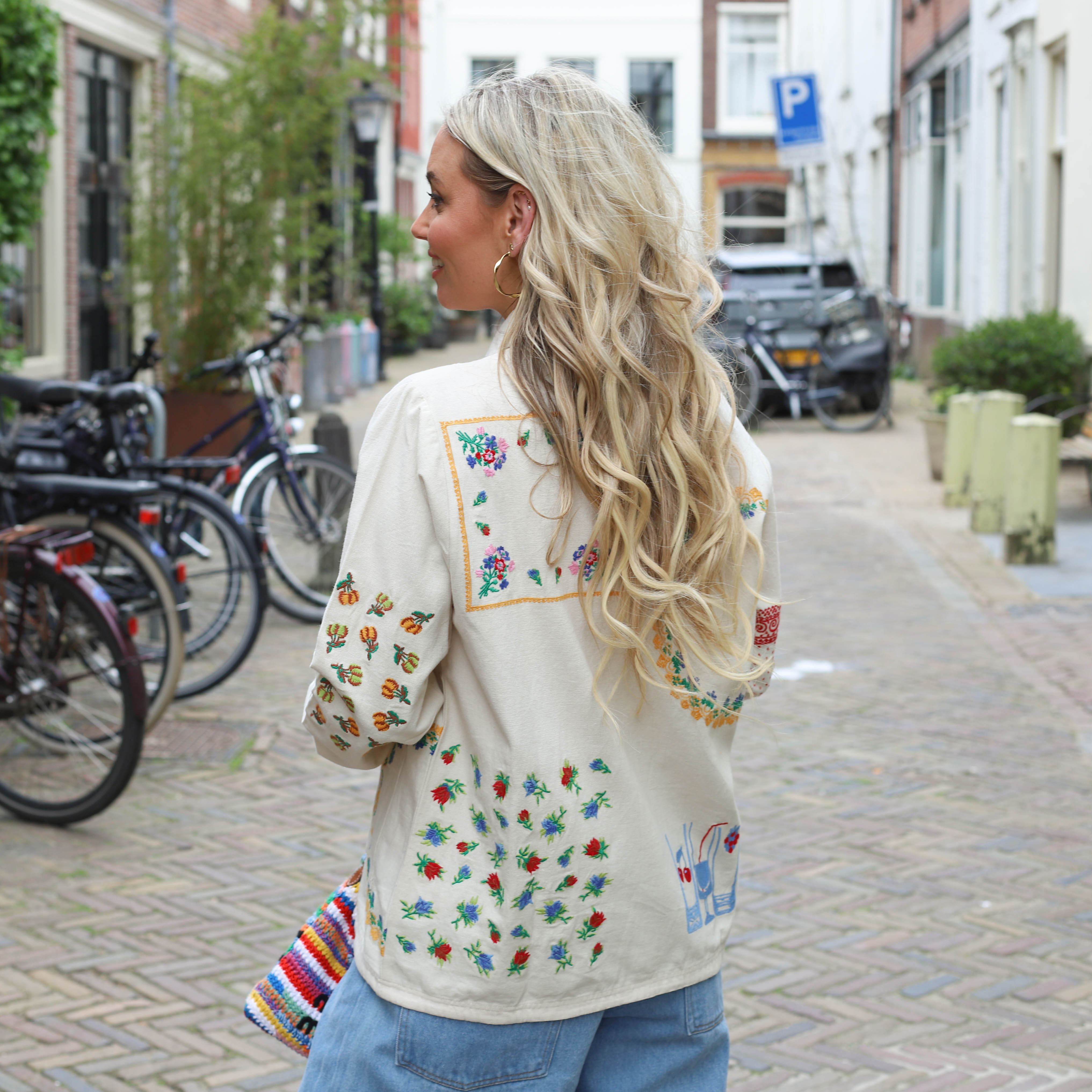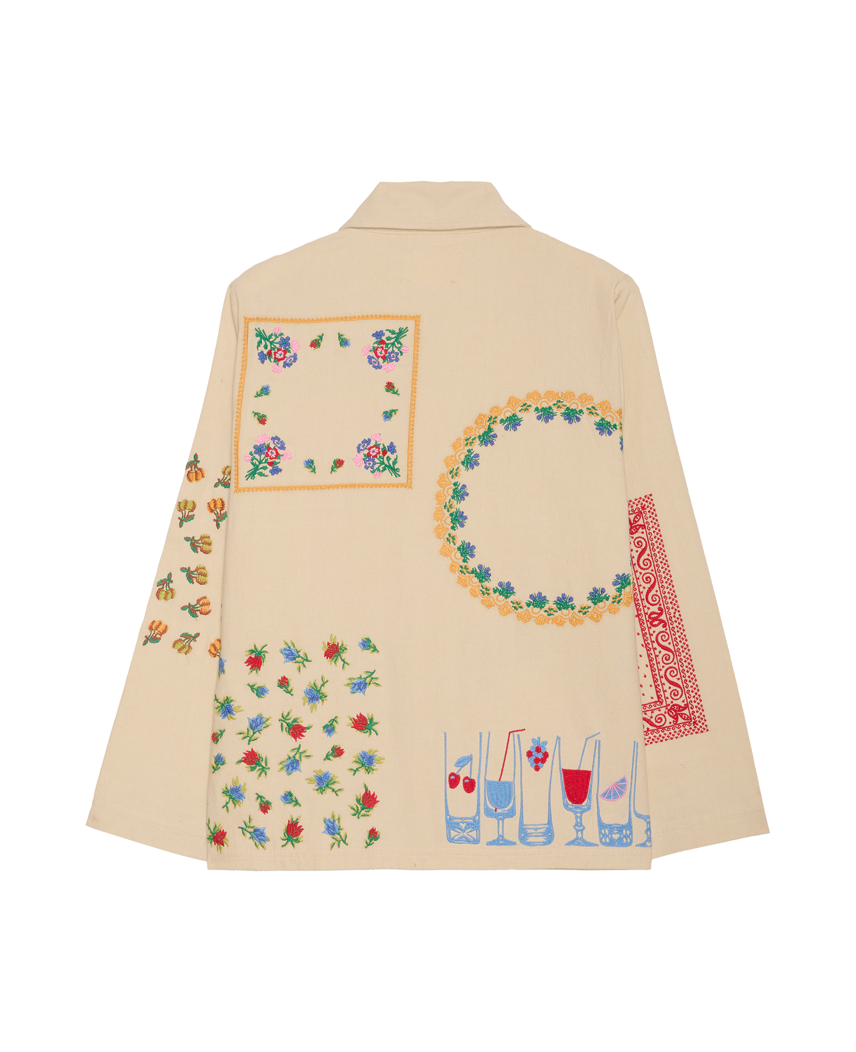 Deze jas is gemaakt van 100% biologisch katoenen canvas en heeft een casual pasvorm. De jas is voorzien van een kleine overhemdkraag en lange mouwen. Aan de voorkant zitten twee zakken en een sluiting met knoopjes in een bone-look. De jas is afgewerkt met kleurrijk en poëtisch borduurwerk, geïnspireerd op vintage servetten.
